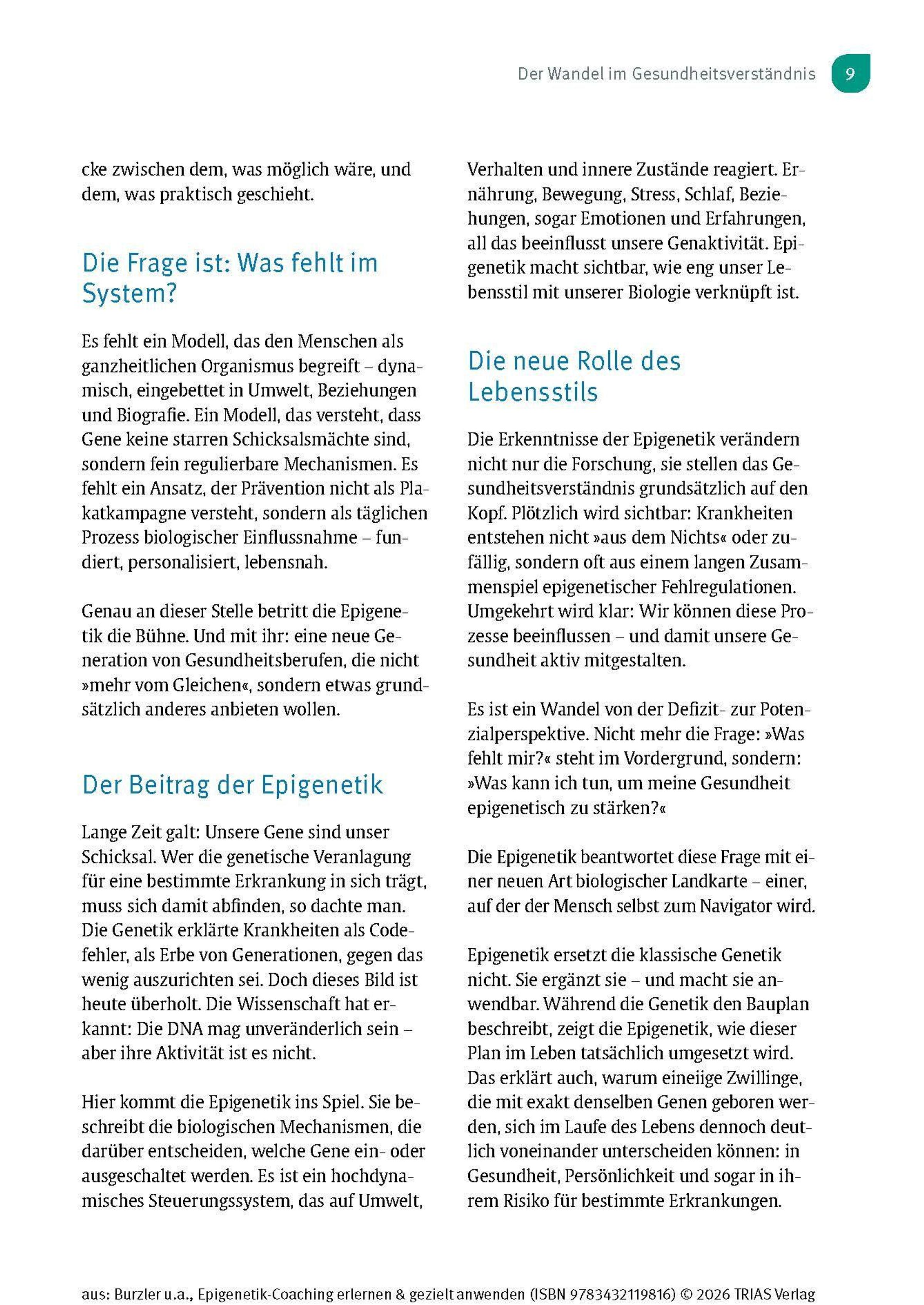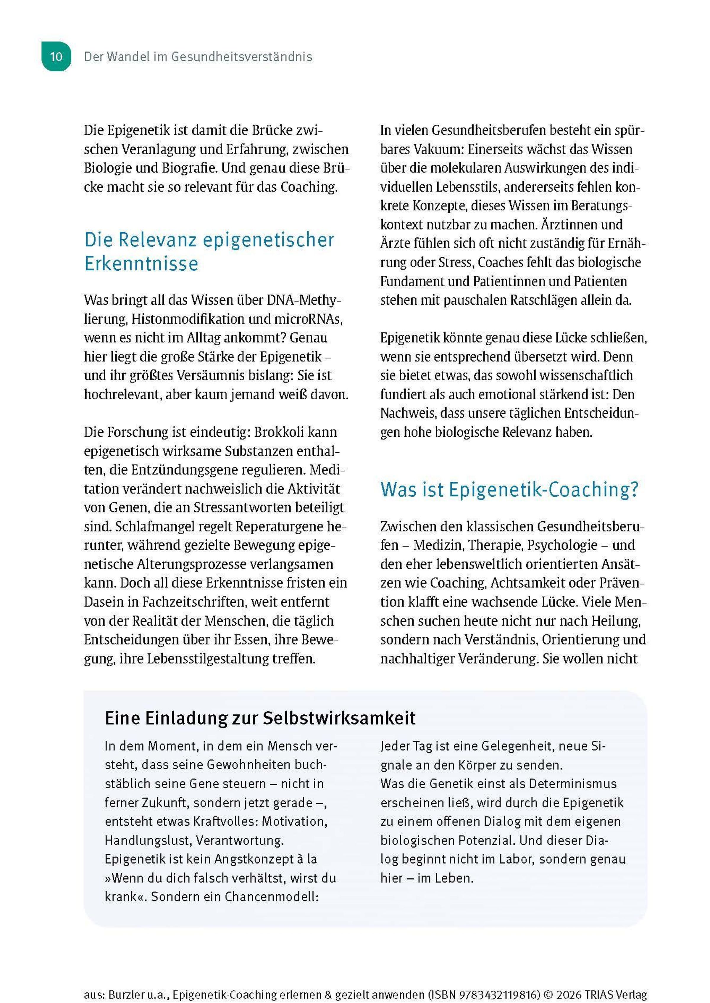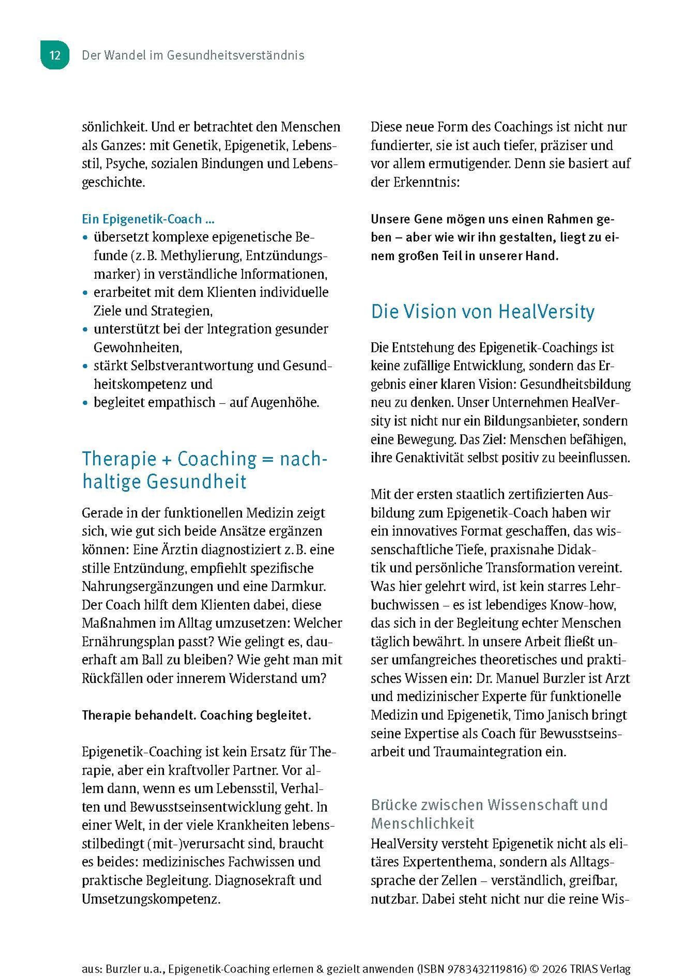 Die Epigenetik verändert unser Verständnis von Gesundheit grundlegend. Sie zeigt, dass Gene nicht unser Schicksal sind - sondern dynamisch auf Umwelt, Lebensstil und den Umgang mit unseren gemachten Erfahrungen reagieren. Dieses Handbuch von den Pionieren des Epigenetik-Coachings - Dr. Manuel Burzler und Timo Janisch - ist die Grundlage, um sich epigenetisches Wissen anzueignen und gezielt anzuwenden. Für alle Interessierten, als Begleiter durch die Epigenetik-Ausbildung oder für Therapeuten in der Praxis.