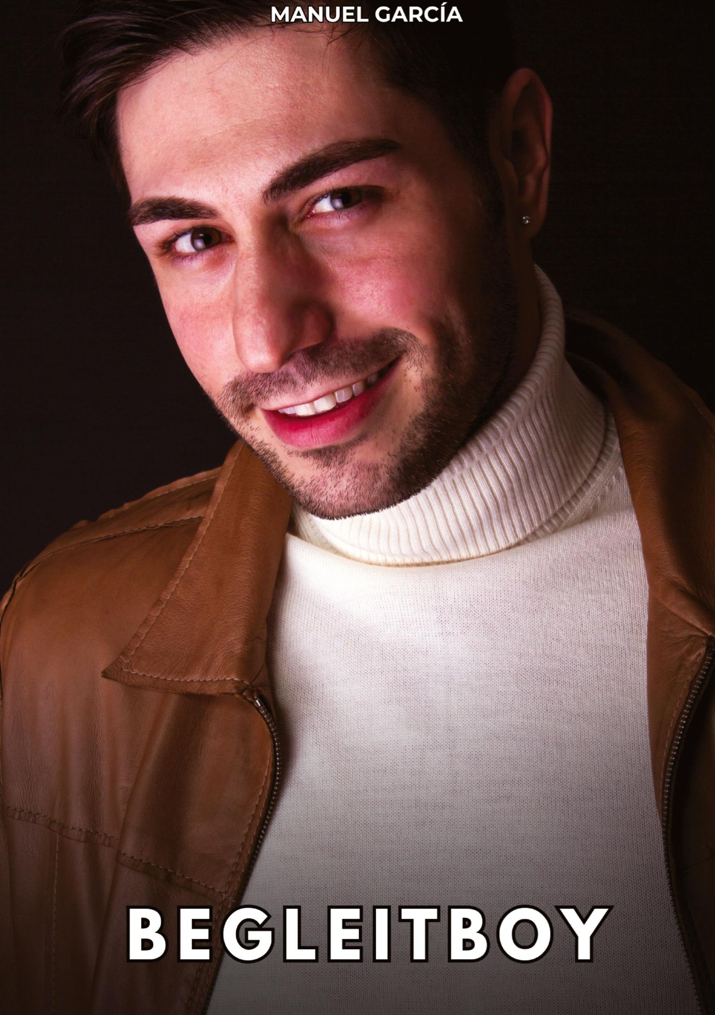 Text oben: "MANUEL GARCÍA". Text unten: "BEGLEITBOY". Mann lächelt, trägt Rollkragenpullover und braune Jacke., Buch