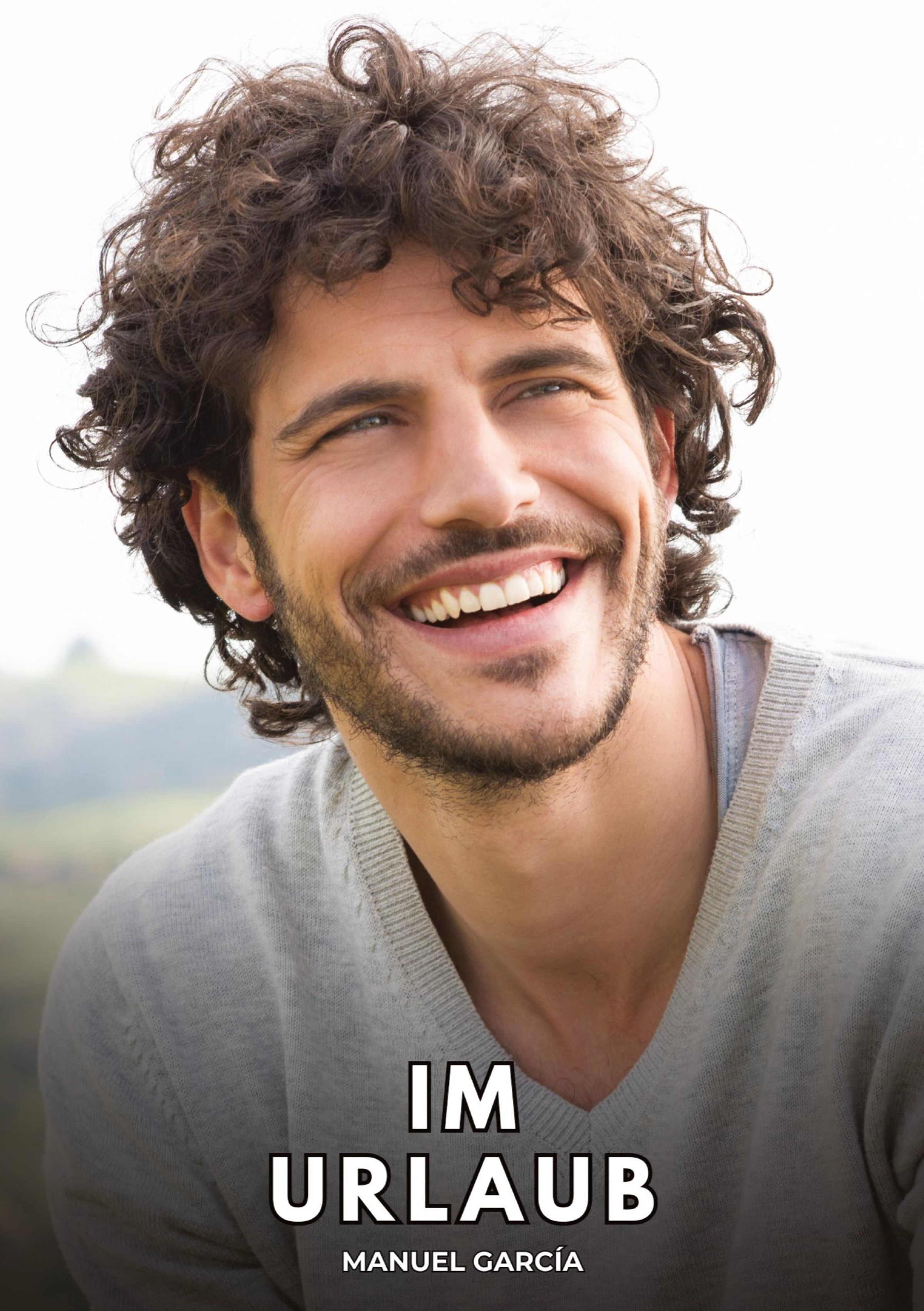 "IM URLAUB MANUEL GARCÍA." Ein lächelnder Mann mit lockigem Haar und Bart, trägt einen Pullover vor unscharfem Hintergrund., Buch
