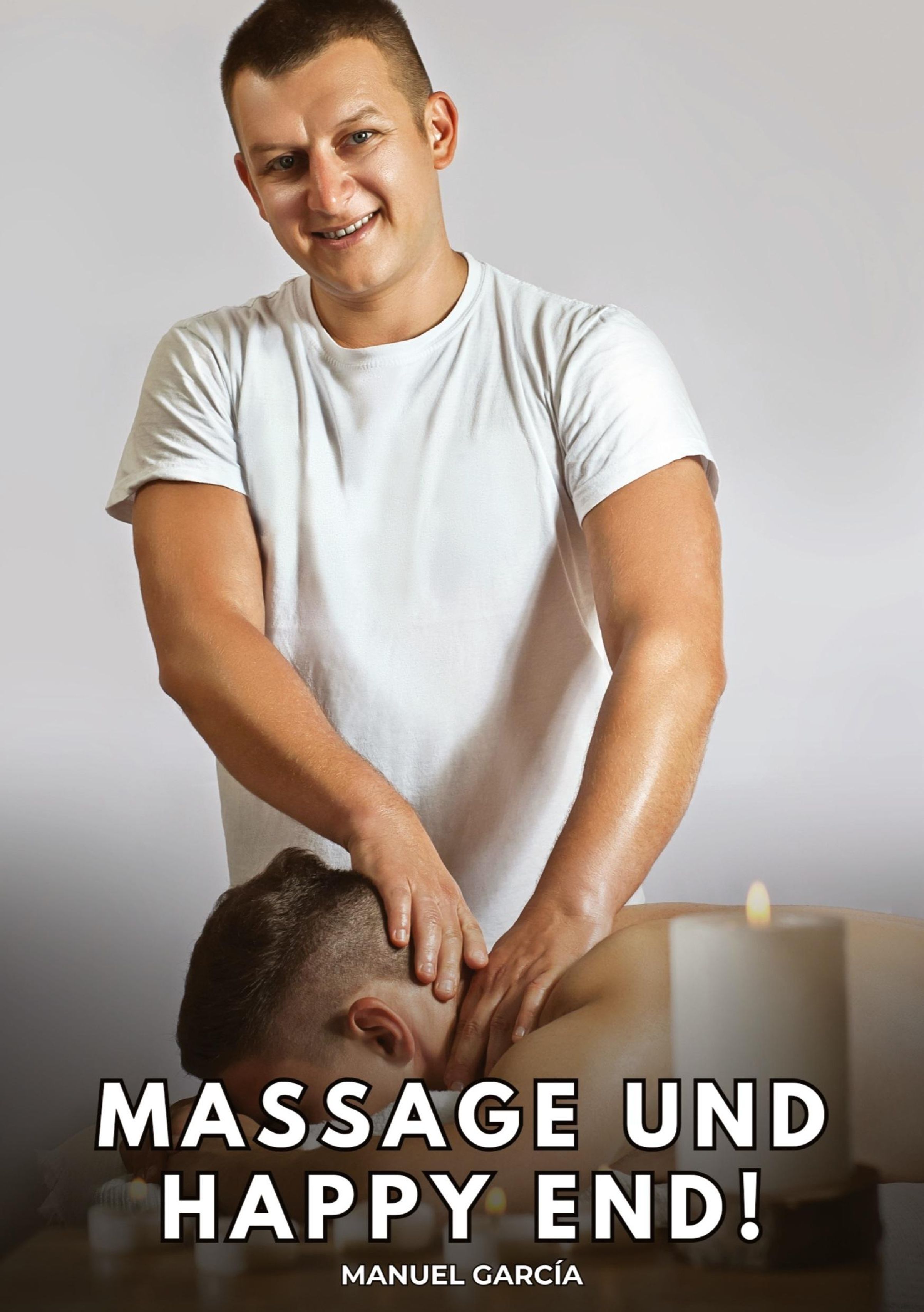 Text: "MASSAGE UND HAPPY END! MANUEL GARCÍA." Ein Mann in Weiß massiert einen anderen. Kerzen im Vordergrund., Buch