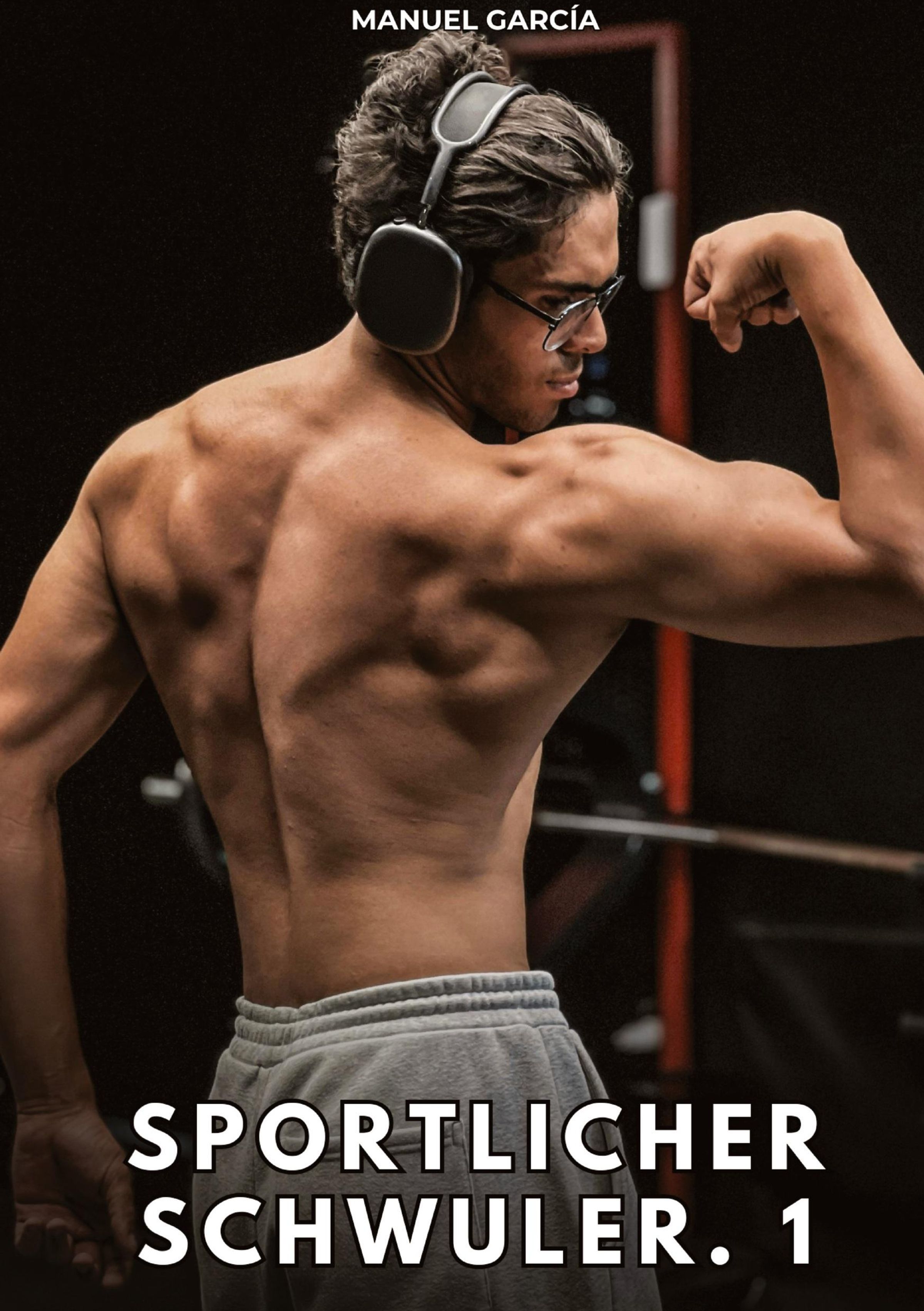 „Sportlicher Schwuler. 1“, „Manuel García“. Ein muskulöser Mann mit Kopfhörern und Brille zeigt seine Rücken- und Armmuskeln., Buch
