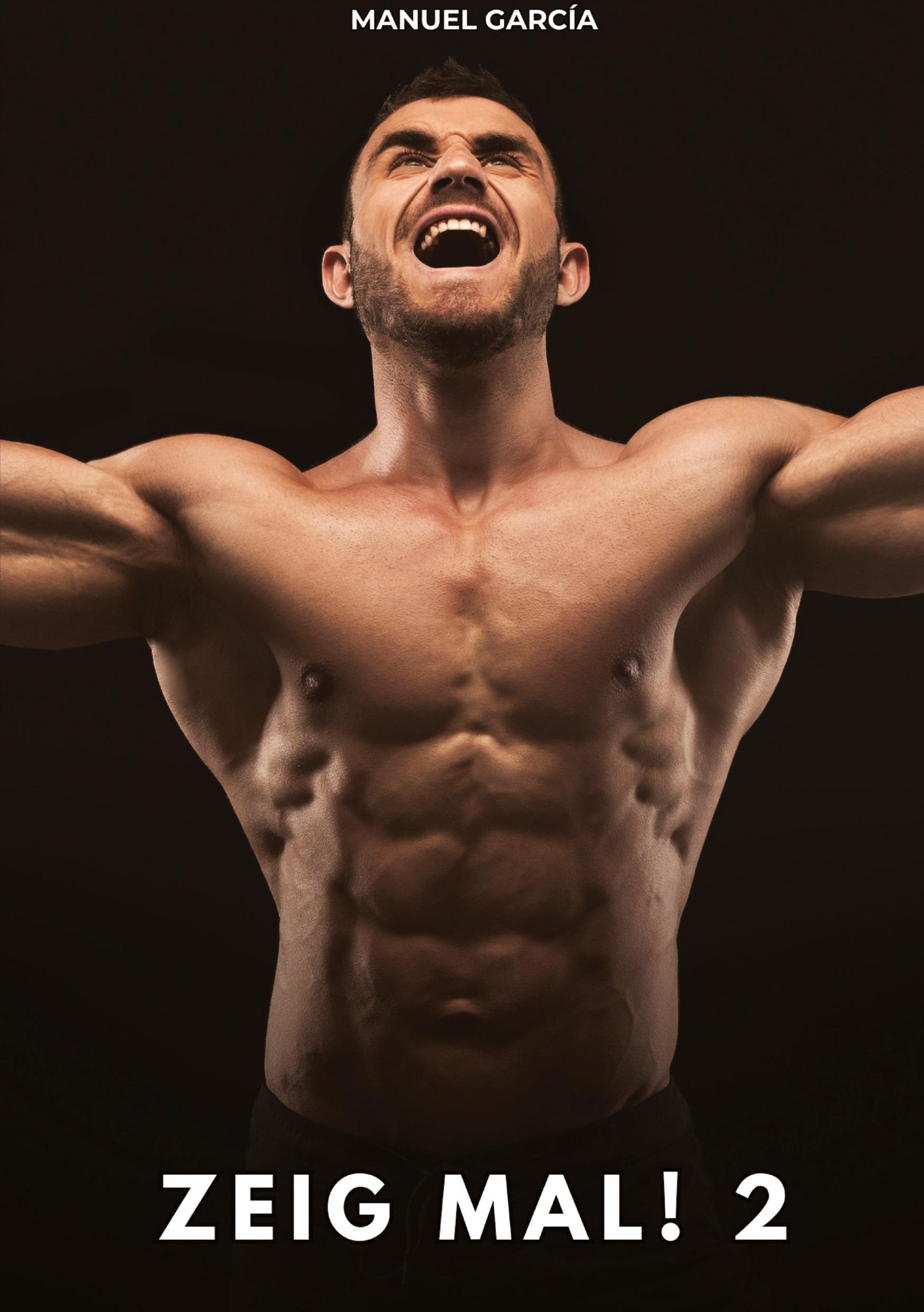 MANUEL GARCÍA oben, ZEIG MAL! 2 unten. Muskelbepackter Mann mit ausgestreckten Armen und offenem Mund vor dunklem Hintergrund., Buch