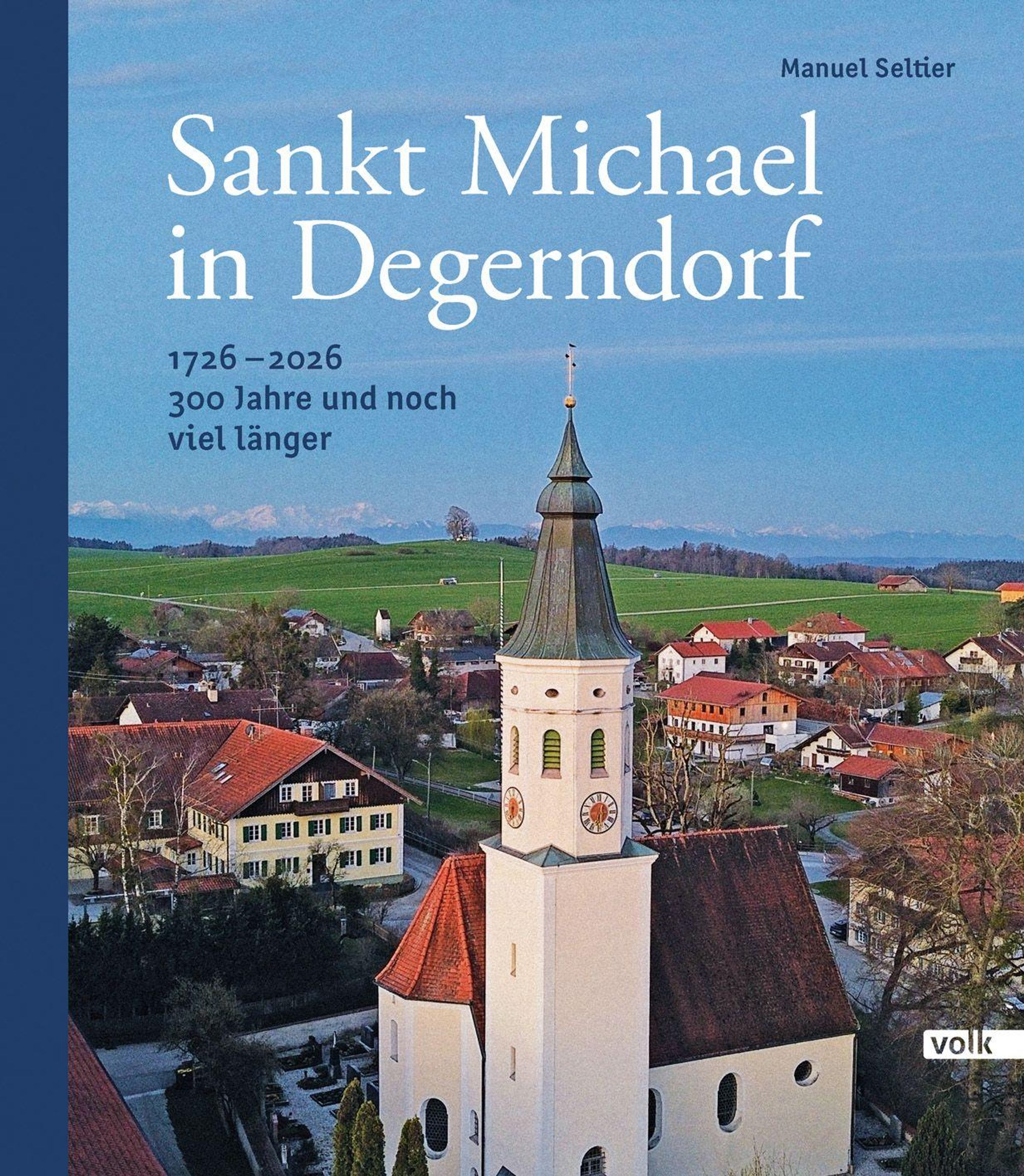 "Sankt Michael in Degerndorf. 1726–2026, 300 Jahre und noch viel länger." Turm einer Kirche im Dorf, grüne Hügel im Hintergrund., Buch