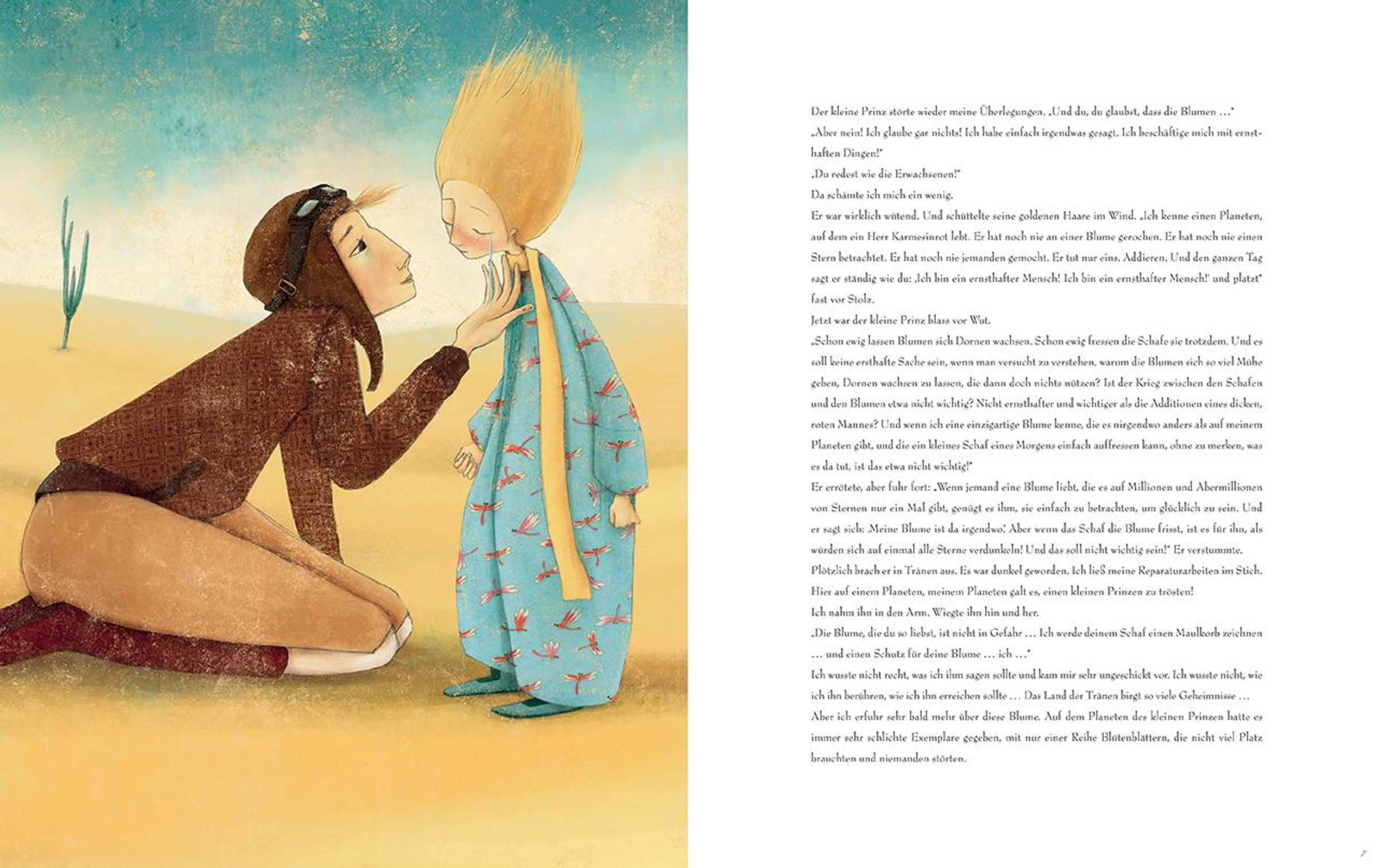 Er fegt drei Vulkane, reißt die Schösslinge der Affenbrotbäume aus, pflegt eine Rose und trifft auf anderen Planeten allerlei merkwürdige Leute: Der kleine Prinz und seine Geschichte fesselt Menschen aller Altersgruppen. In ihrer Neufassung transportiert Manuela Adreani Antoine de Saint-Exupérys Ideen von Freundschaft, Menschlichkeit und Abschied in poetisch-modernen Illustrationen. Lassen Sie beim Betrachten ruhig ein wenig die Seele baumeln.