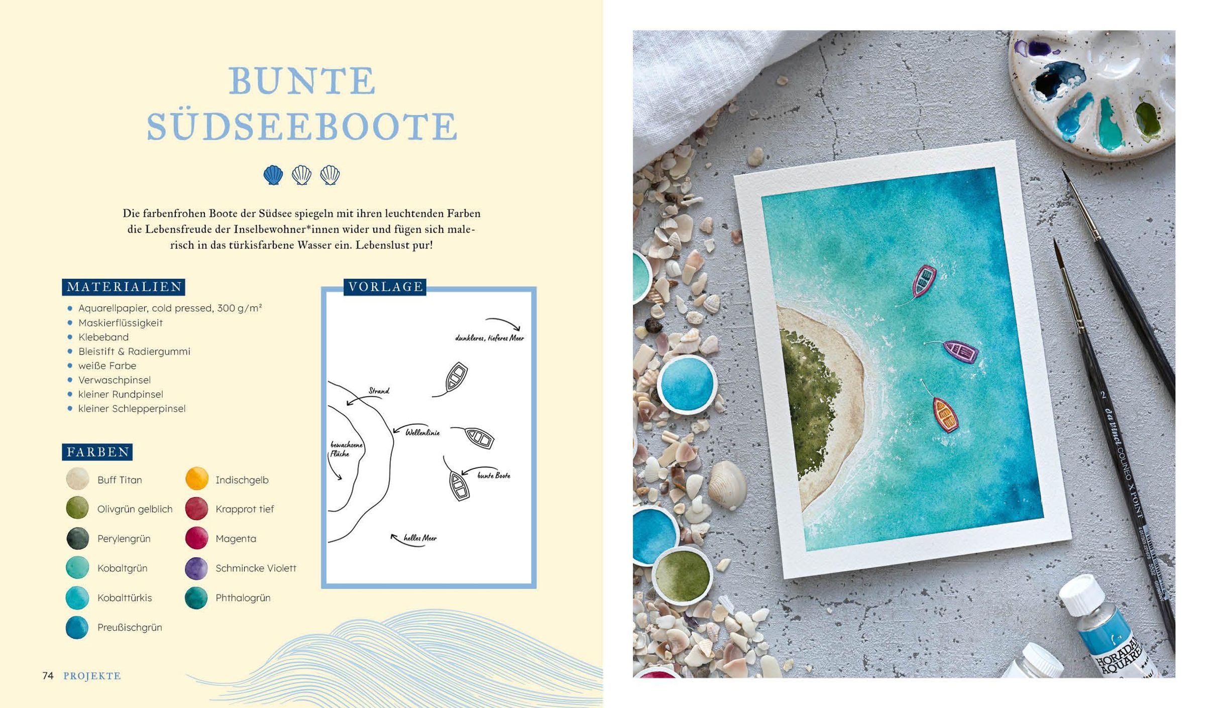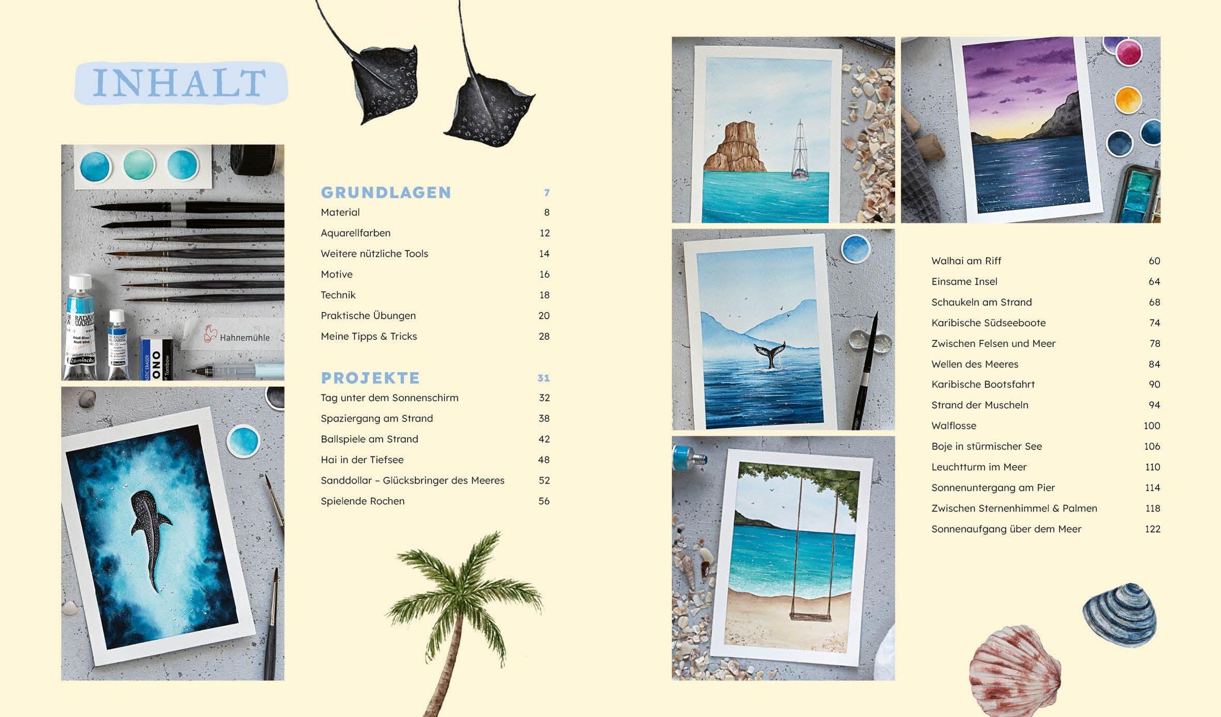 Dieses Watercolor-Anleitungsbuch zeigt dir Schritt für Schritt , wie du 20 verschiedene Motive rund ums Thema Meer malst. Mit hilfreichen Tipps und einfachen Techniken zeigt die Autorin, wie leicht das Malen von Gewässern gelingen kann - und nimmt dich mit auf eine kreative Reise zu sonnigen Stränden, verspielten Meerszenen mit Wasserball bis hin zu geheimnisvollen Unterwasserwelten voller Rochen und anderer Meeresbewohner . Ein Grundlagenteil klärt zudem alle wichtigen Fragen und gibt dir das nötige Know-How, um die Motive selbst umzusetzen - perfekt für Anfänger*innen , aber auchFortgeschrittene, die etwas dazu lernen wollen - locker, leichtes Sommerfeeling all inclusive!