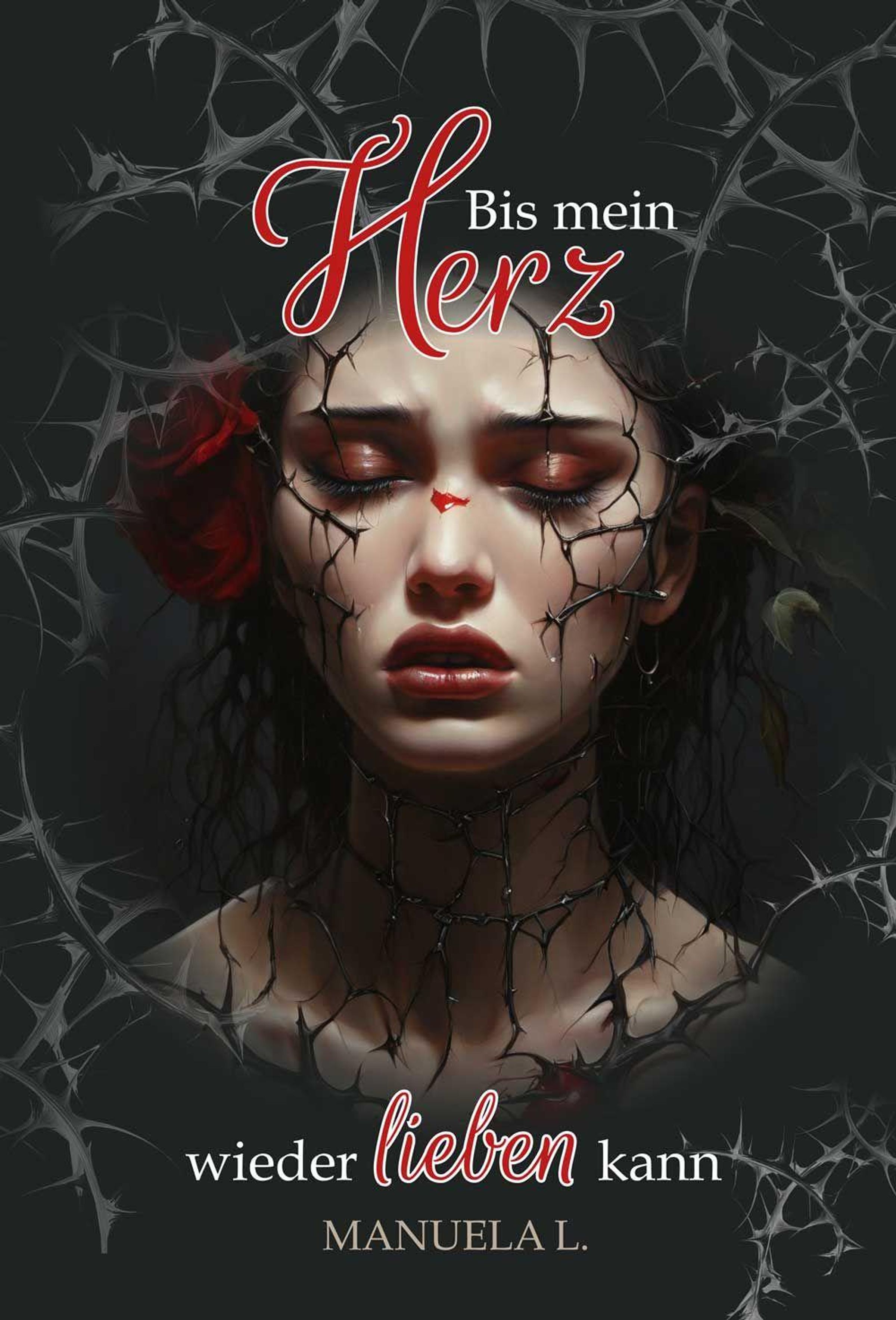 Text: "Bis mein Herz wieder lieben kann, MANUELA L." Illustration: Frau mit geschlossenen Augen, von Dornen umgeben., Buch