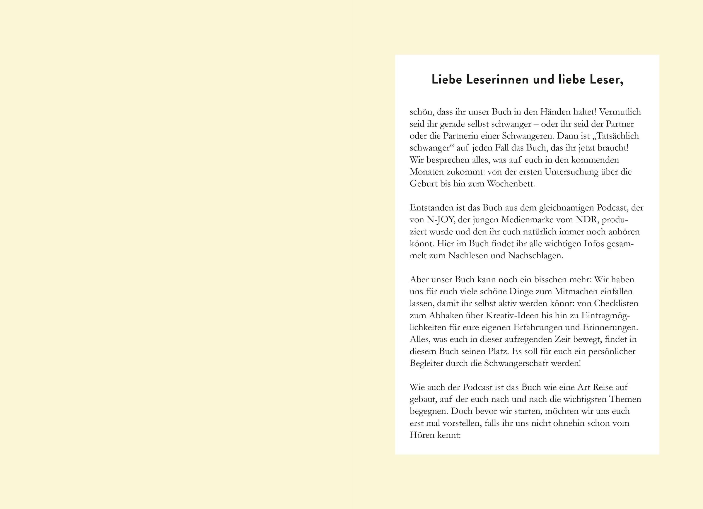 Der Schwangerschaftstest ist positiv - und jetzt? Im NDR-Podcast "Tatsächlich schwanger" beantwortet Dr. Manuela Tavares, Gynäkologin und Oberärztin am Universitätsklinikum Hamburg-Eppendorf, alle wichtigen Fragen rund um die Themen Schwangerschaft, Geburt und die erste Zeit mit Baby. An ihrer Seite: Die beiden Podcaster Lucie Kluth und Tim Winterscheid. Sie sind selbst Eltern und berichten aus ihrer Sicht über diese spannende Zeit des Lebens, damit andere (werdende) Mamas und Papas von ihrem Erfahrungsschatz profitieren können. Das Buch versammelt alle notwendigen Infos zum Nachlesen im handlichen Taschenbuchformat. Eintragmöglichkeiten für persönliche Notizen runden diesen liebevollen Ratgeber ab.