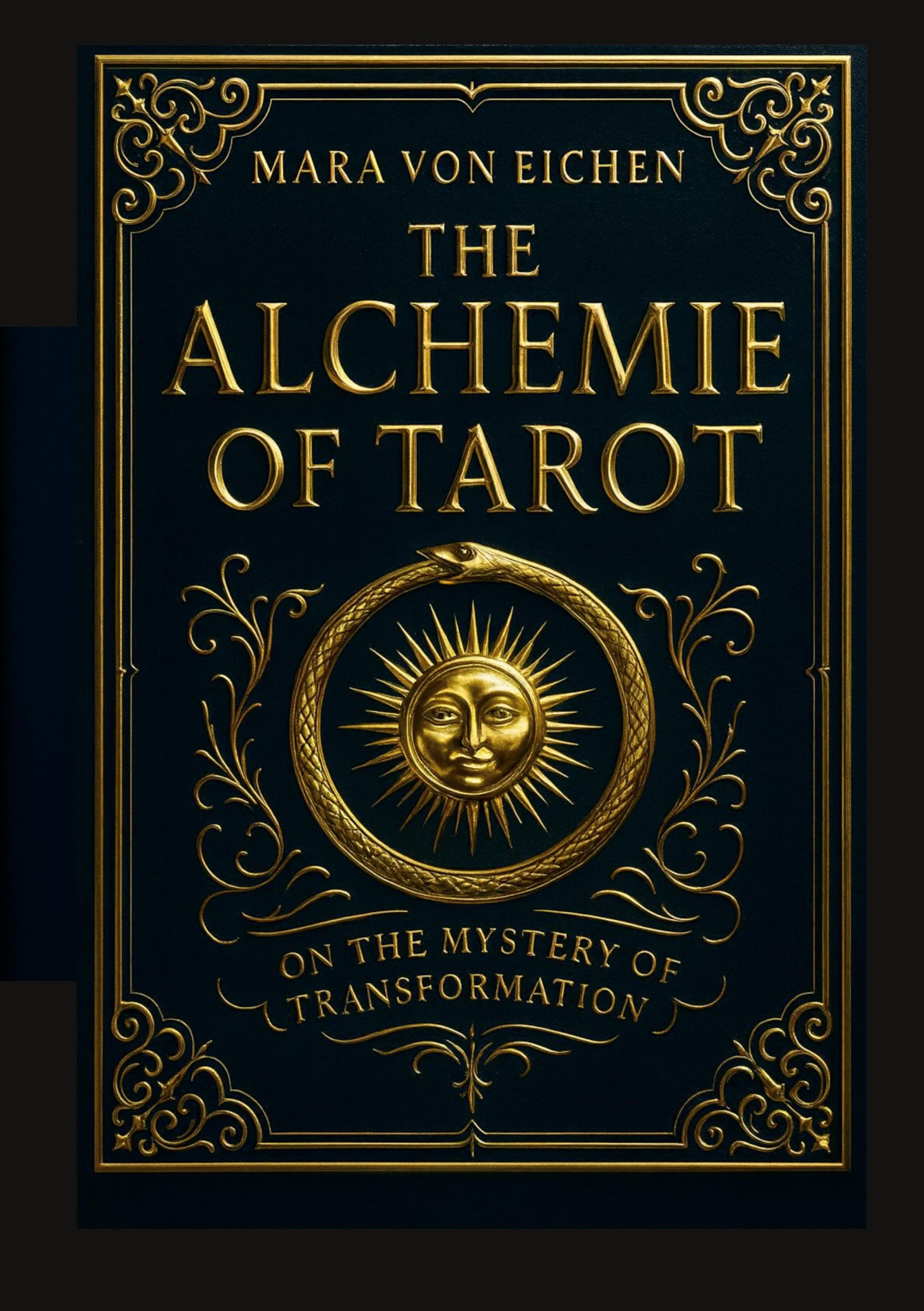 "MARA VON EICHEN", "THE ALCHEMIE OF TAROT", "ON THE MYSTERY OF TRANSFORMATION". Goldene Ornamente, Sonne und Schlange., Buch