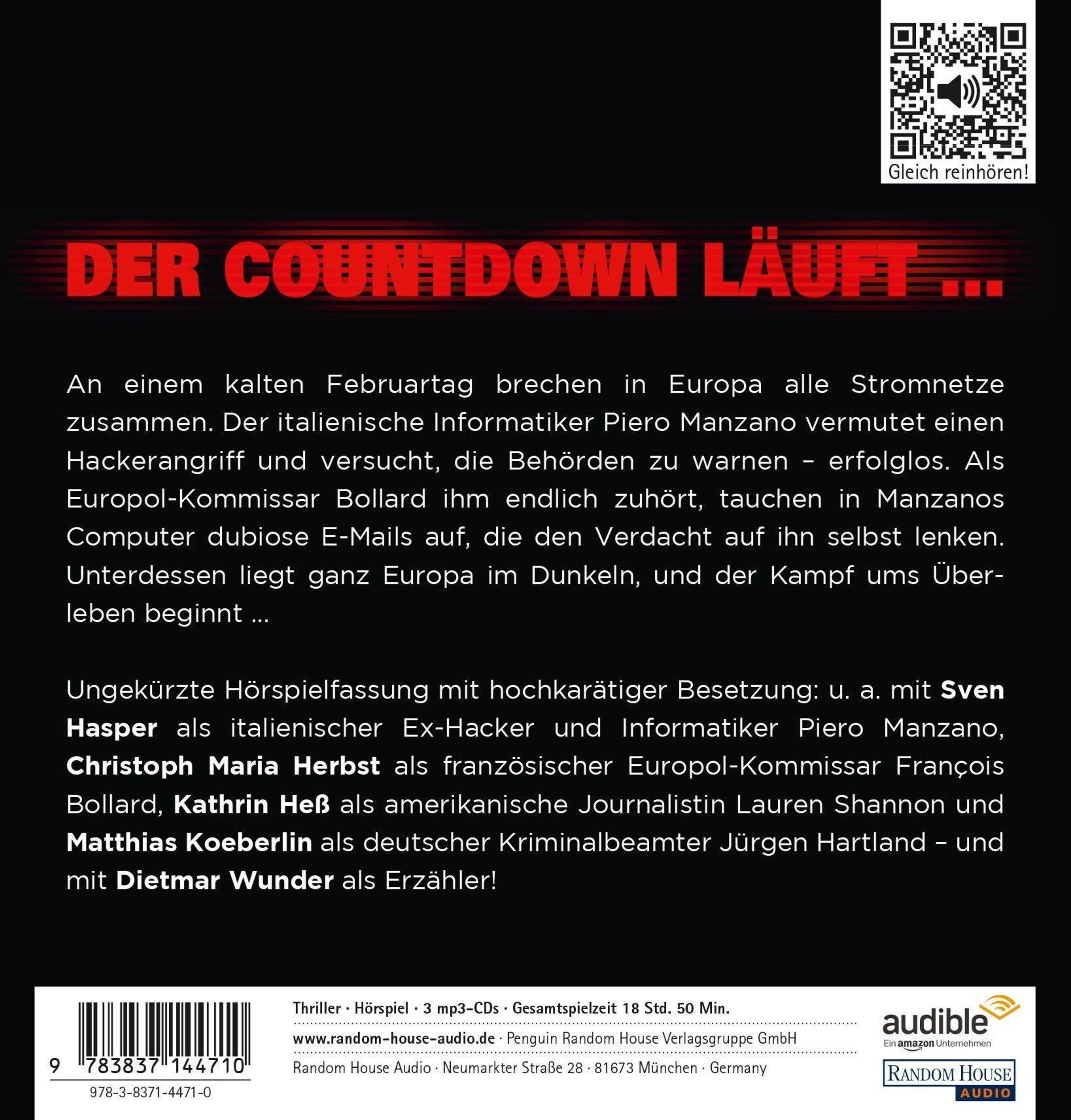 Ungekürzte Hörspielfassung mit hochkarätiger Sprecherbesetzung: u. a. mit Sven Hasper als italienischem Ex-Hacker und Informatiker Piero Manzano, Christoph Maria Herbst als französischem Europol-Kommissar François Bollard, Kathrin Heß als amerikanischer Journalistin Lauren Shannon und Matthias Koeberlin als deutschem Kriminalbeamter Jürgen Hartland - und mit Dietmar Wunder als Erzähler!