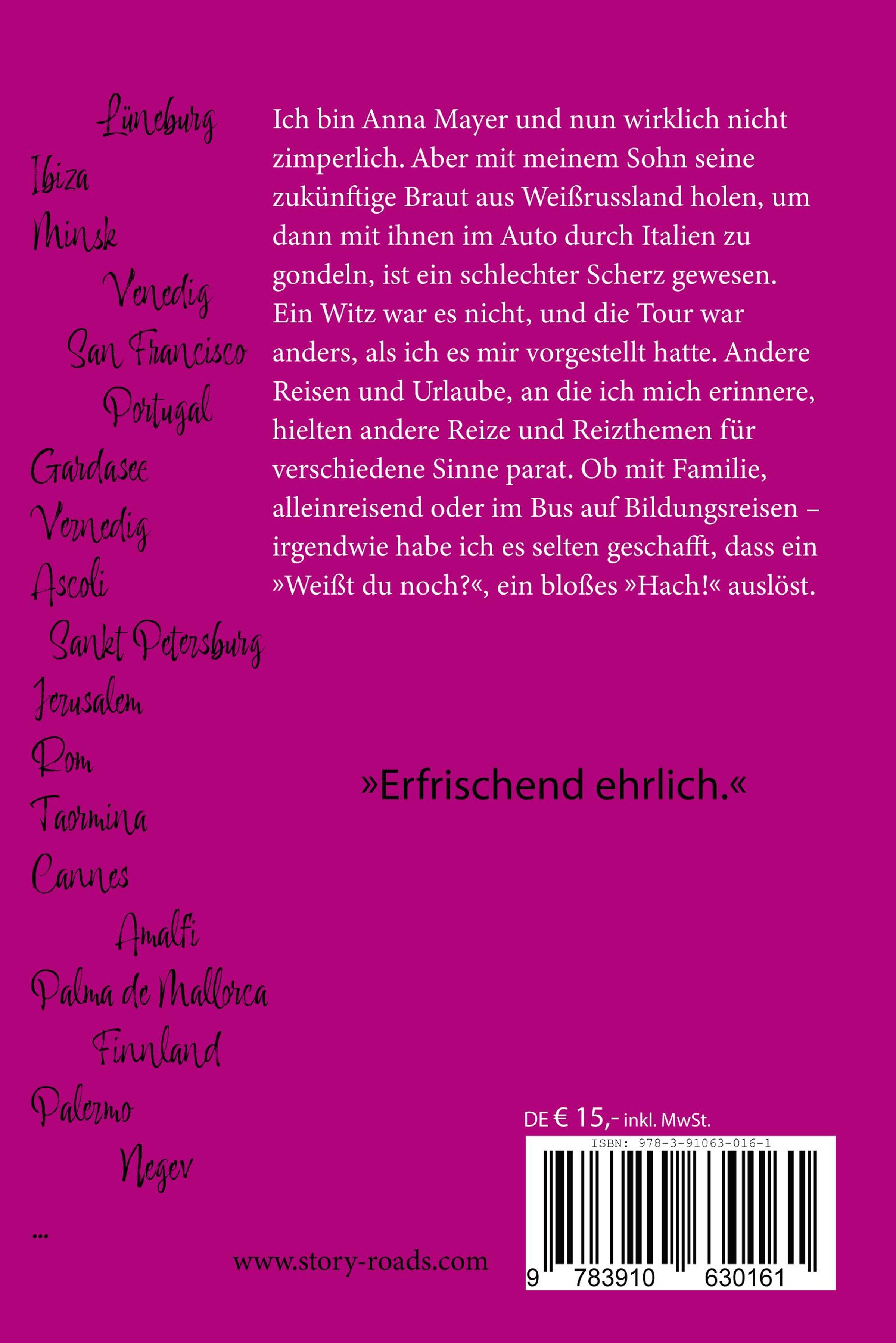 Ich bin Anna Mayer und nun wirklich nicht zimperlich. Aber mit meinem Sohn seine zukünftige Braut aus Weißrussland holen, um dann mit ihnen im Auto durch Italien zu gondeln, ist ein schlechter Scherz gewesen. Ein Witz war es nicht, und die Tour war anders, als ich es mir vorgestellt hatte. Andere Reisen und Urlaube, an die ich mich erinnere, hielten andere Reize und Reizthemen für verschiedene Sinne parat. Ob mit Familie, alleinreisend oder im Bus auf Bildungsreisen - irgendwie habe ich es selten geschafft, dass ein 'Weißt du noch?', ein bloßes 'Hach!' auslöst.