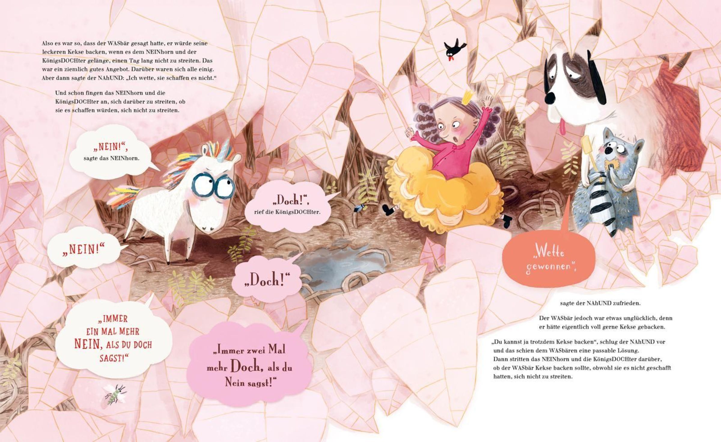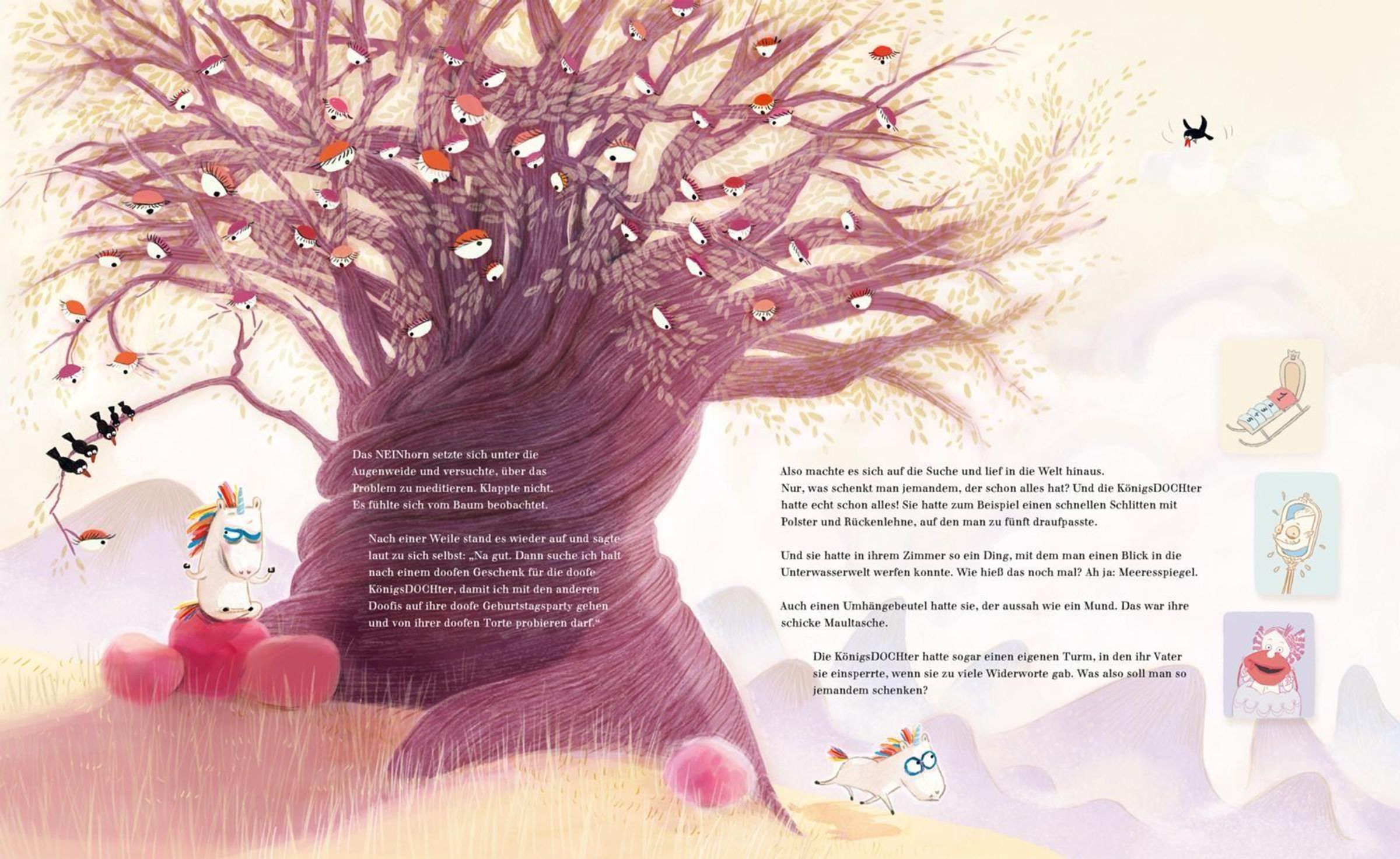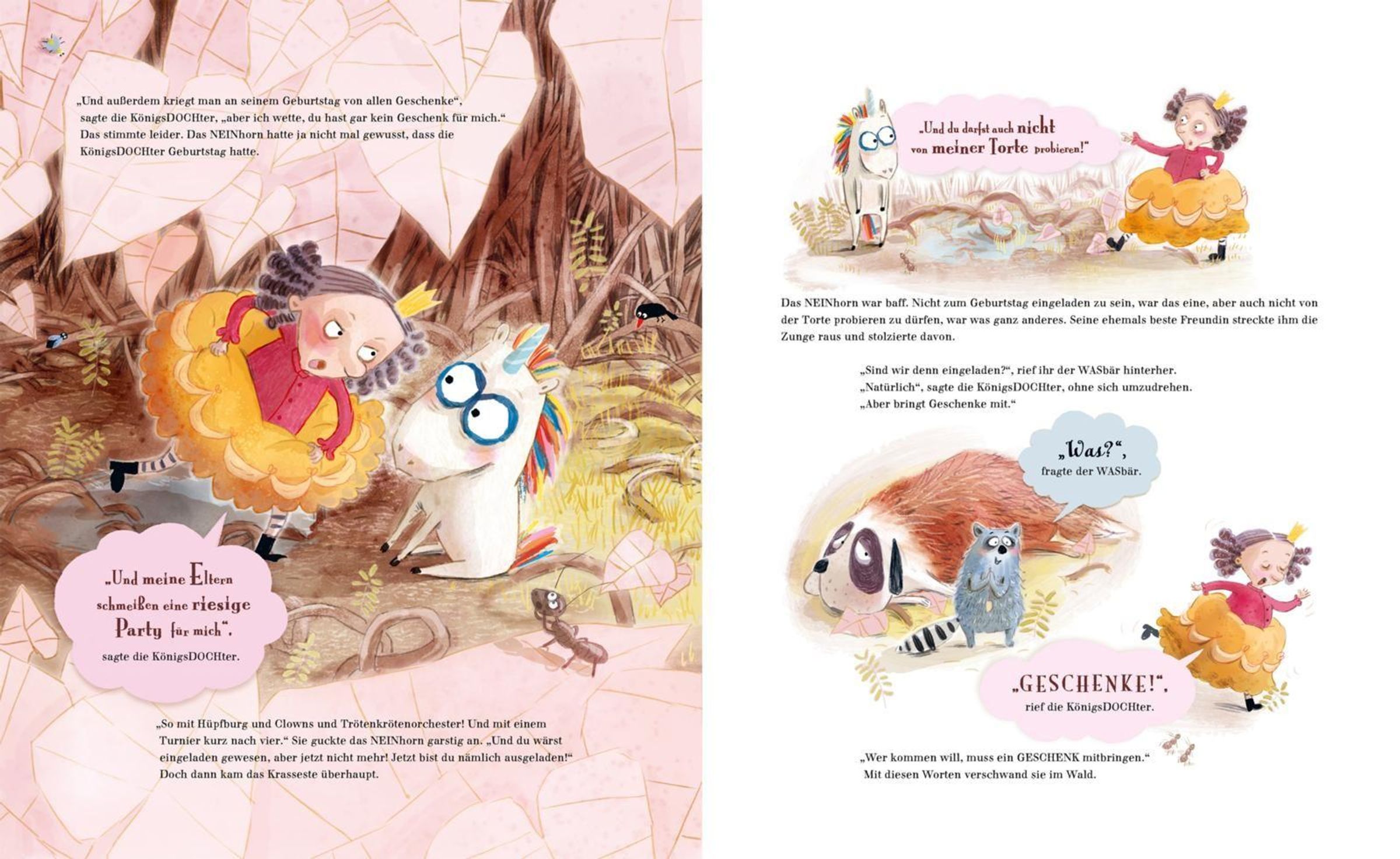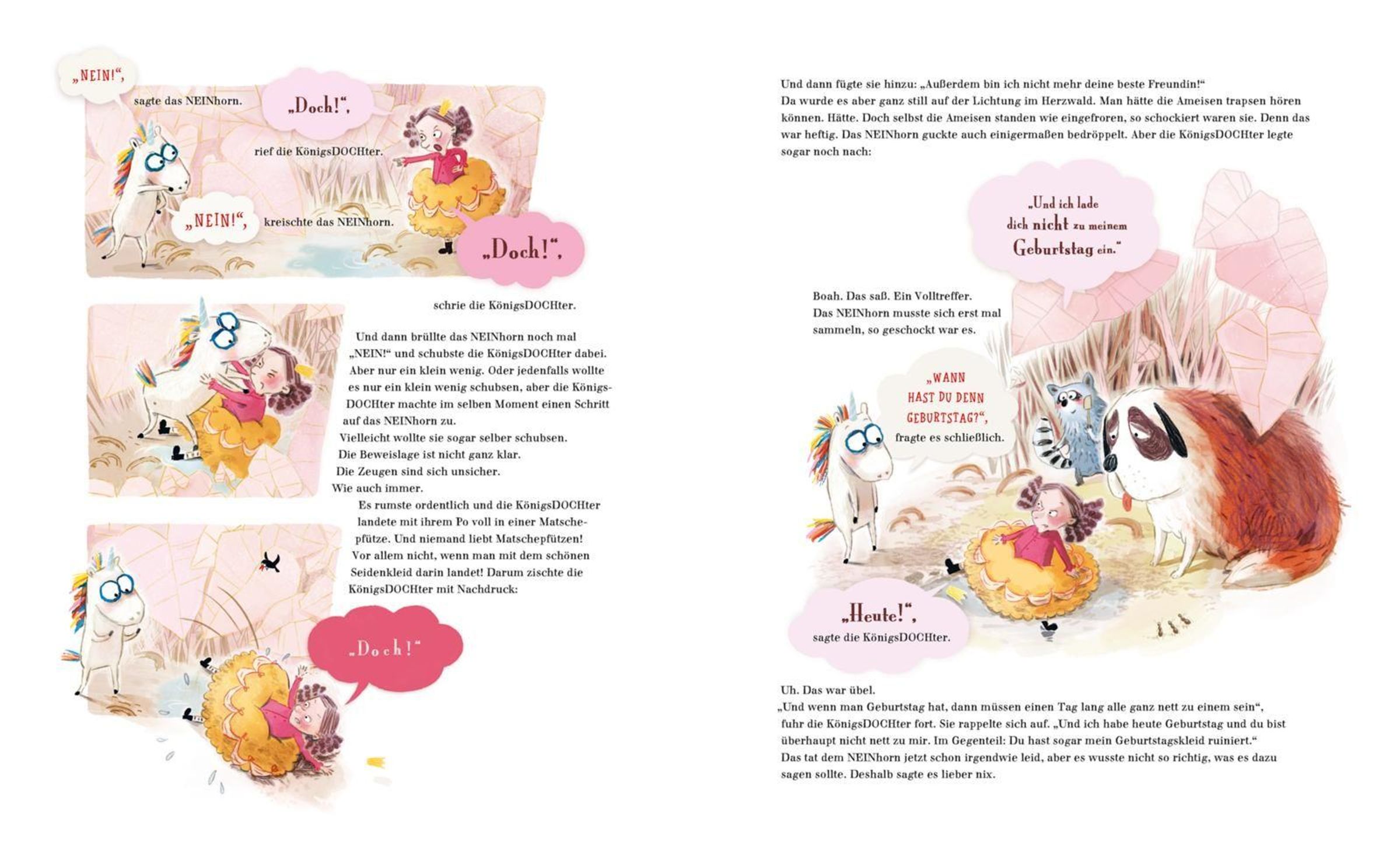 Das NEINhorn hat die KönigsDOCHter nämlich geschubst. Krass, oder? Sie war aber auch voll garstig. Vielleicht wollte sie sogar selber schubsen.