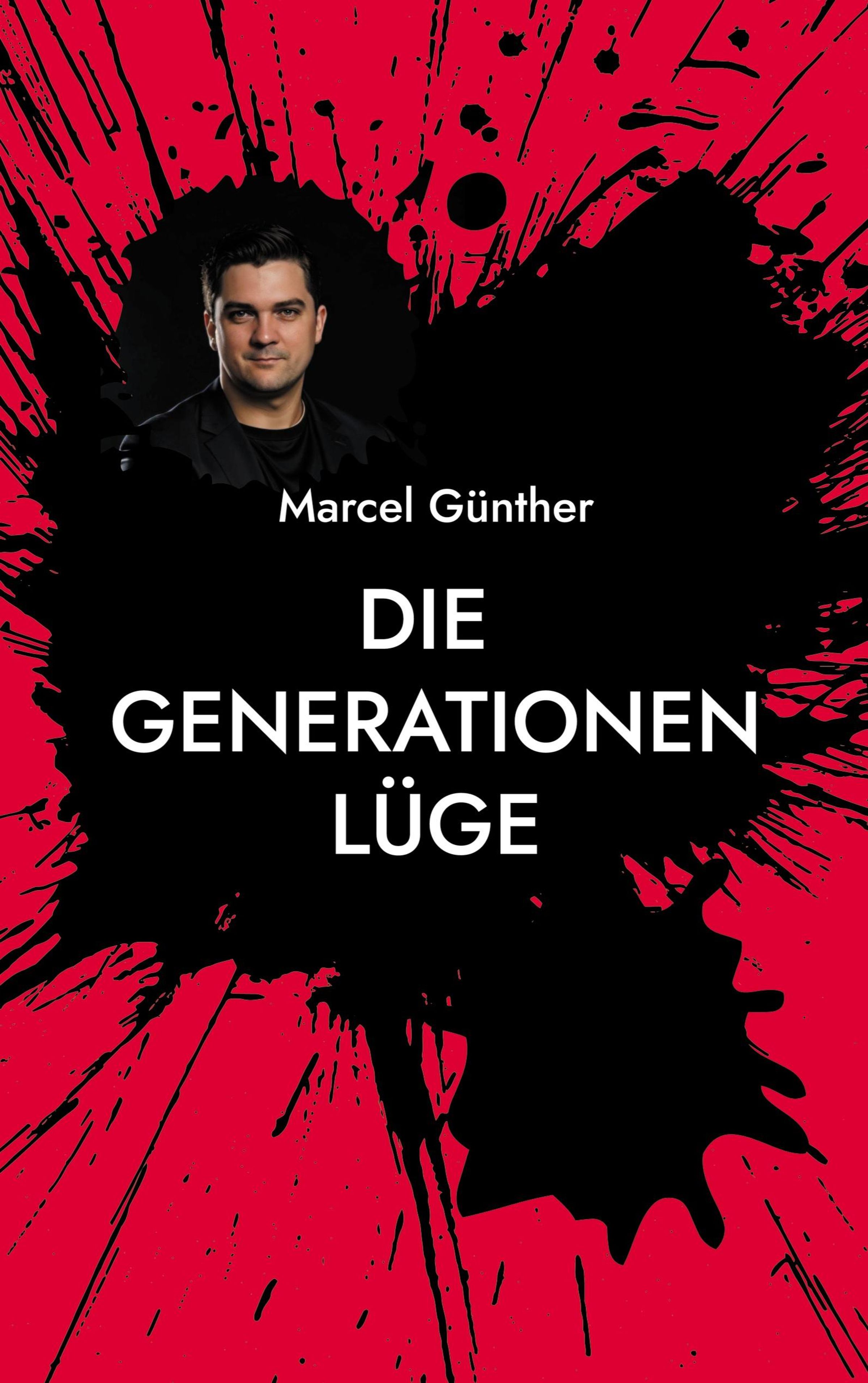 „DIE GENERATIONEN LÜGE“ von Marcel Günther. Ein Foto vor rotem Hintergrund mit schwarzer Farbspritzern., Buch