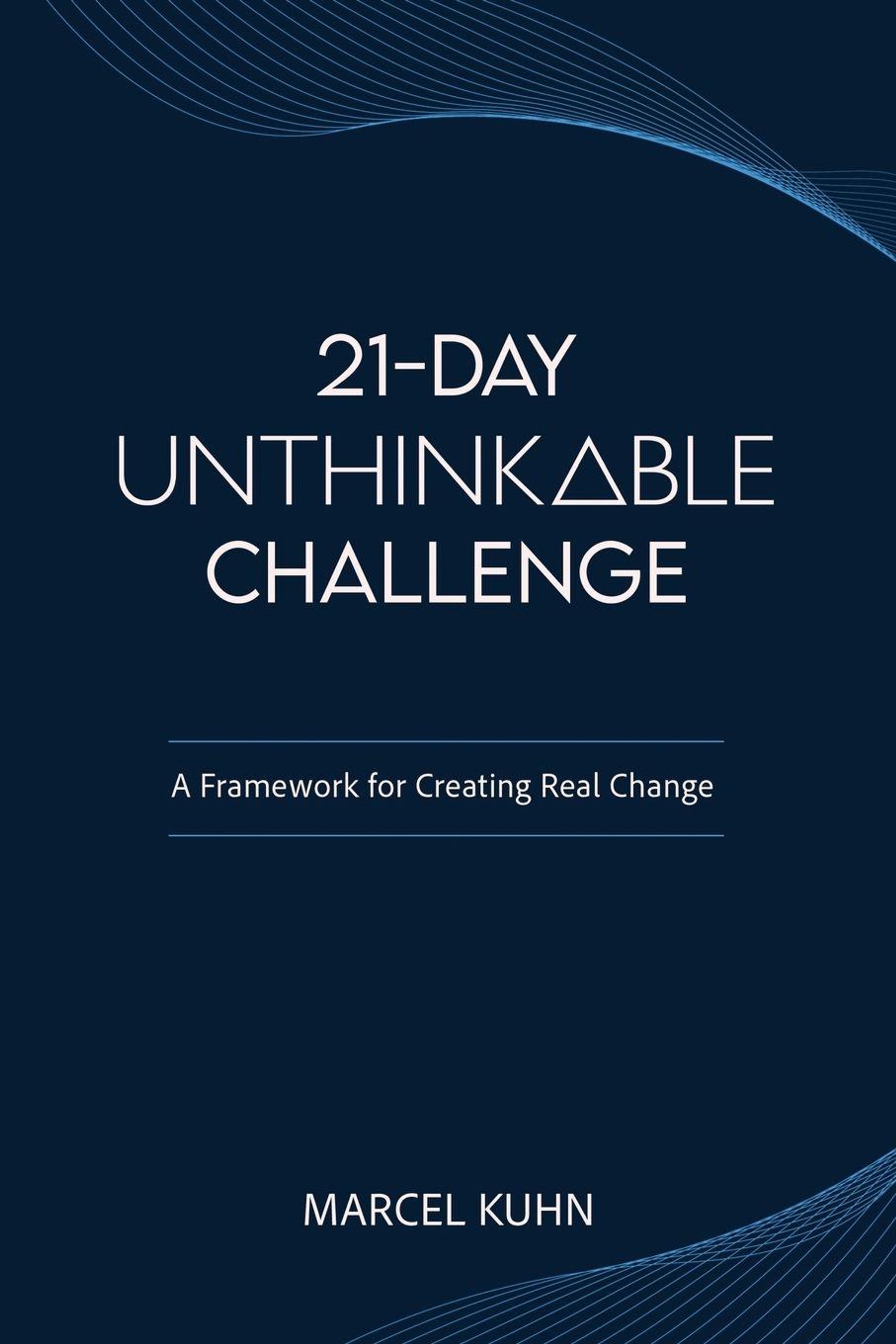Text: "21-DAY UNTHINK△BLE CHALLENGE. A Framework for Creating Real Change. MARCEL KUHN." Dunkler Hintergrund mit Linien., Buch