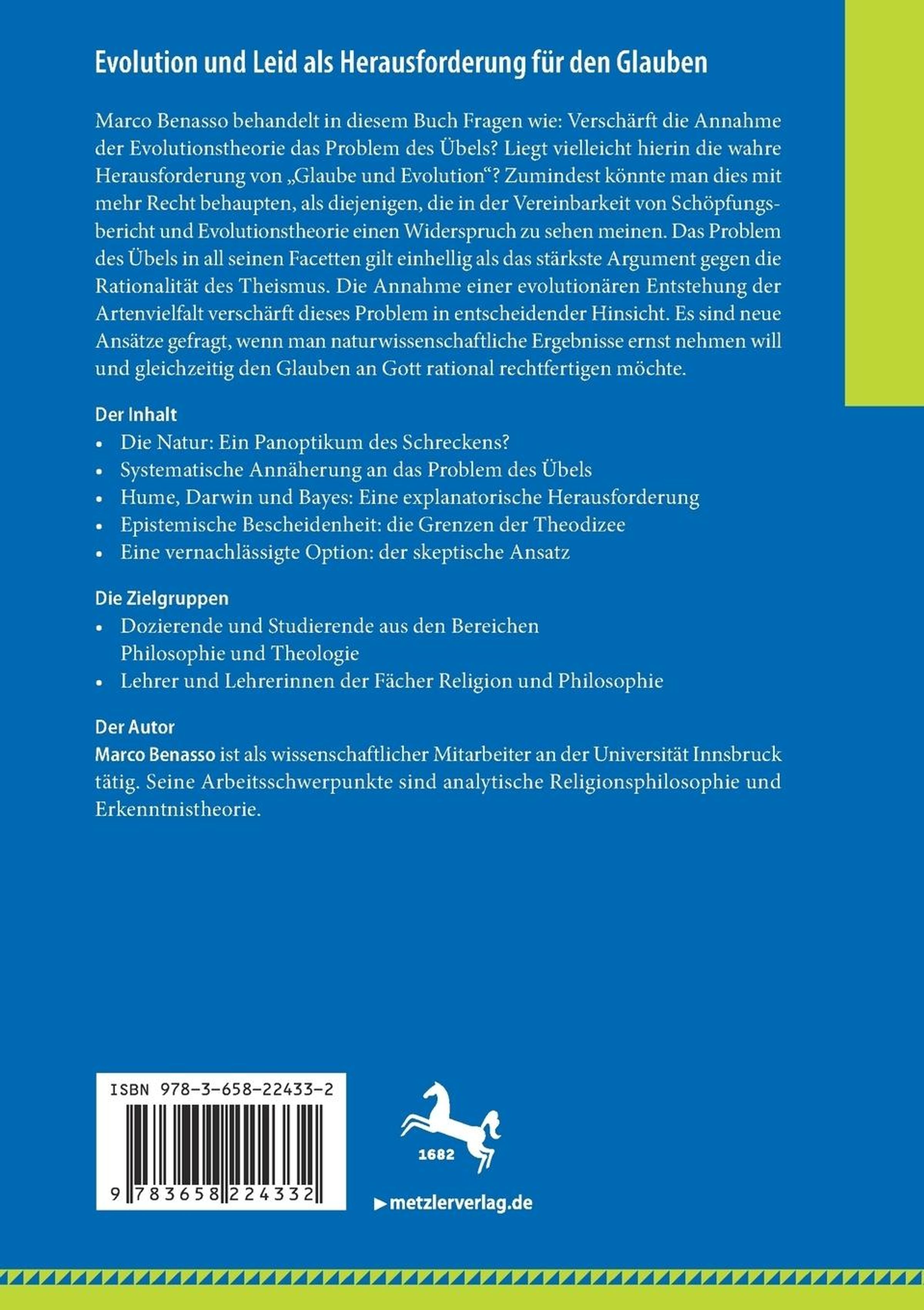 Marco Benasso behandelt in diesem Buch Fragen wie: Verschärft die Annahme der Evolutionstheorie das Problem des Übels? Liegt vielleicht hierin die wahre Herausforderung von ¿Glaube und Evolution¿? Zumindest könnte man dies mit mehr Recht behaupten, als diejenigen, die in der Vereinbarkeit von Schöpfungsbericht und Evolutionstheorie einen Widerspruch zu sehen meinen. Das Problem des Übels in all seinen Facetten gilt einhellig als das stärkste Argument gegen die Rationalität des Theismus. Die Annahme einer evolutionären Entstehung der Artenvielfalt verschärft dieses Problem in entscheidender Hinsicht. Es sind neue Ansätze gefragt, wenn man naturwissenschaftliche Ergebnisse ernst nehmen will und gleichzeitig den Glauben an Gott rational rechtfertigen möchte. ¿