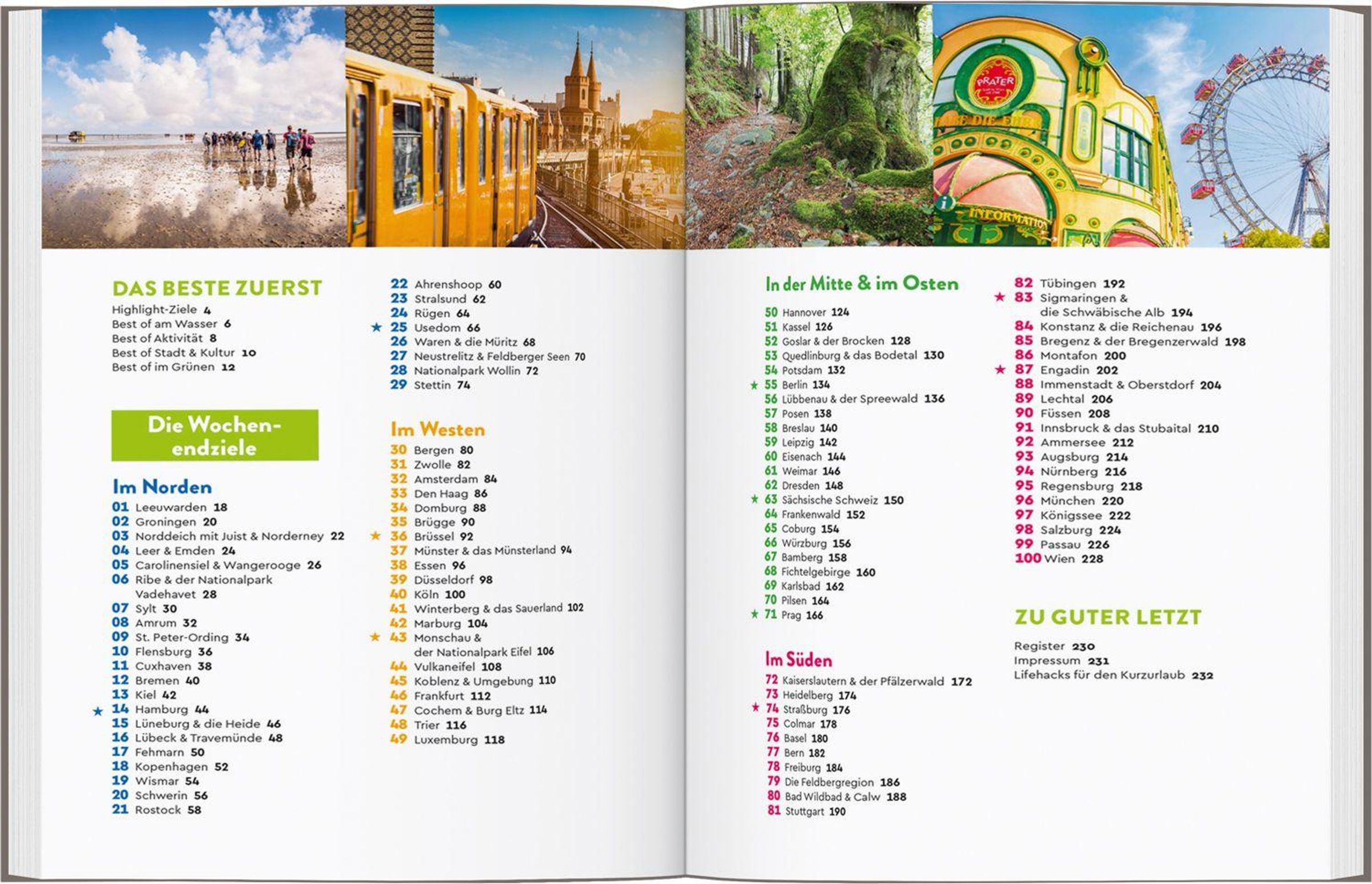 Gönn dir ein paar Wochenenden mehr an Urlaub: Sich im Norden von der Meeresbrise den Kopf freipusten lassen oder im Süden das Alpenpanorama bejubeln. Im Westen spannende Ruhrpottstädte erkunden oder den Geheimnissen von Deutschlands unterschätzter Mitte auf den Grund gehen. Oder lieber über die Grenze hüpfen und bei den lieben Nachbarn vorbeischauen? Jedes Ziel wird mit seinen 5 bis 6 Erlebnis-Highlights vorgestellt, die ein pralles Wochenende garantieren. Ob Großstadtrummel, Action in der Natur oder an den schönsten Orten die Füße hochlegen: Mit MARCO POLO geht's ganz weit raus aus dem Alltag!