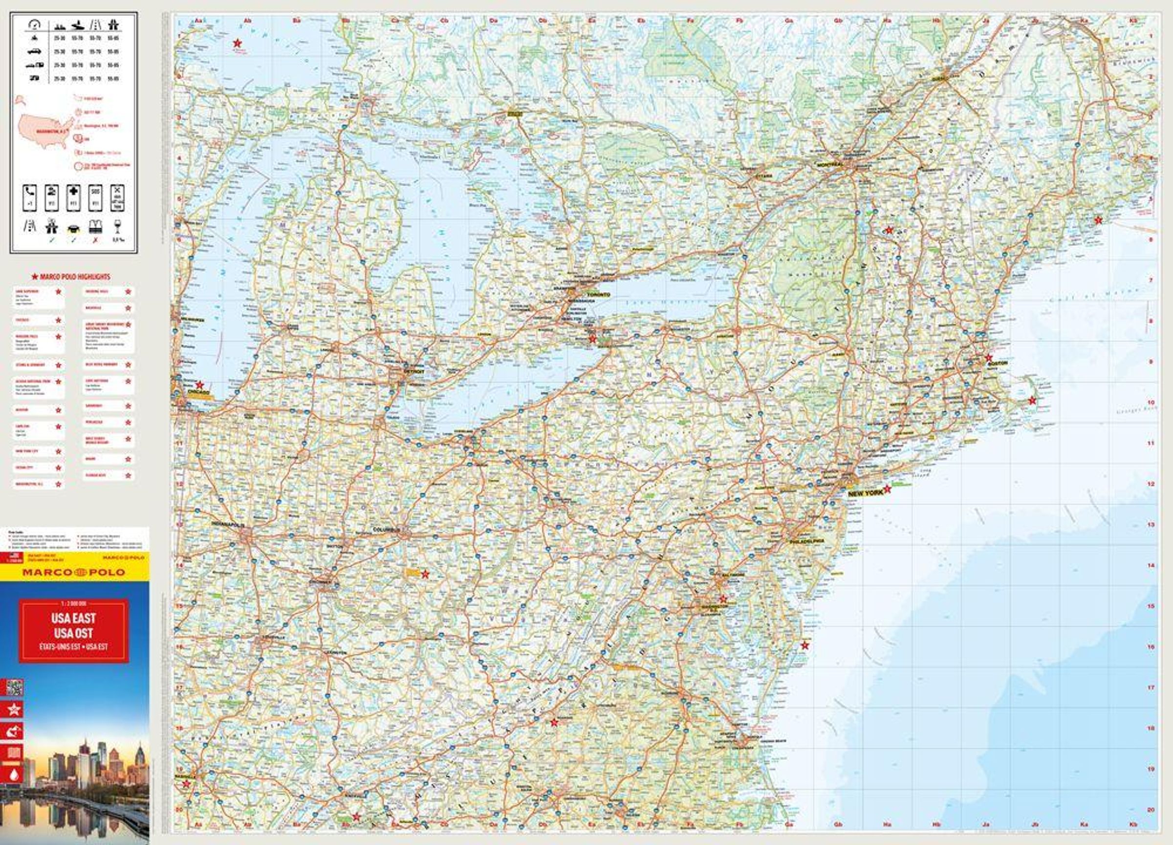 Die MARCO POLO Reisekarte USA Ost - Die Karte für Urlaubsplaner und Entdeckerinnen im Maßstab 1: 2.000.000. Kein Highlight mehr verpassen - die MARCO POLO Karte zeigt die bedeutendsten kulturellen und landschaftlichen Sehenswürdigkeiten auf der Karte und in einer zusätzlichen Online-Sammlung. Im schützenden Kartondeckel sind einige der interessantesten Orte mit Fotos abgebildet. Die Karte ist beidseitig bedruckt und herausnehmbar. Dank dem digitalen Register kann einfach nach Orten gesucht werden. Eine übersichtliche und detailreiche Kartografie macht es einfach, die Karte zu lesen. Auf der Rückseite des Deckels befindet sich eine Übersichtskarte mit allen Highlights. Hilfreiche Details und Verkehrsinformationen machen die Reisekarte auch zur perfekten Straßenkarte: entspannt ankommen und alles gesehen haben.