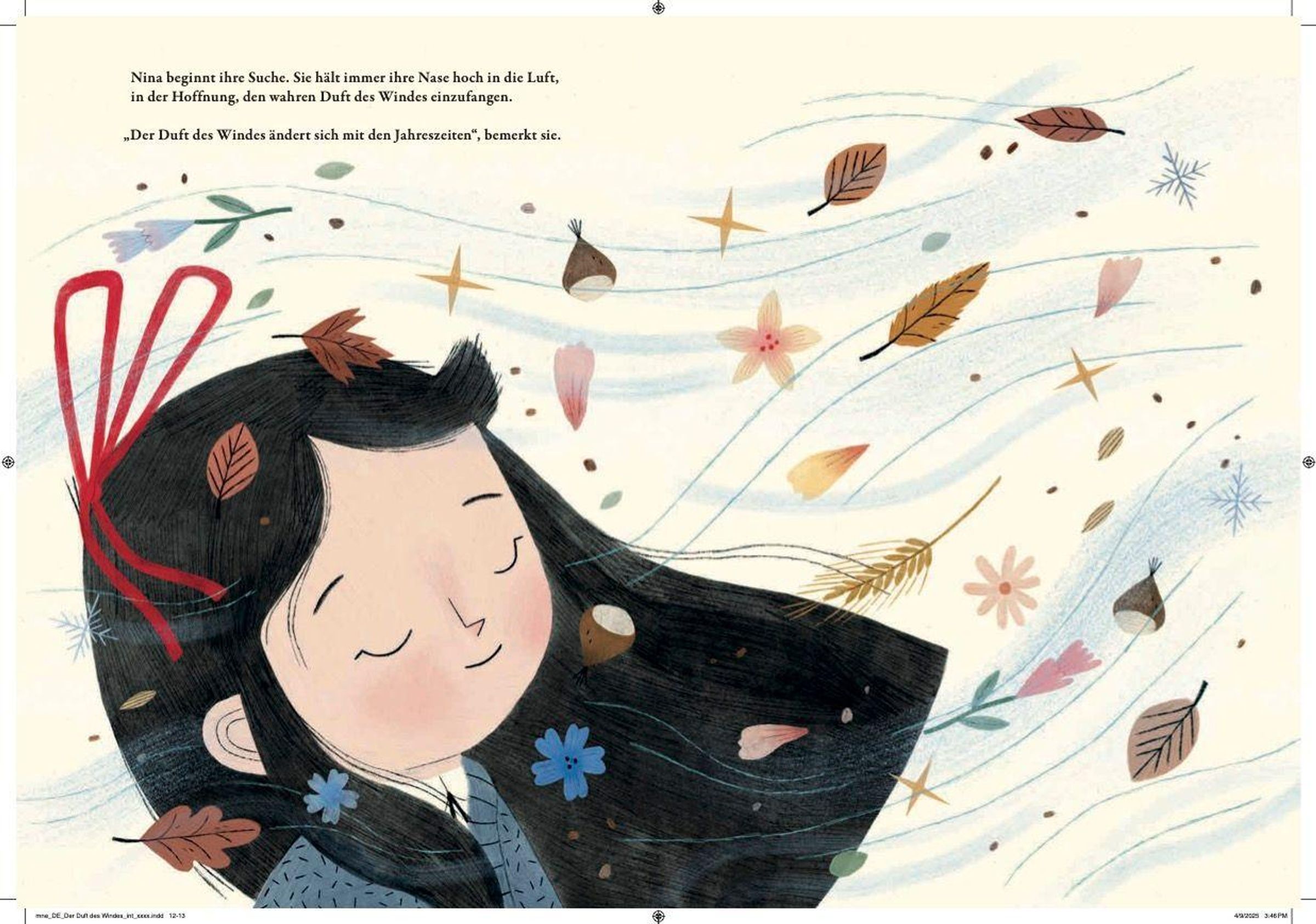 Nina ist ein neugieriges Mädchen. Eine von denen, die immer tausend Fragen stellen, und die gerne alles verstehen möchten, was um sie herum geschieht. "Wonach riecht der Wind?", will sie wissen und begibt sich auf die Suche nach der Antwort. Sie reckt ihre Nase in die Luft und beobachtet aufmerksam ihre Umgebung. Mal riecht der Wind nach Salz und Sonne, mal nach Regen, frischer Wäsche oder alten Büchern. Was sie noch nicht weiß: der Wind duftet nach Leben und Erinnerungen.