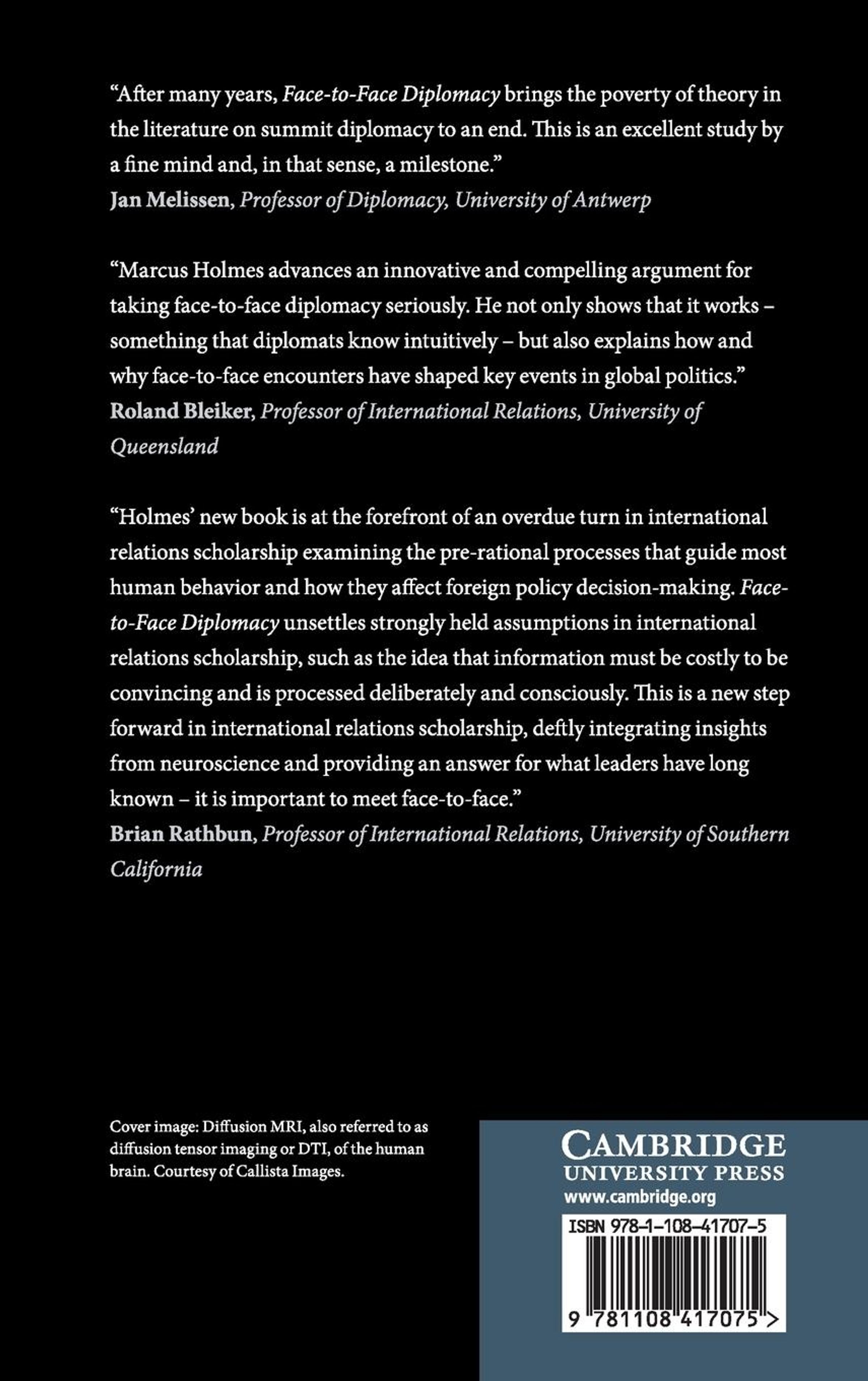 Face-to-face diplomacy has long been the lynchpin of world politics, yet it is largely dismissed by scholars of International Relations as unimportant. Marcus Holmes argues that dismissing this type of diplomacy is in stark contrast to what leaders and policy makers deem as essential and that this view is rooted in a particular set of assumptions that see an individual's intentions as fundamentally inaccessible. Building on recent evidence from social neuroscience and psychology, Holmes argues that this assumption is problematic. Marcus Holmes studies some of the most important moments of diplomacy in the twentieth century, from 'Munich' to the end of the Cold War, and by showing how face-to-face interactions allowed leaders to either reassure each other of benign defensive intentions or pick up on offensive intentions, his book challenges the notion that intentions are fundamentally unknowable in international politics, a central idea in IR theory.