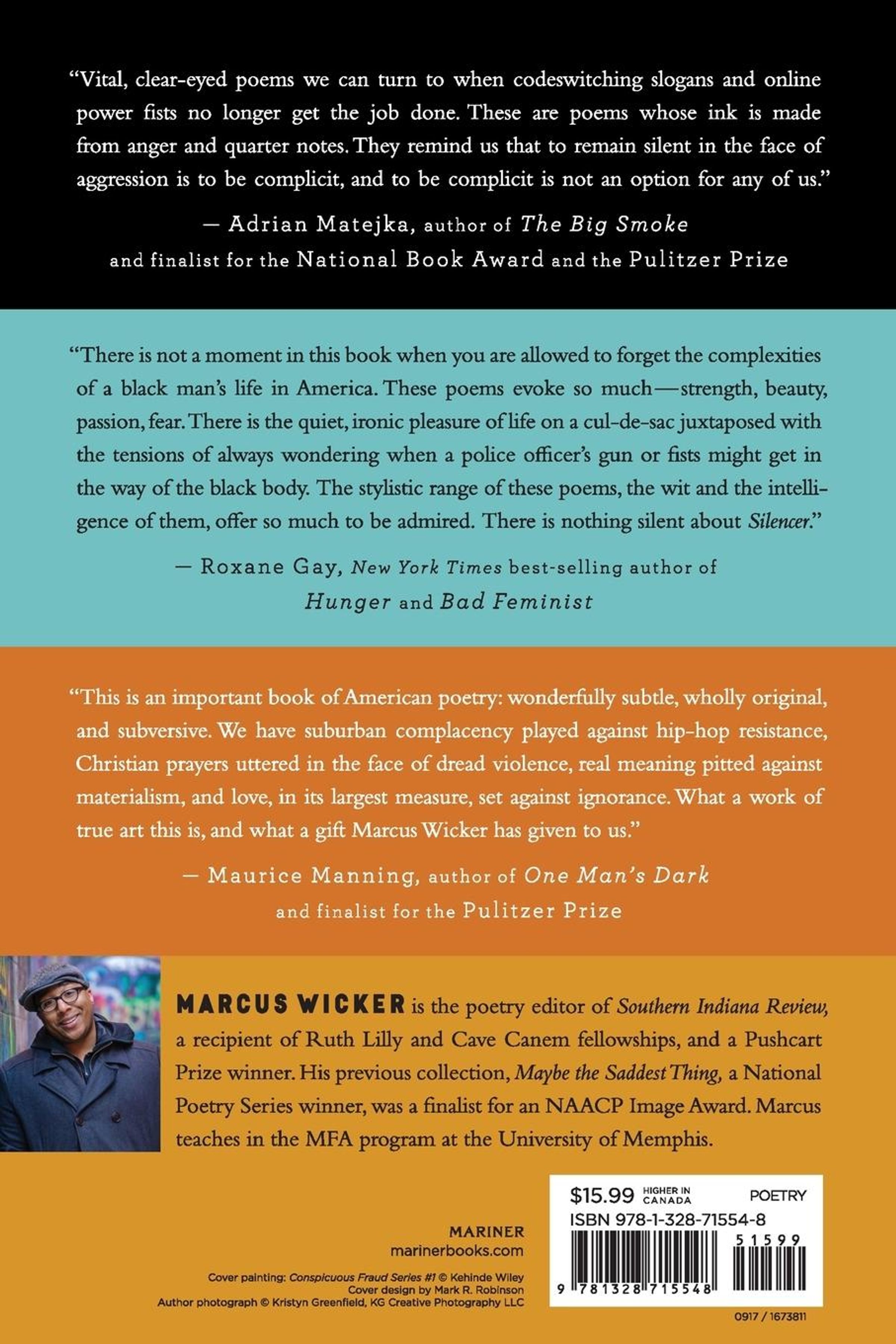 "There is not a moment in this book when you are allowed to forget the complexities of a black man's life in America. These poems evoke so much-strength, beauty, passion, fear. There is the quiet, ironic pleasure of life on a cul-de-sac juxtaposed with the tensions of always wondering when a police officer's gun or fists might get in the way of the black body. The stylistic range of these poems, the wit, and the intelligence of them offers so much to be admired. There is nothing silent about Silencer . What an outstanding second book from Marcus Wicker." -Roxane Gay