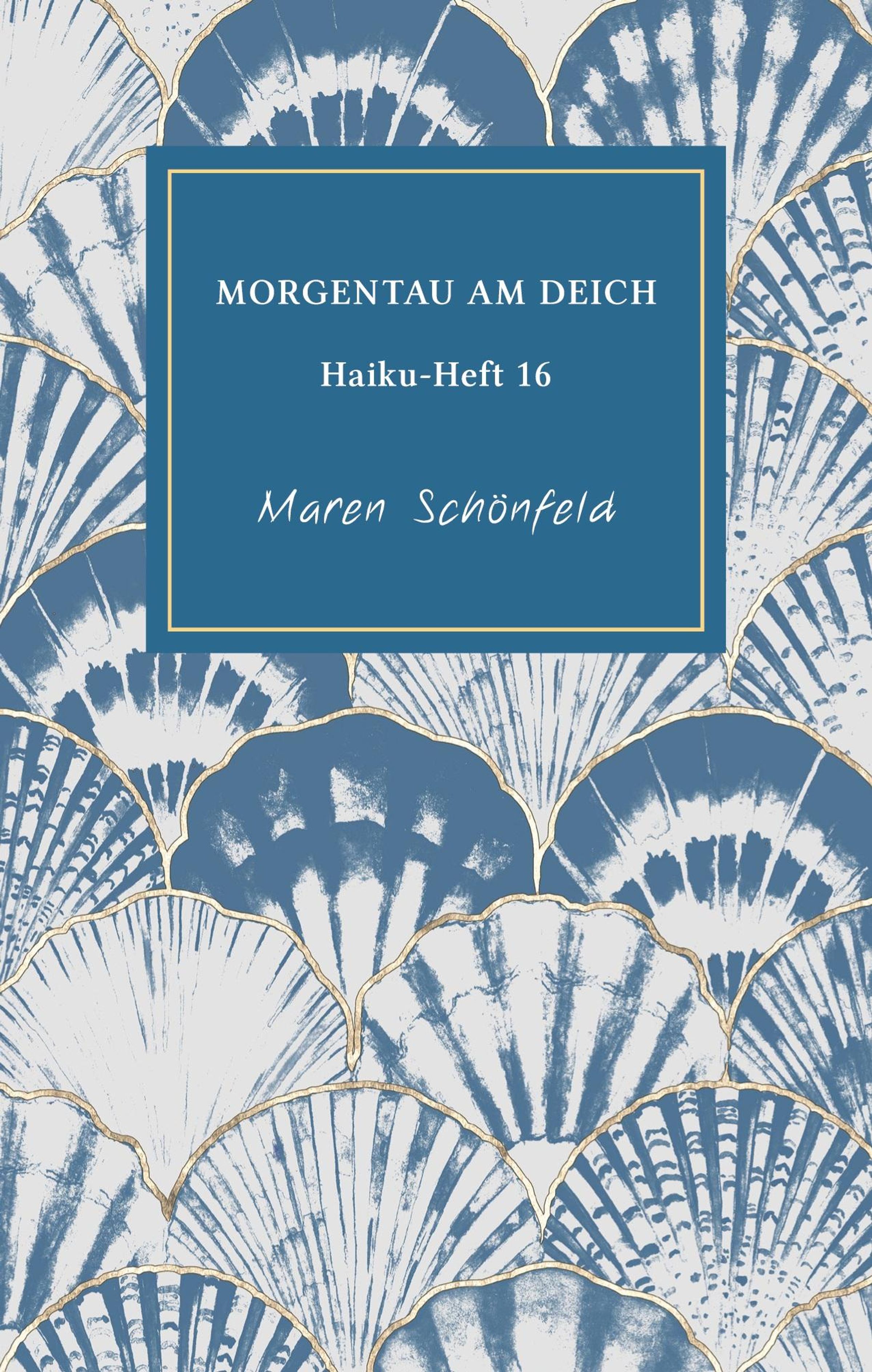 "MORGENTAU AM DEICH - Haiku-Heft 16 - Maren Schönfeld." Muschel-Muster in Blau und Weiß, goldene Ränder., Buch