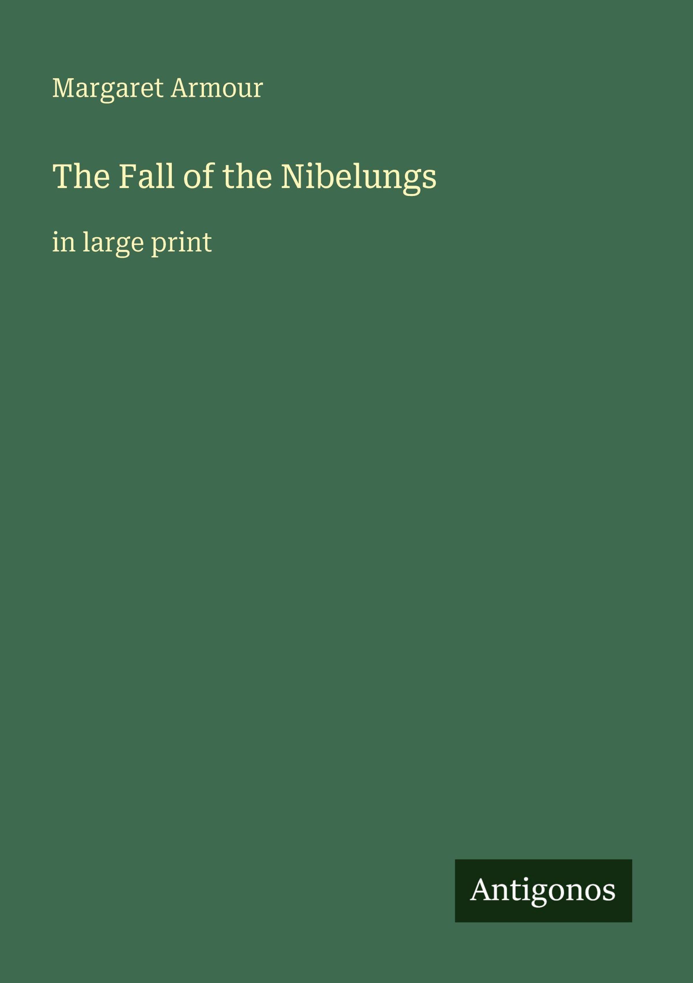 Text: „Margaret Armour, The Fall of the Nibelungs, in large print“. Unten rechts ein kleines Logo mit „Antigonos“. Dunkelgrüner Hintergrund., Buch
