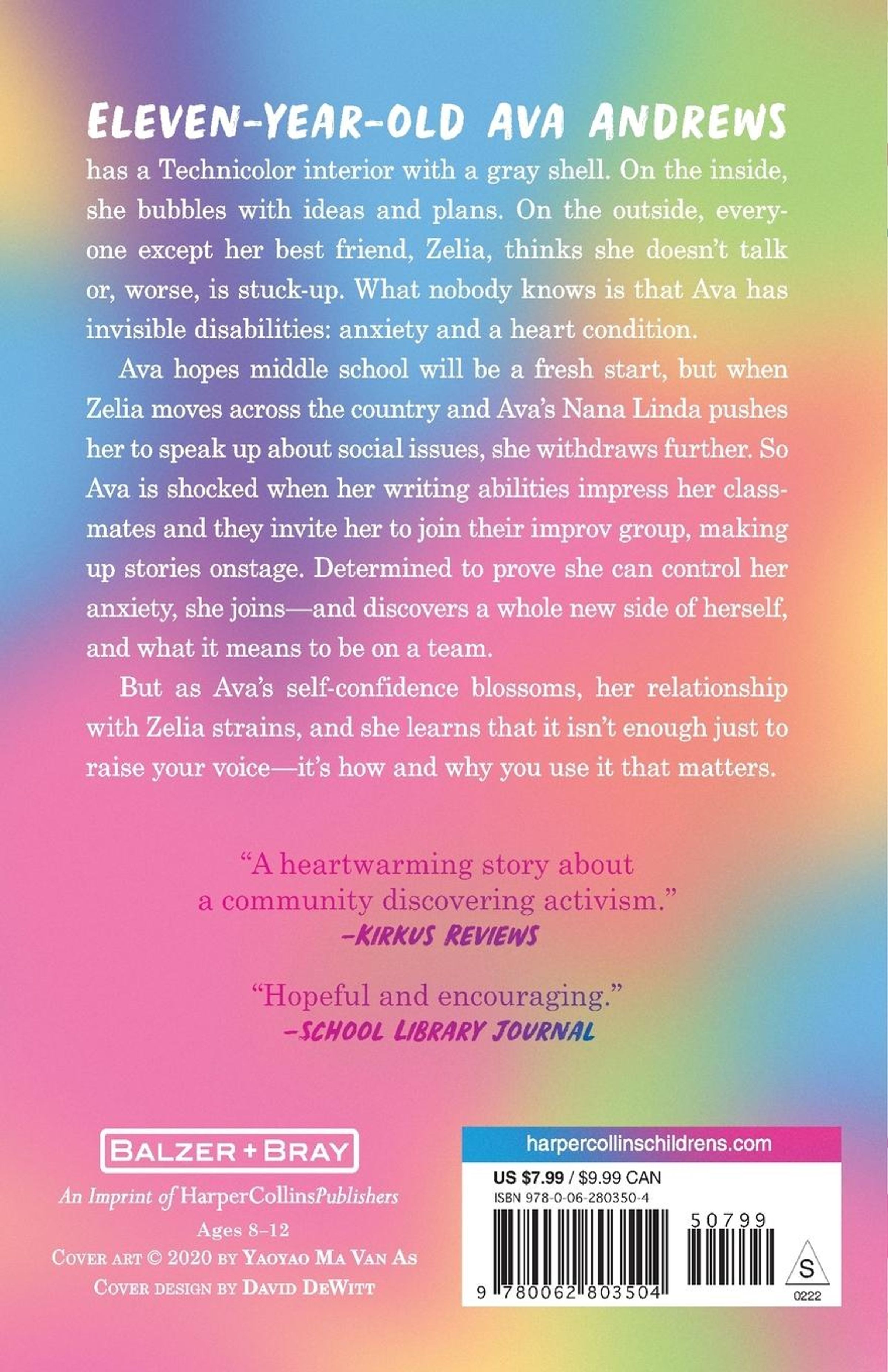 Eleven-year-old Ava Andrews has a Technicolor interior with a gray shell. On the inside, she bubbles with ideas and plans. On the outside, everyone except her best friend, Zelia, thinks she doesn't talk or, worse, is stuck-up. What nobody knows is that Ava has invisible disabilities: anxiety and a heart condition.