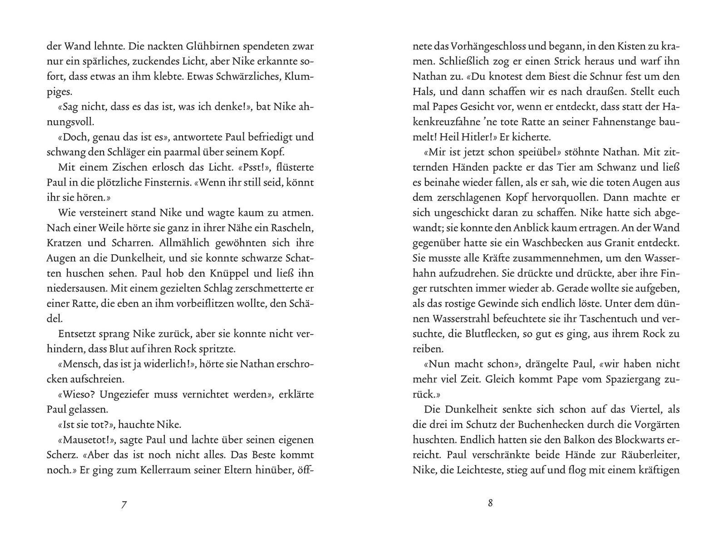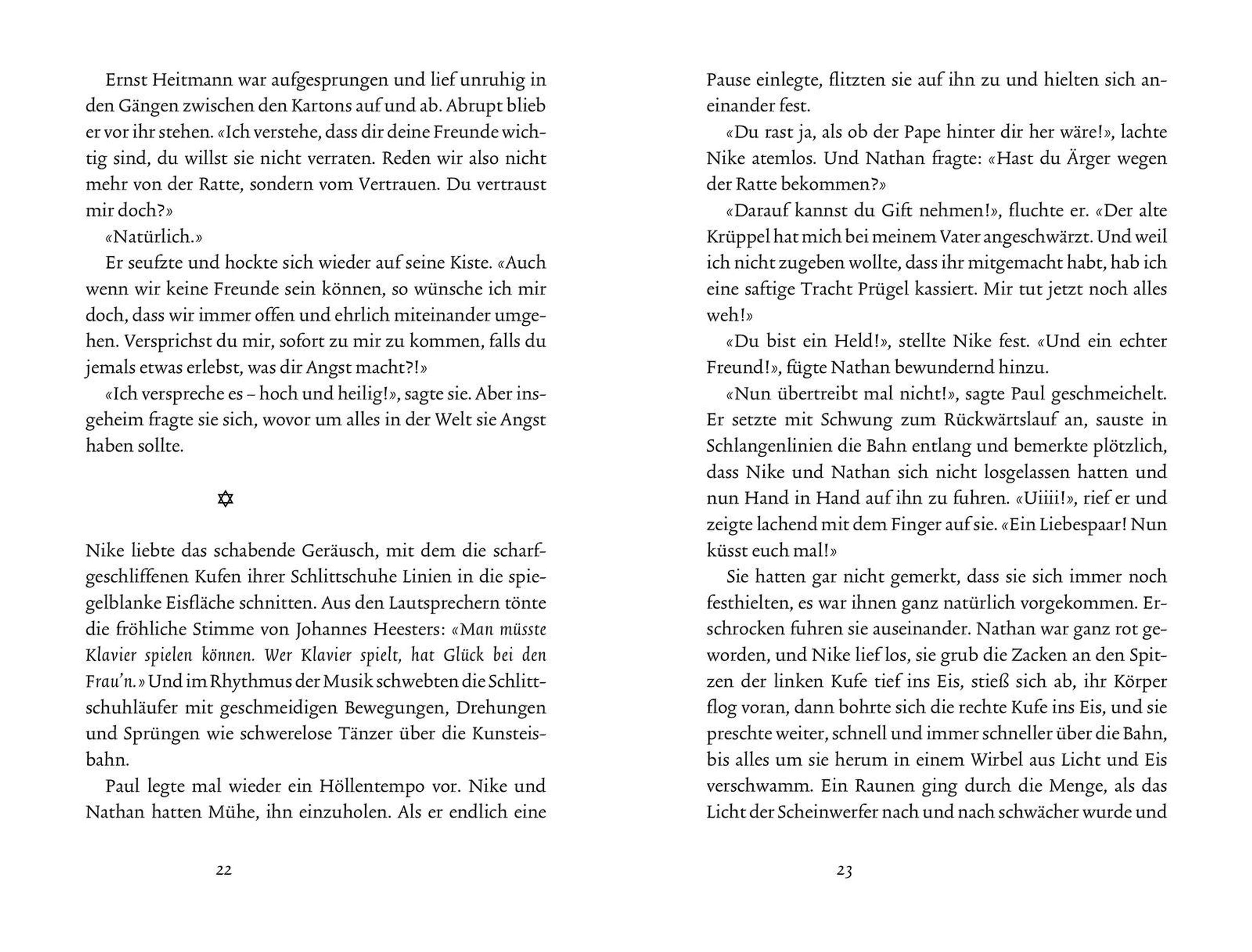 <<Wir kennen uns nicht, wir haben uns noch nie gesehen!>>, zischte er ihr zu, und schon lief er los, um zu verschwinden. Im Nu war Nike wieder bei ihm, legte ihm den Arm um die Schultern und schmiegte ihre Wange an seine. Er atmete schwer. <<Du weißt, dass es verboten ist, sich mit einem Juden einzulassen>>, flüsterte er rau. <<Niemand jagt mir heute Angst ein, nicht heute, an unserem Glückstag!>> Sie lachte froh.