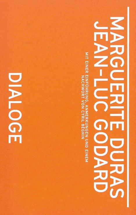 Die drei Dialoge zwischen Marguerite Duras und Jean-Luc Godard schlagen einen Bogen, der im Oktober 1979 beginnt, im September oder Oktober 1980 fortgesetzt und im Dezember 1987 beendet wird. Sie sind Zeugnis einer engen Beziehung zwischen der Schriftstellerin und dem Regisseur, zugleich aber eine in sich geschlossene Erzählung. Die zweite Begegnung fand statt, nachdem sie ihre je eigenen Überlegungen zum Kino veröffentlich hatten - Duras in dem Band Die grünen Augen. Texte zum Kino, Godard in seiner Einführung in eine wahre Geschichte des Kinos. Ihre Dialoge berühren beinahe sämtliche Themen, die sich auch durch diese Bücher ziehen: die Frage nach dem Verhältnis zwischen Schrift und Bild, die Repräsentation dessen, das der Repräsentation entzogen scheint (Konzentrationslager und Inzest - aus ganz unterschiedlichen Gründen), Überlegungen zur Kindheit und zum Fernsehen. Dialoge wird mit einer Einführung, Kommentaren und einem Nachwort von Cyril Béghin begleitet.