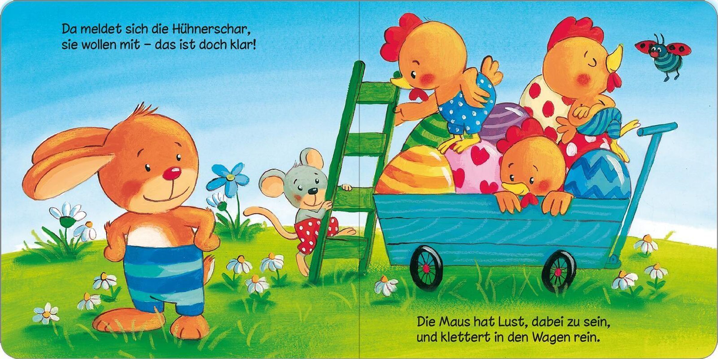 Der kleine Osterhase ist bereit fürs Osterfest. Er holt seinen Leiterwagen und möchte die bunten Eier verteilen. Doch was ist da los? Die ganze Hühnerschar will ihn begleiten. Und wen treffen sie noch auf dem Weg?
