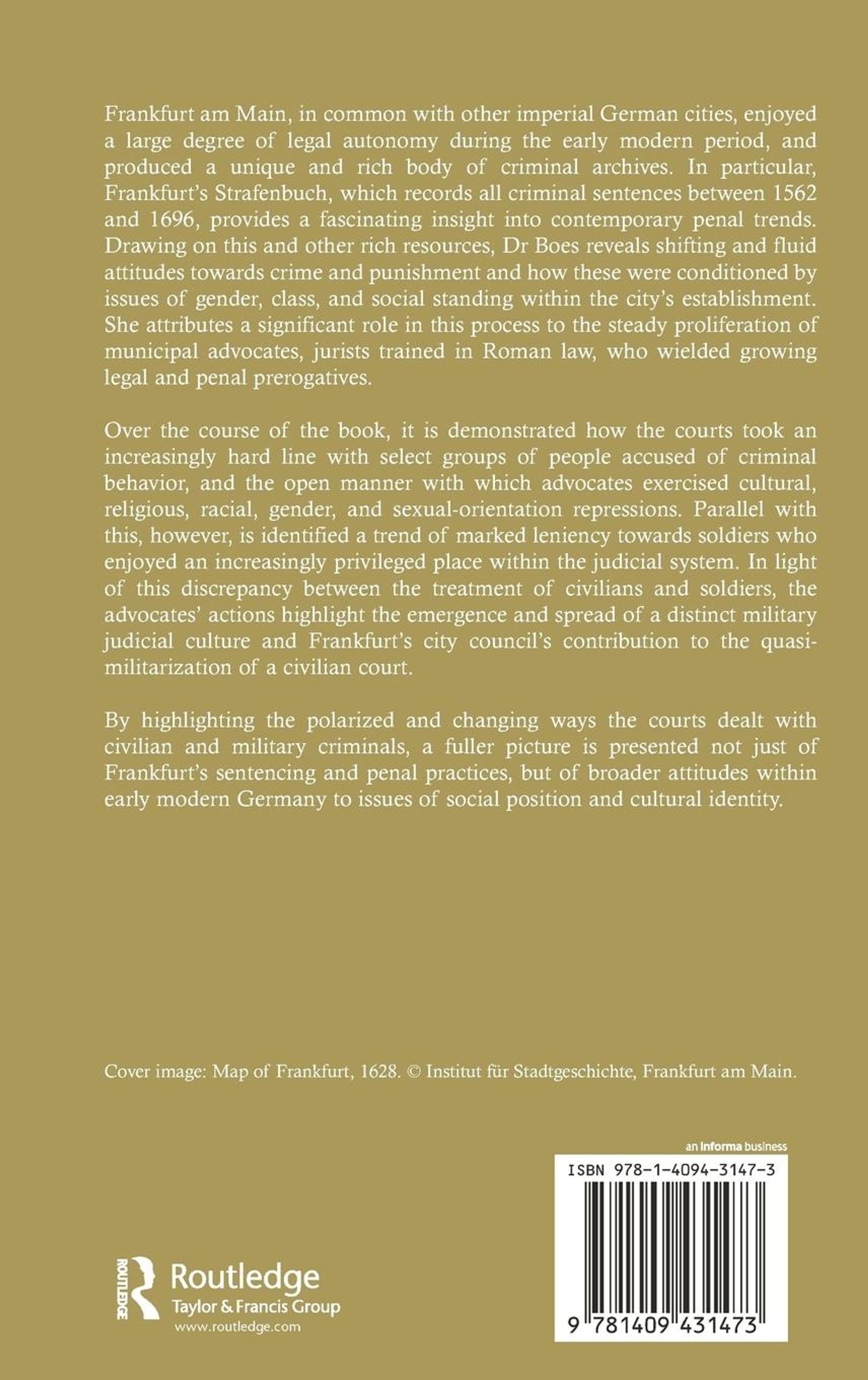 Frankfurt am Main, in common with other imperial German cities, enjoyed a large degree of legal autonomy during the early modern period, and produced a unique and rich body of criminal archives. In particular, Frankfurt's Strafenbuch, which records all criminal sentences between 1562 and 1696, provides a fascinating insight into contemporary penal trends. Drawing on this and other rich resources, Boes reveals shifting and fluid attitudes towards crime and punishment and how these were conditioned by issues of gender, class and social standing within the city's establishment. She attributes a significant role in this process to the steady proliferation of municipal advocates, jurists trained in Roman Law, who wielded growing legal and penal prerogatives.
