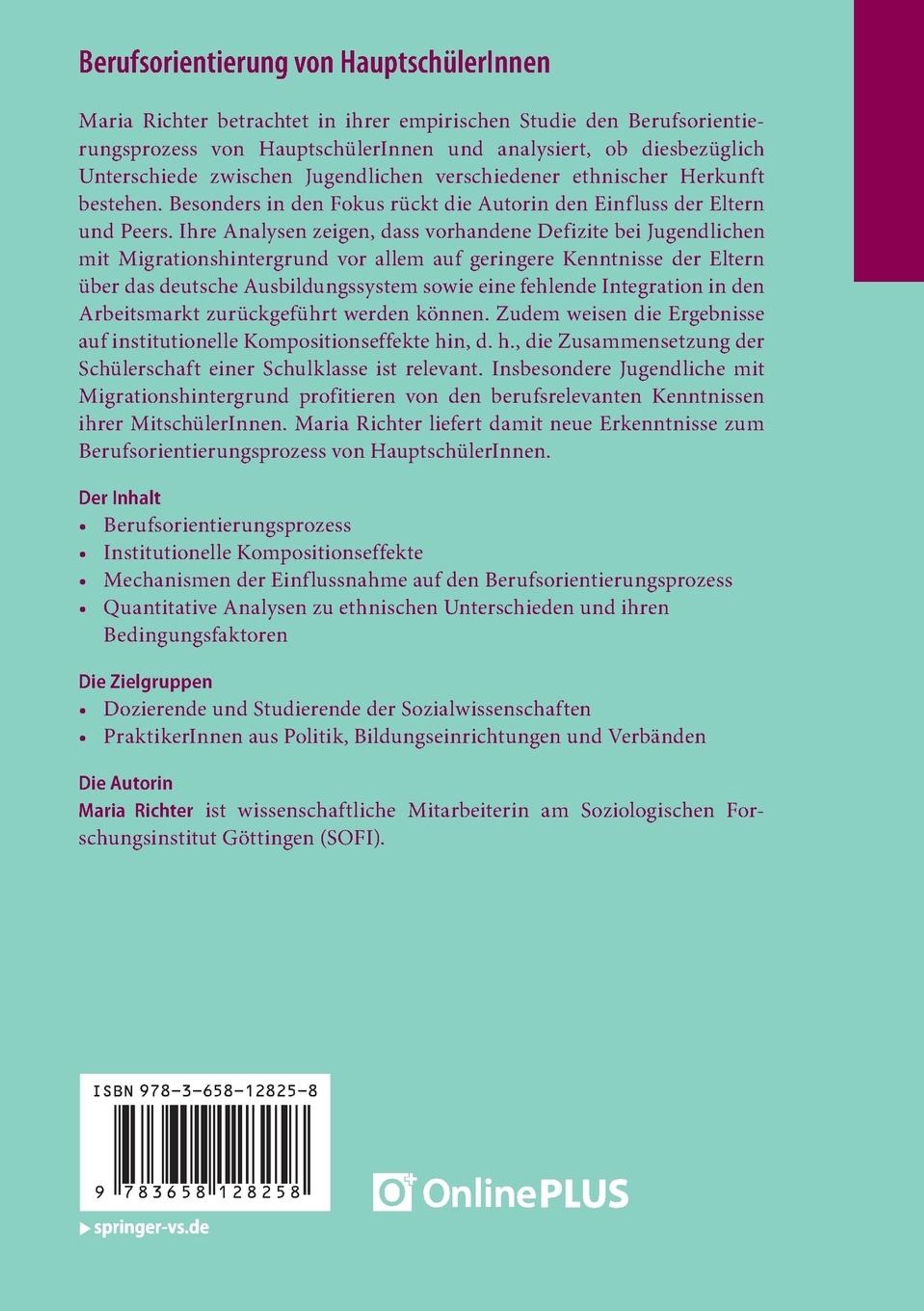 Maria Richter betrachtet in ihrer empirischen Studie den Berufsorientierungsprozess von HauptschülerInnen und analysiert, ob diesbezüglich Unterschiede zwischen Jugendlichen verschiedener ethnischer Herkunft bestehen. Besonders in den Fokus rückt die Autorin den Einfluss der Eltern und Peers. Ihre Analysen zeigen, dass vorhandene Defizite bei Jugendlichen mit Migrationshintergrund vor allem auf geringere Kenntnisse der Eltern über das deutsche Ausbildungssystem sowie eine fehlende Integration in den Arbeitsmarkt zurückgeführt werden können. Zudem weisen die Ergebnisse auf institutionelle Kompositionseffekte hin, d. h., die Zusammensetzung der Schülerschaft einer Schulklasse ist relevant. Insbesondere Jugendliche mit Migrationshintergrund profitieren von den berufsrelevanten Kenntnissen ihrer MitschulerInnen. Maria Richter liefert damit neue Erkenntnisse zum Berufsorientierungsprozess von HaupschülerInnen.