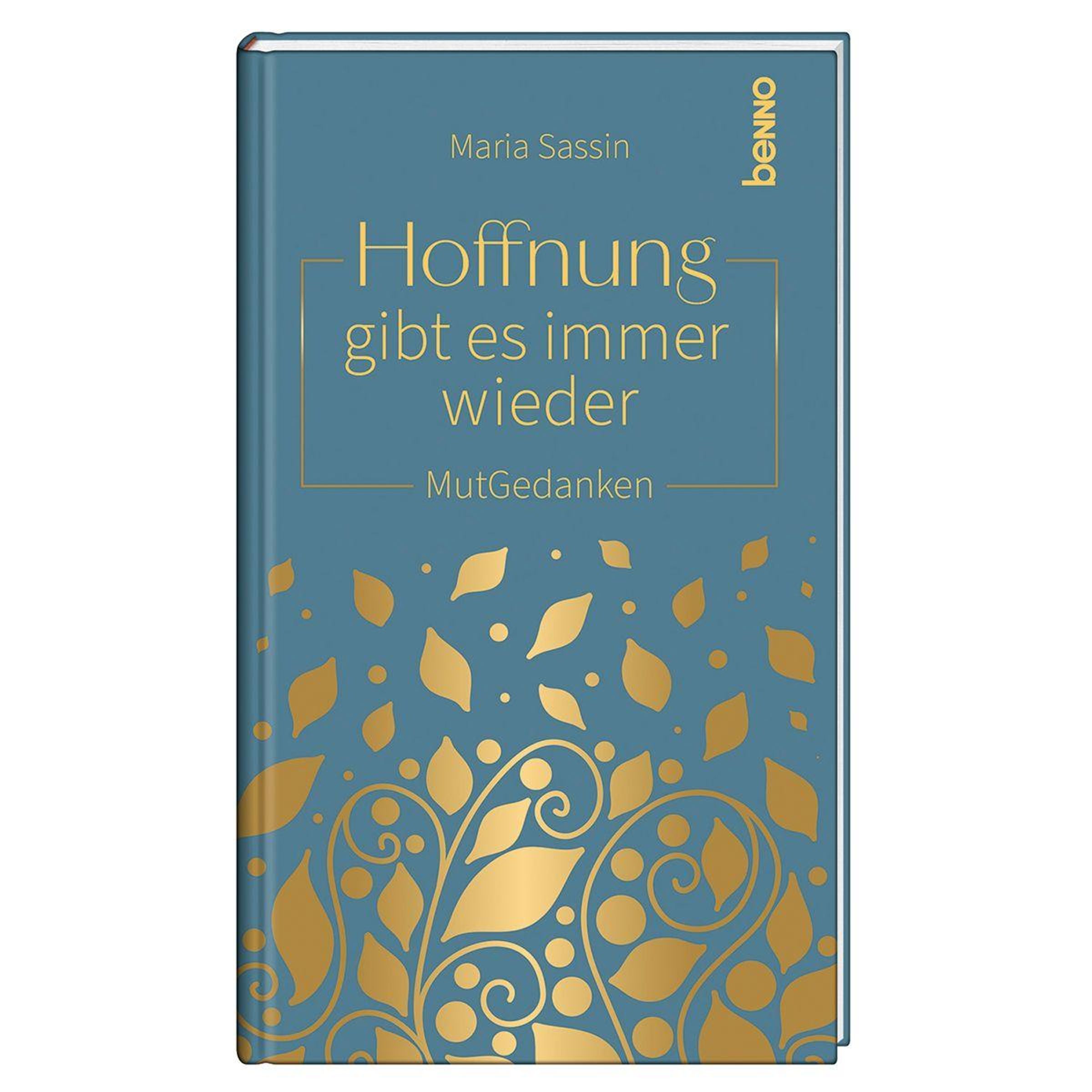 Buchtitel: "Hoffnung gibt es immer wieder". Autor: Maria Sassin. Gestaltung: Goldenes Blattmuster auf blauem Hintergrund., Buch