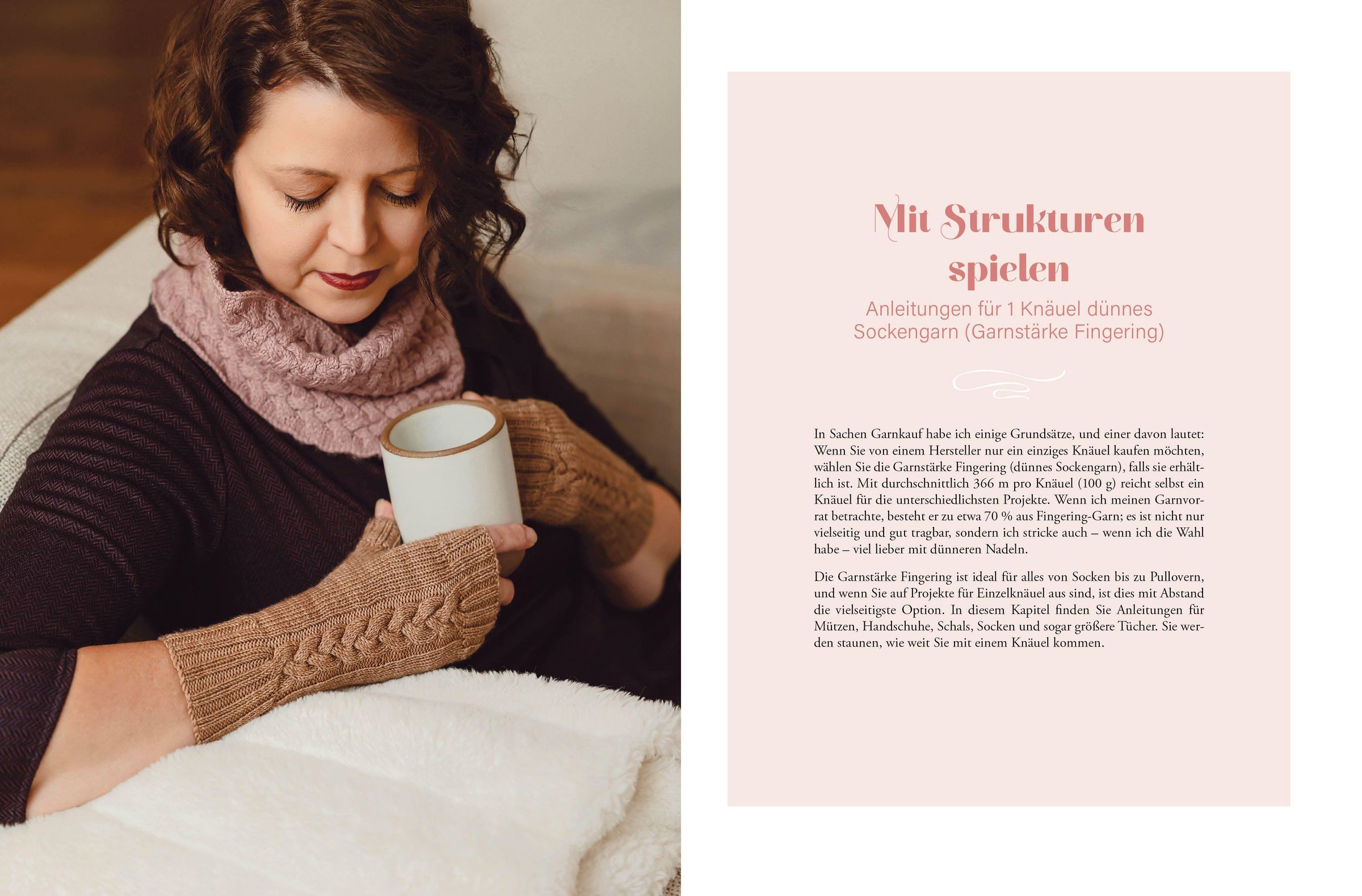 Konzipiert für ein einziges Knäuel: Jedes Projekt wurde so entworfen, dass es mit ca. 100g Garn sicher auskommt. Tipps zur Fadenführung helfen, das Material optimal auszunutzen - ohne Kompromisse bei Form oder Tragbarkeit.
