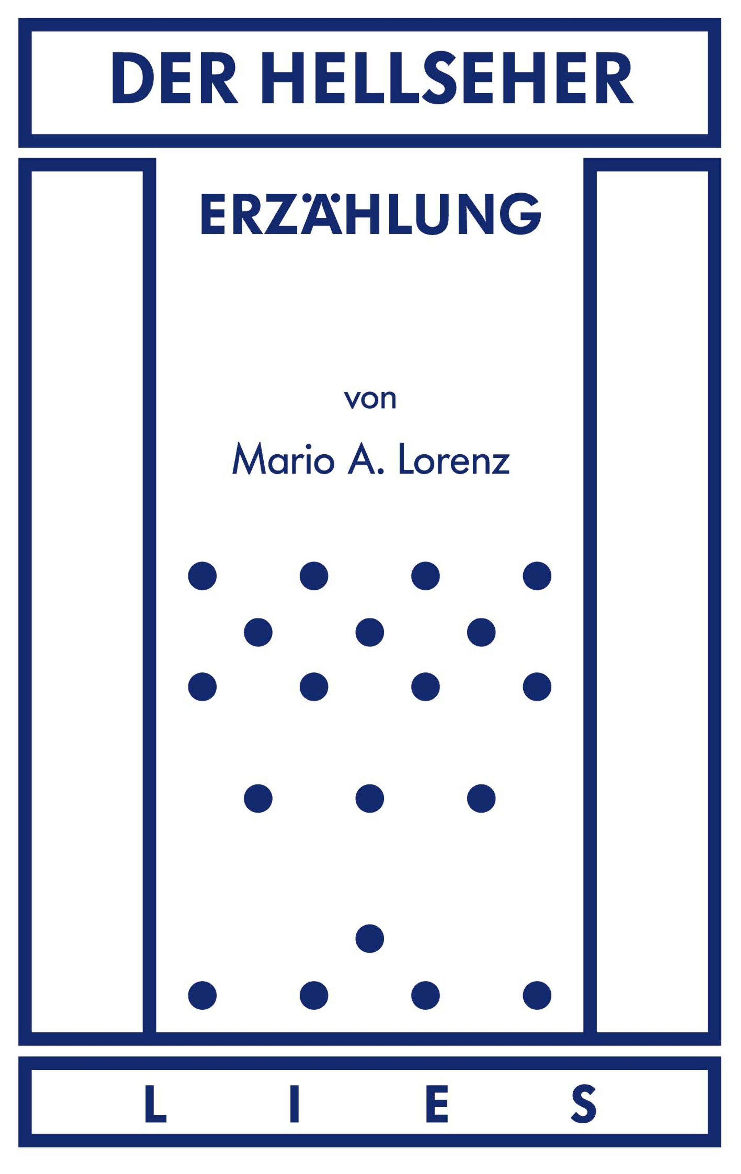 "DER HELLSEHER, ERZÄHLUNG, von Mario A. Lorenz." Punkte als Gestaltungselemente, umrahmt von blauen Linien., Buch