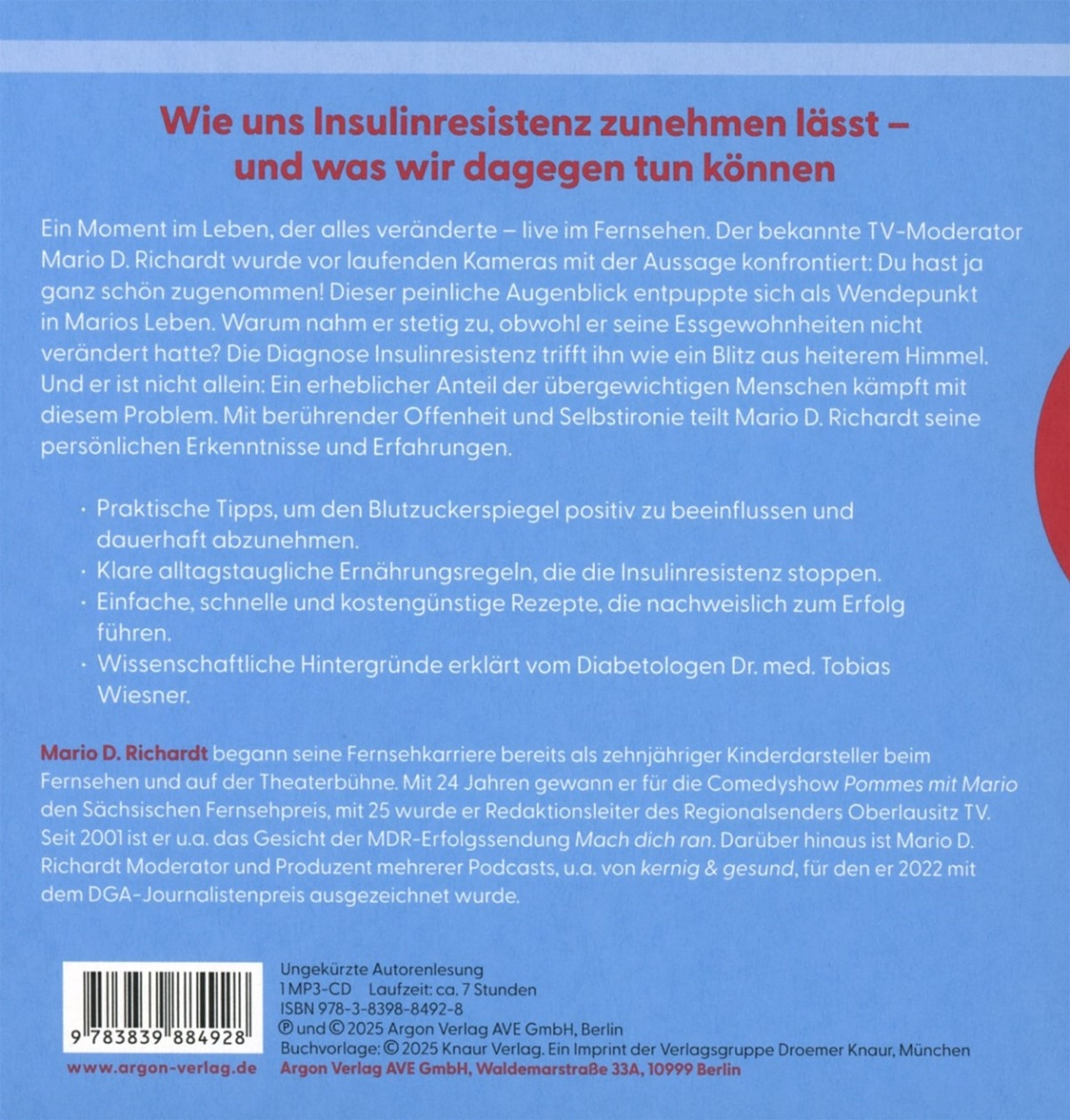 Die Diagnose Insulinresistenz trifft ihn wie ein Blitz aus heiterem Himmel. Und er ist nicht allein: Ein erheblicher Anteil der übergewichtigen Menschen kämpft mit diesem Problem. Mit berührender Offenheit und einer ordentlichen Portion Selbstironie teilt Mario D. Richardt seine persönlichen Erkenntnisse und Erfahrungen.