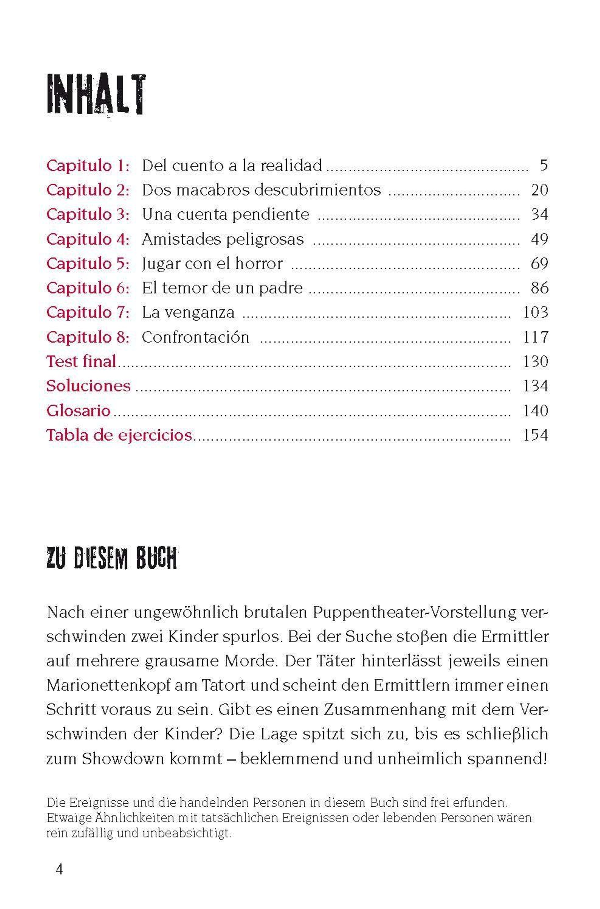 "Marionetas de la muerte", B1-Europaniveau, gelbe Warnung: "Achtung: Nichts für schwache Nerven!" Illustration: Frau mit Handschellen., Buch