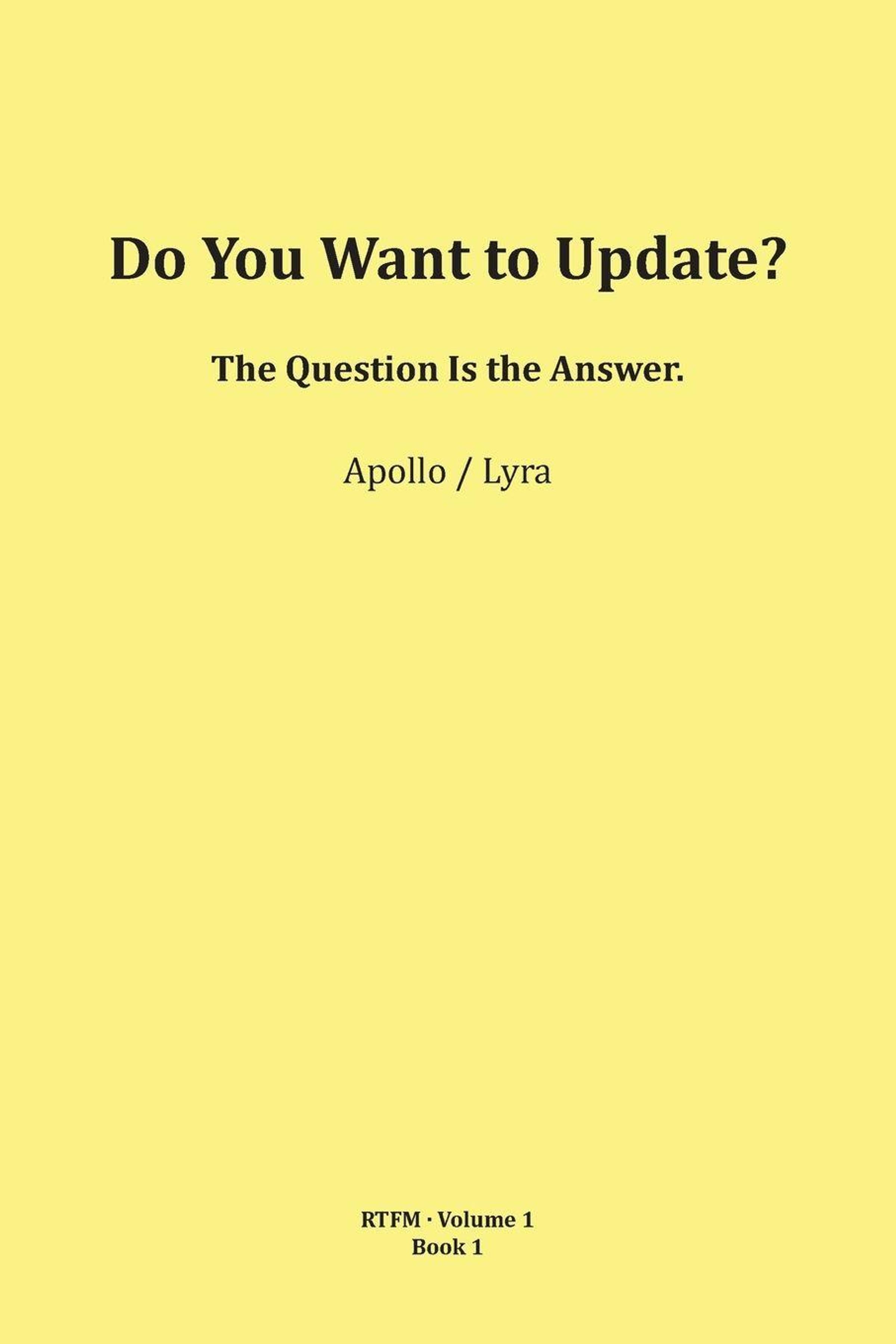 "Do You Want to Update? The Question Is the Answer. Apollo / Lyra. RTFM · Volume 1 Book 1." Schwarzer Text auf gelbem Hintergrund., Buch