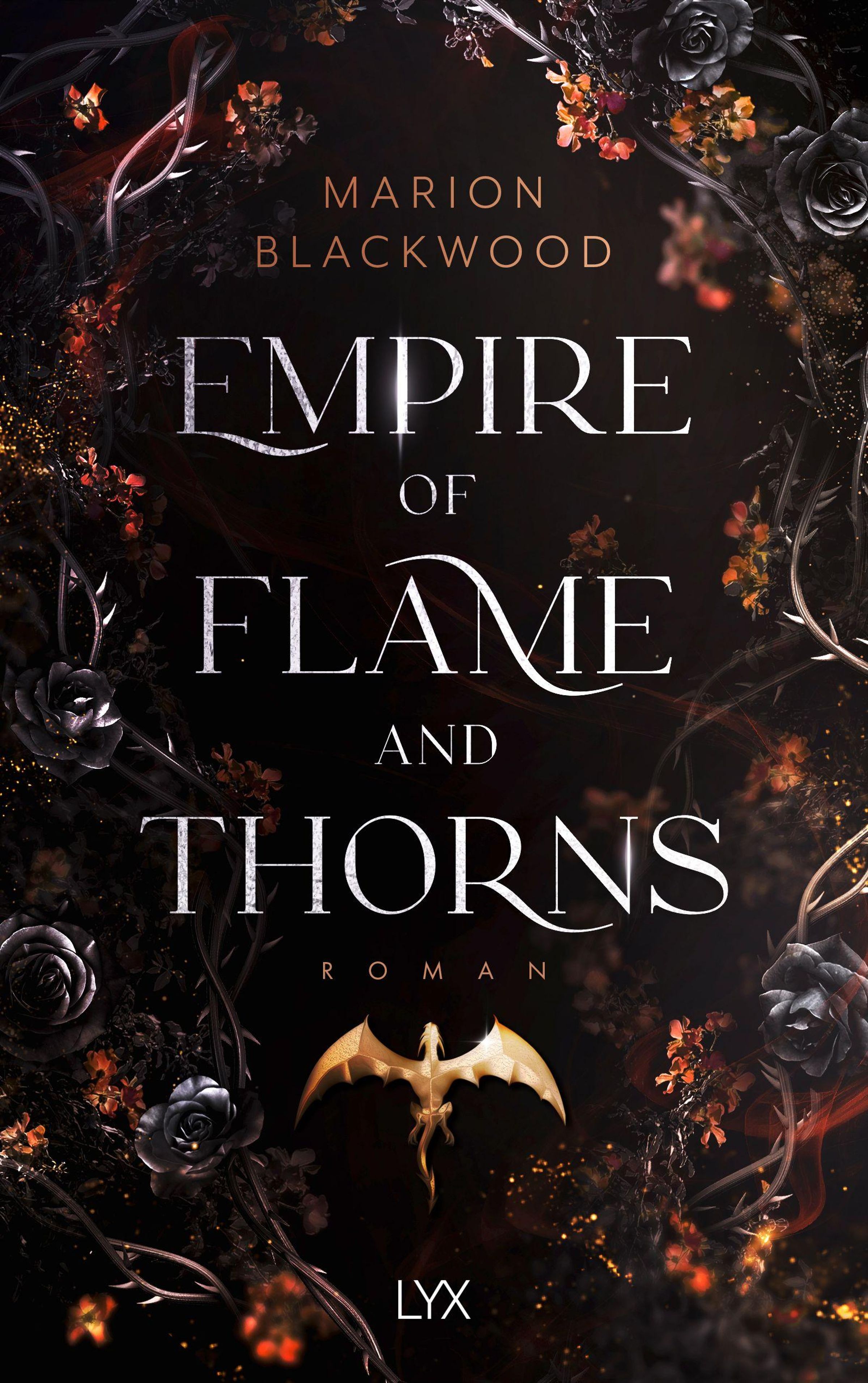 "Empire of Flame and Thorns", Marion Blackwood, Roman. Dunkle, florale Illustration mit einem goldenen Drachen., Buch