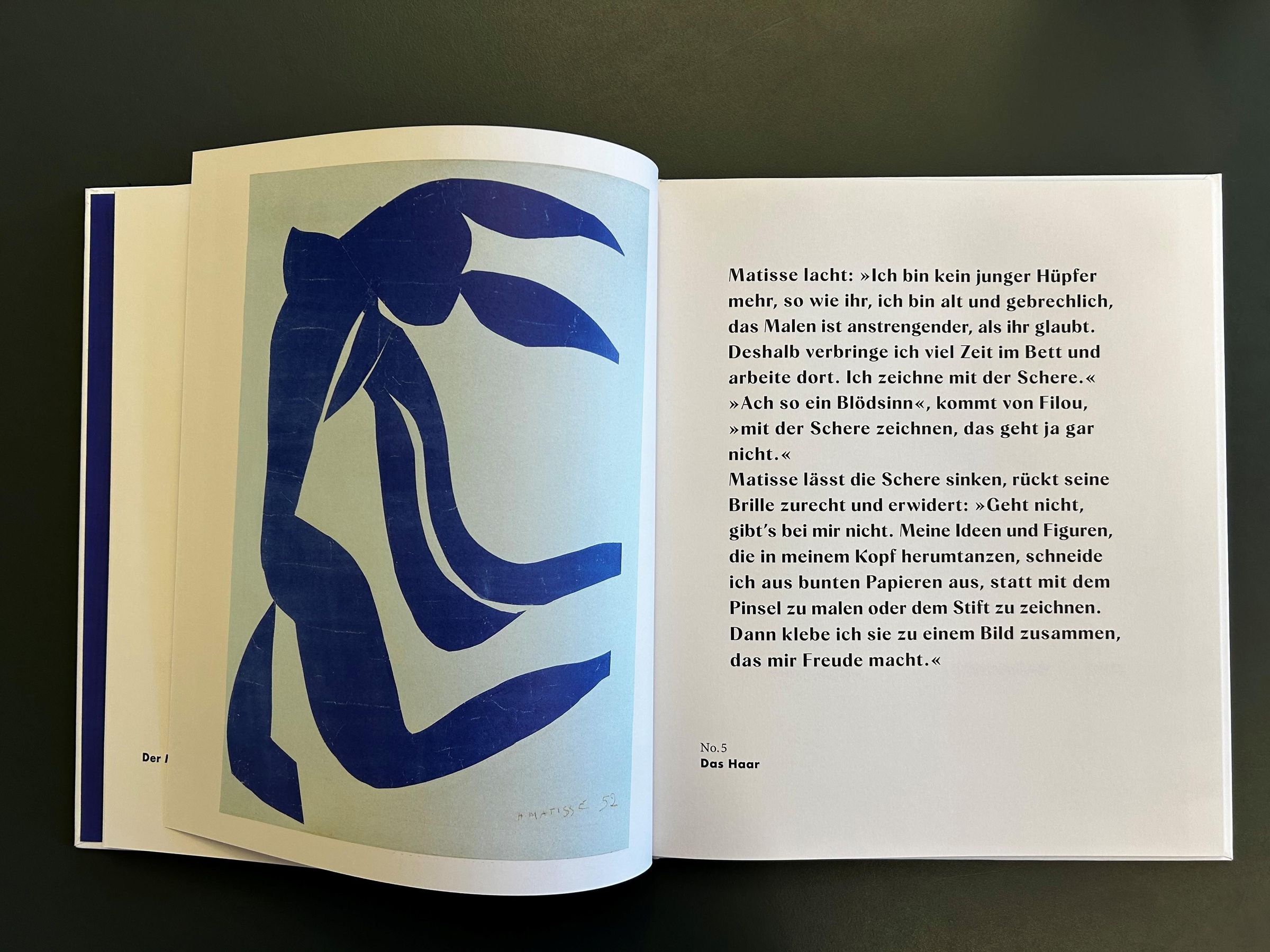 >>Das kann ich nicht, das schaffe ich nicht!<< Dies haben die beiden Tauben Filou und Fleur, die im Atelier von Henri Matisse rumflattern, nie von ihm gehört, nicht einmal, als der alte Maler im Rollstuhl saß und nicht mehr so gut arbeiten konnte. Aufgeben war für ihn keine Option, er legte die Hände nicht in den Schoß, sondern begann >>mit der Schere zu zeichnen<<, wie er es nannte.