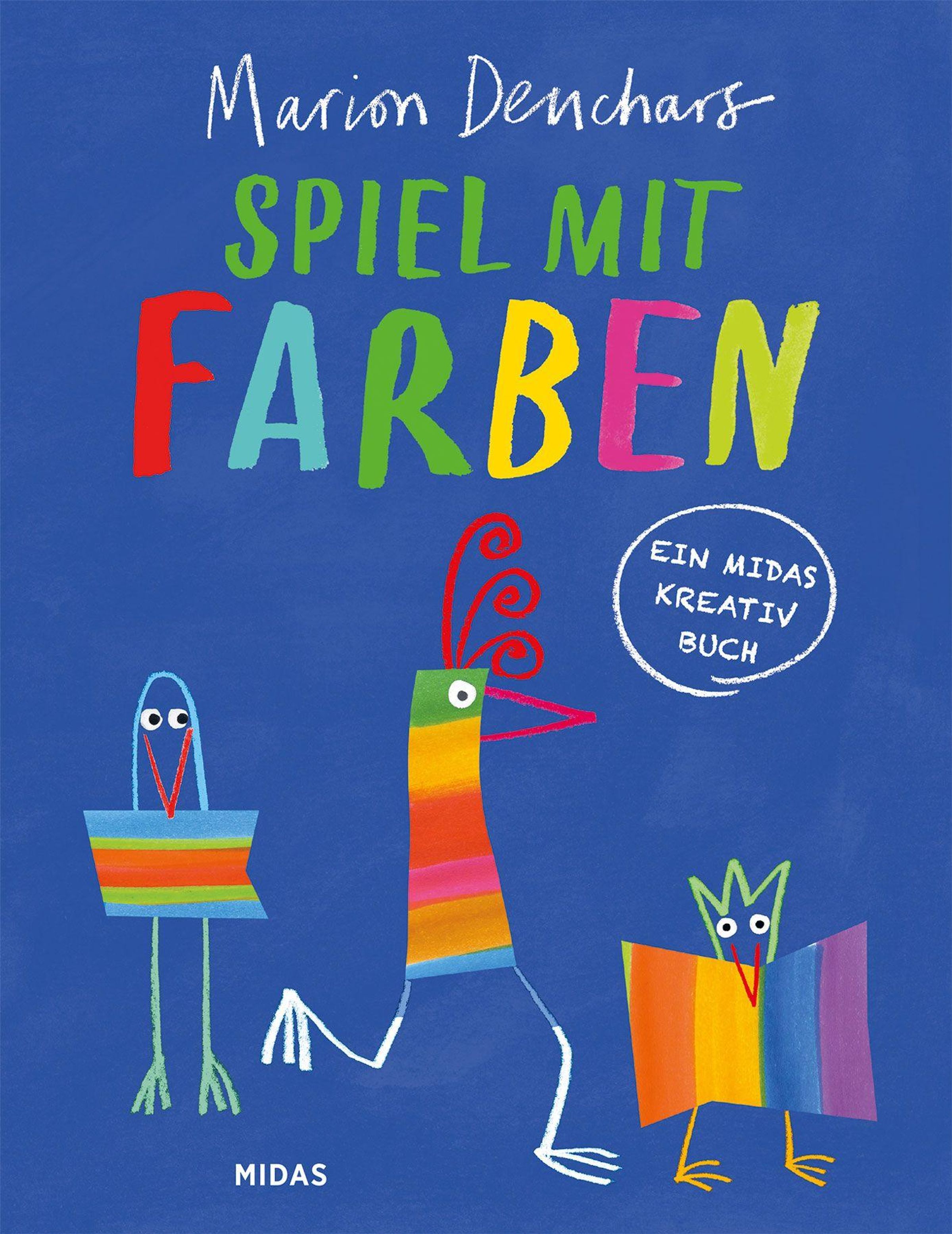 "Marion Deuchars, Spiel mit Farben, Ein Midas Kreativ Buch" mit bunten, stilisierten Vogelillustrationen auf blauem Hintergrund., Buch