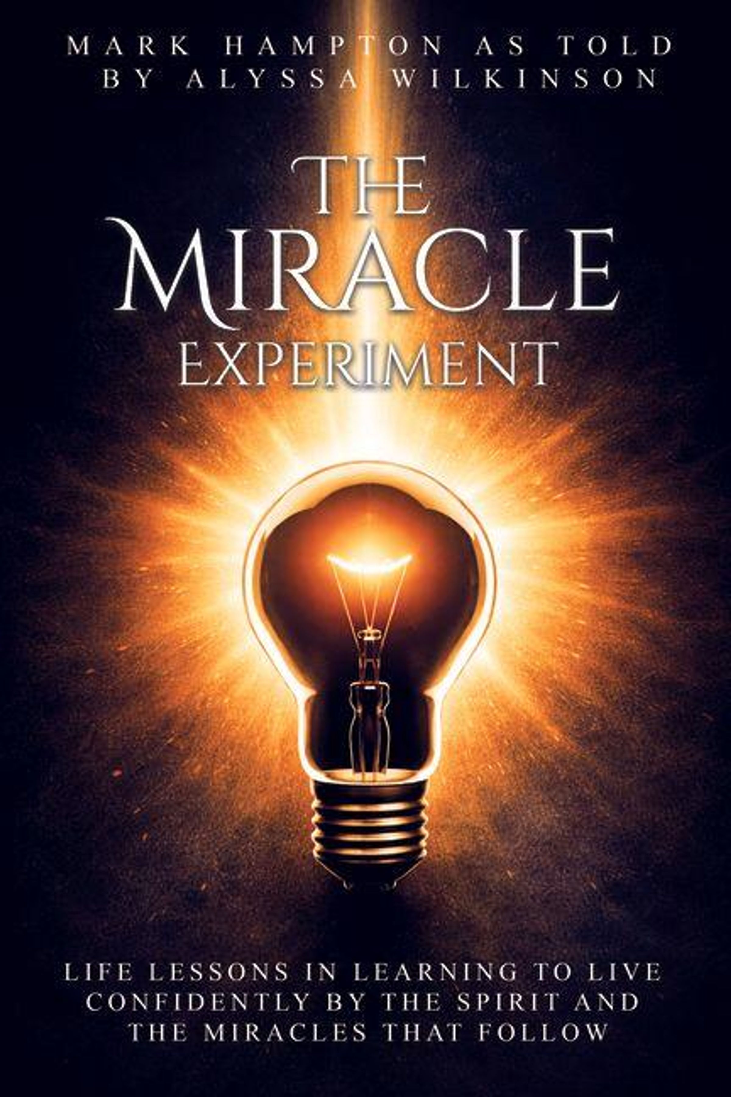 Text: "The Miracle Experiment", "Mark Hampton as told by Alyssa Wilkinson", "Life lessons in learning to live confidently...". Glühbirne leuchtet., Buch