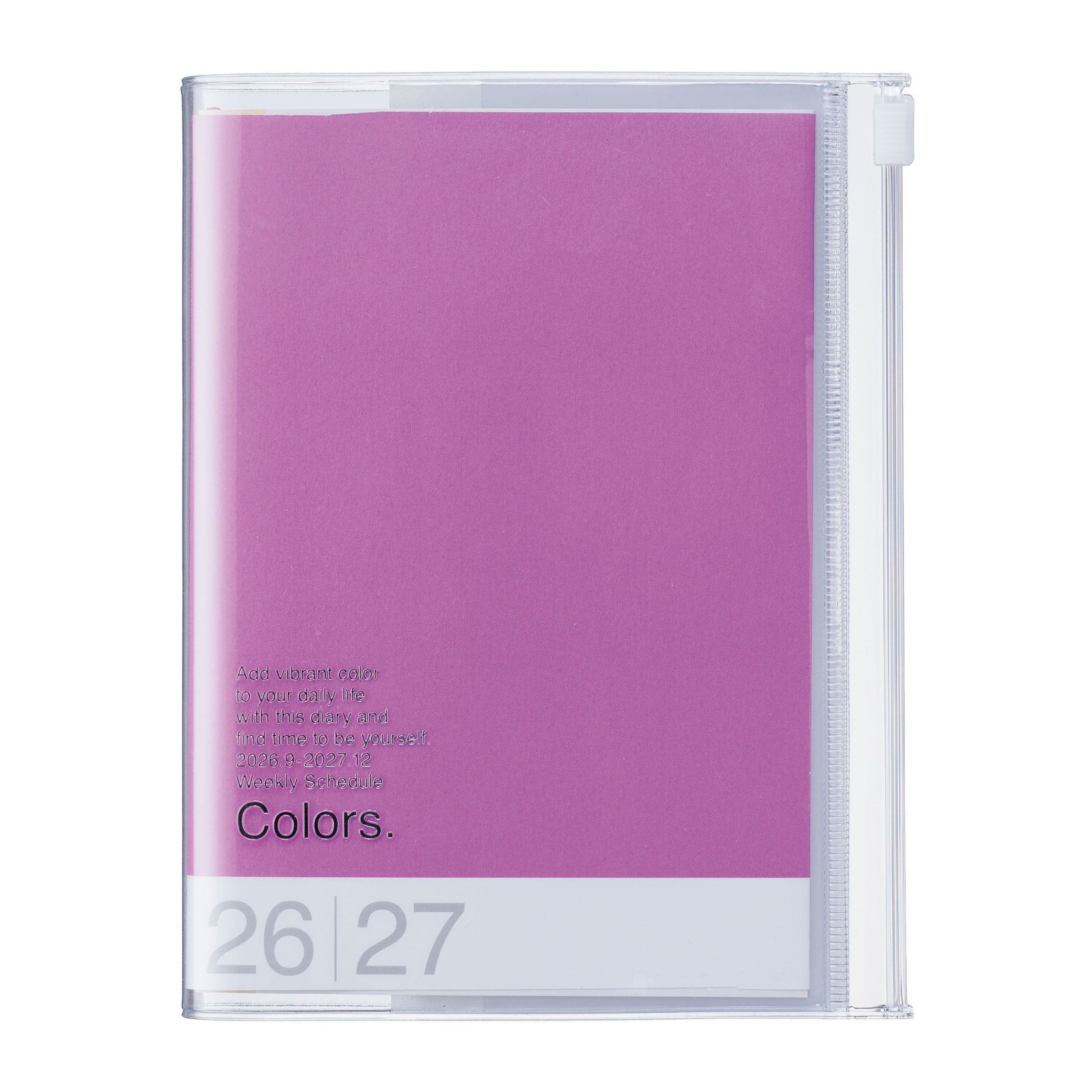 Texte: "Add vibrant color to your daily life... Colors. 26|27." Lila Heft in durchsichtiger Hülle., Buch