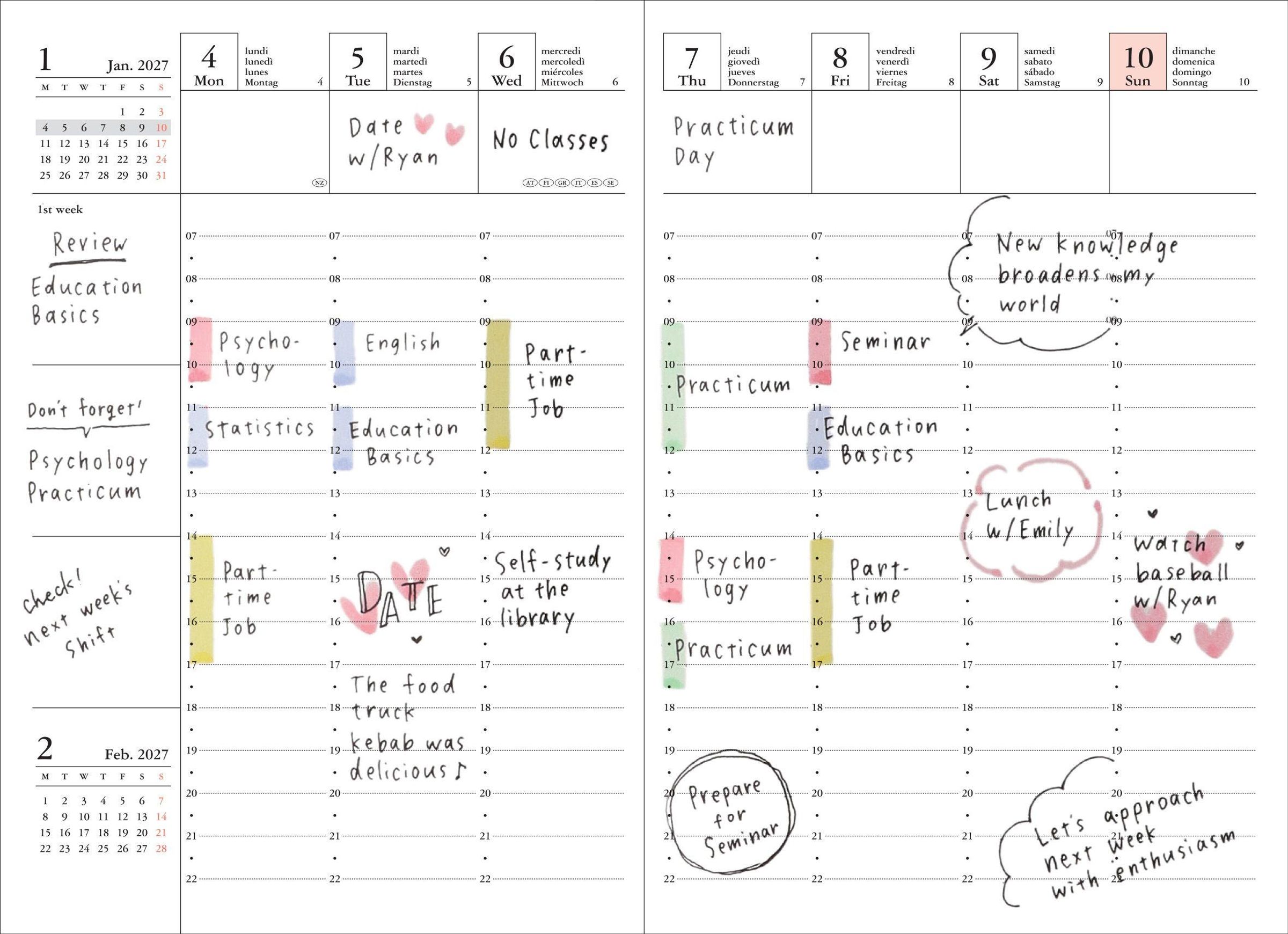 Internationaler Kalender (FSC-zertifiziertes Papier) in A6 mit patentierter Zipp-Reißverschluss-Hülle, in der sich z. B. Stifte, Tickets, Mobiltelefone praktisch verstauen lassen. Der Touchscreen von Smartphones kann durch die PVC-Hülle (aus Phthalatfreiem PVC) von außen bedient werden. Kalendarium mit 16 Monaten, beginnend mit September 2026. Internationale und deutsche Feiertage. Eine Doppelseite zum Planen pro Woche, monatliche Übersichten.