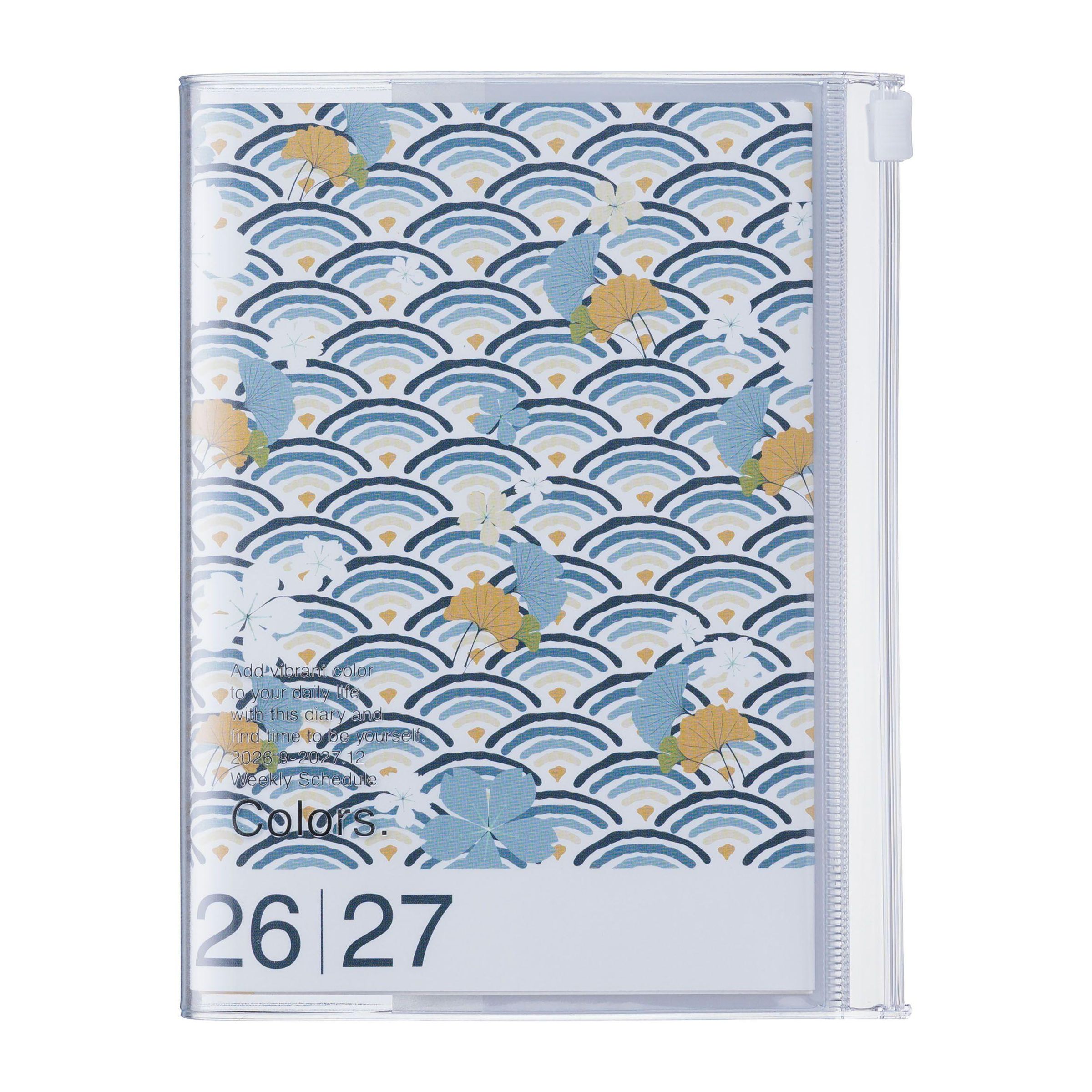 Text „Colors. 26|27“. Wellenmuster mit bunten Blättern in Blau und Gelb. Transparente Hülle., Buch