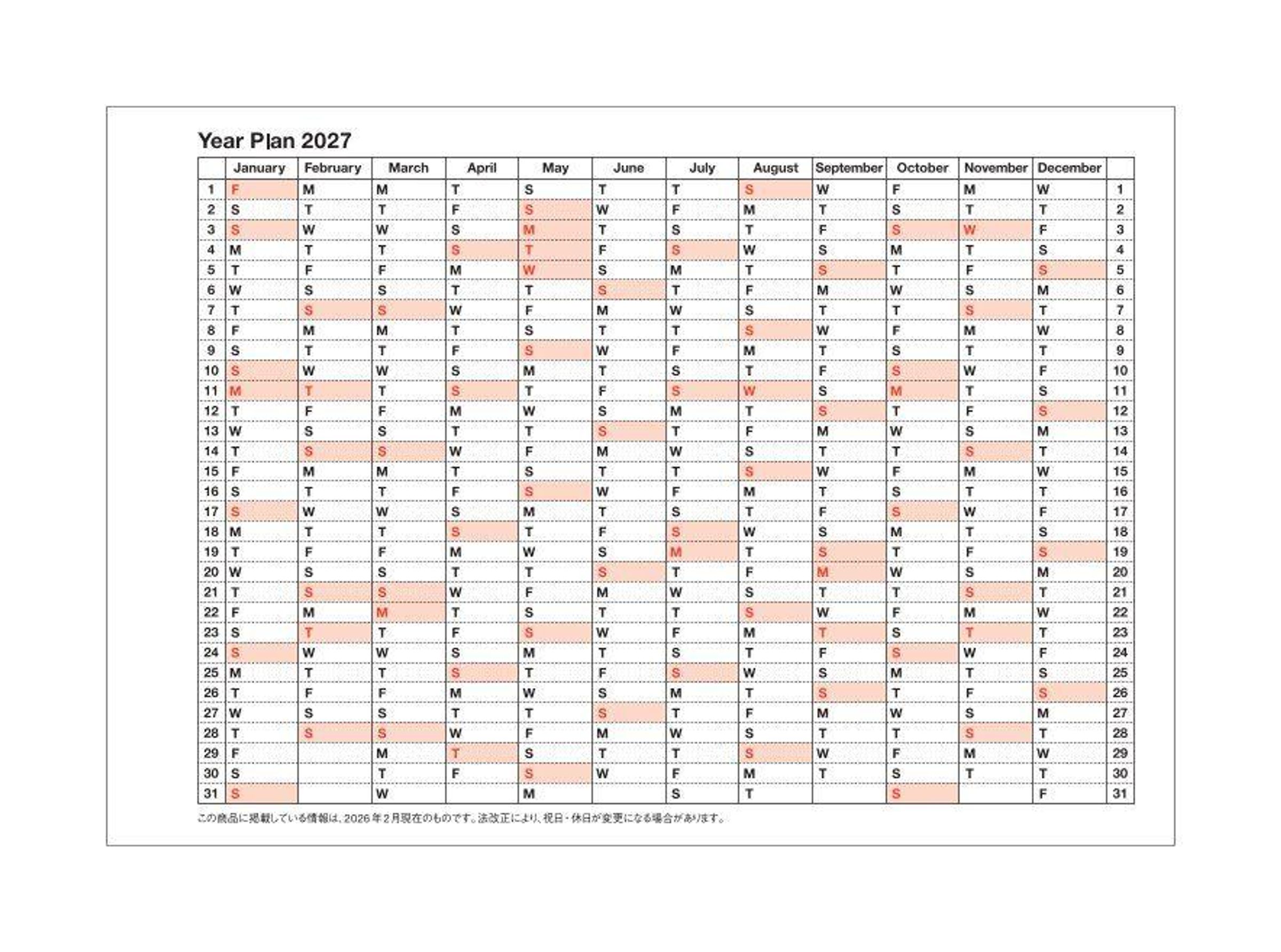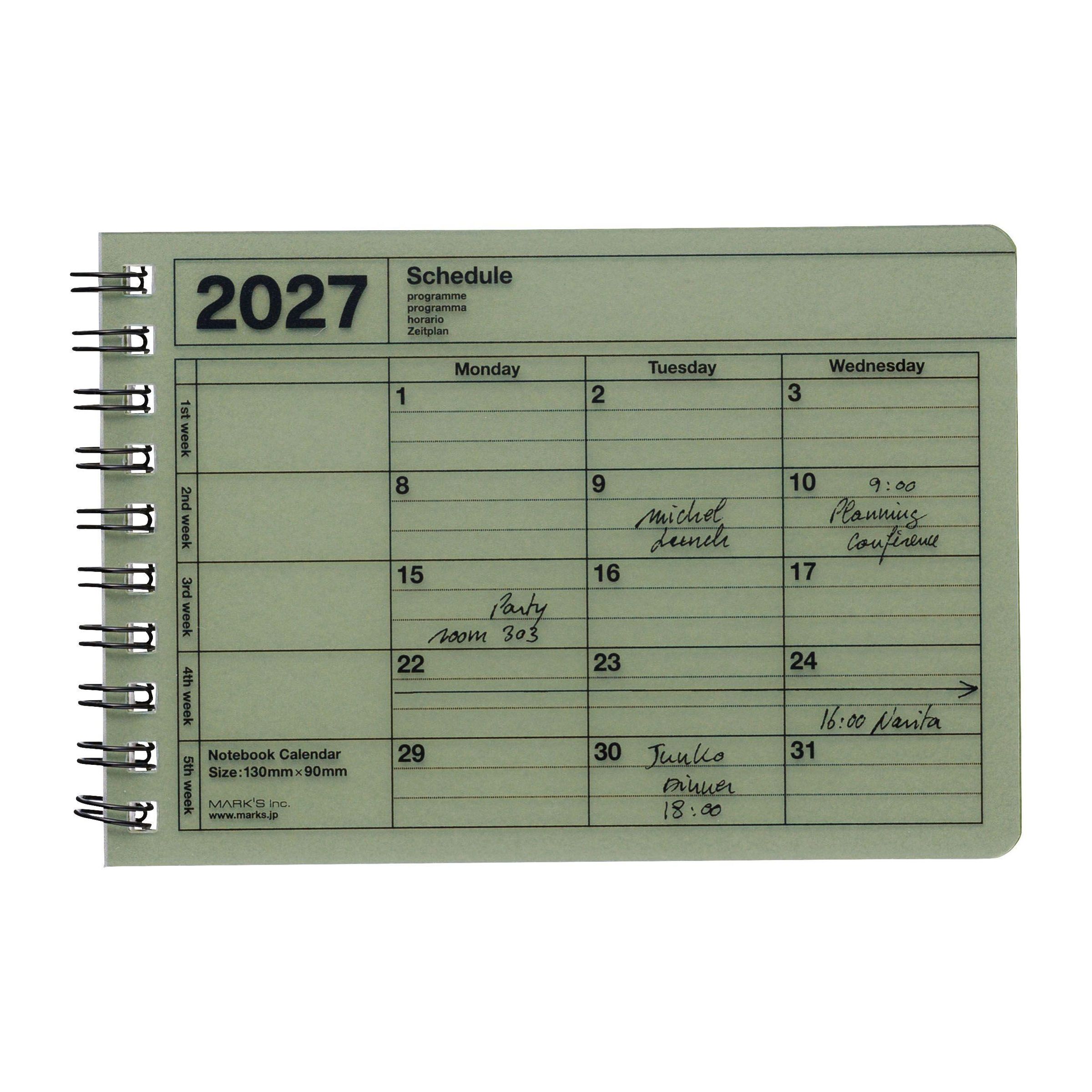2027 Schedule, Montag bis Mittwoch. Notizen: "Michel", "Party room 303", "Junko Dinner 18:00", "16:00 Narita". Spiralbindung., Kalender