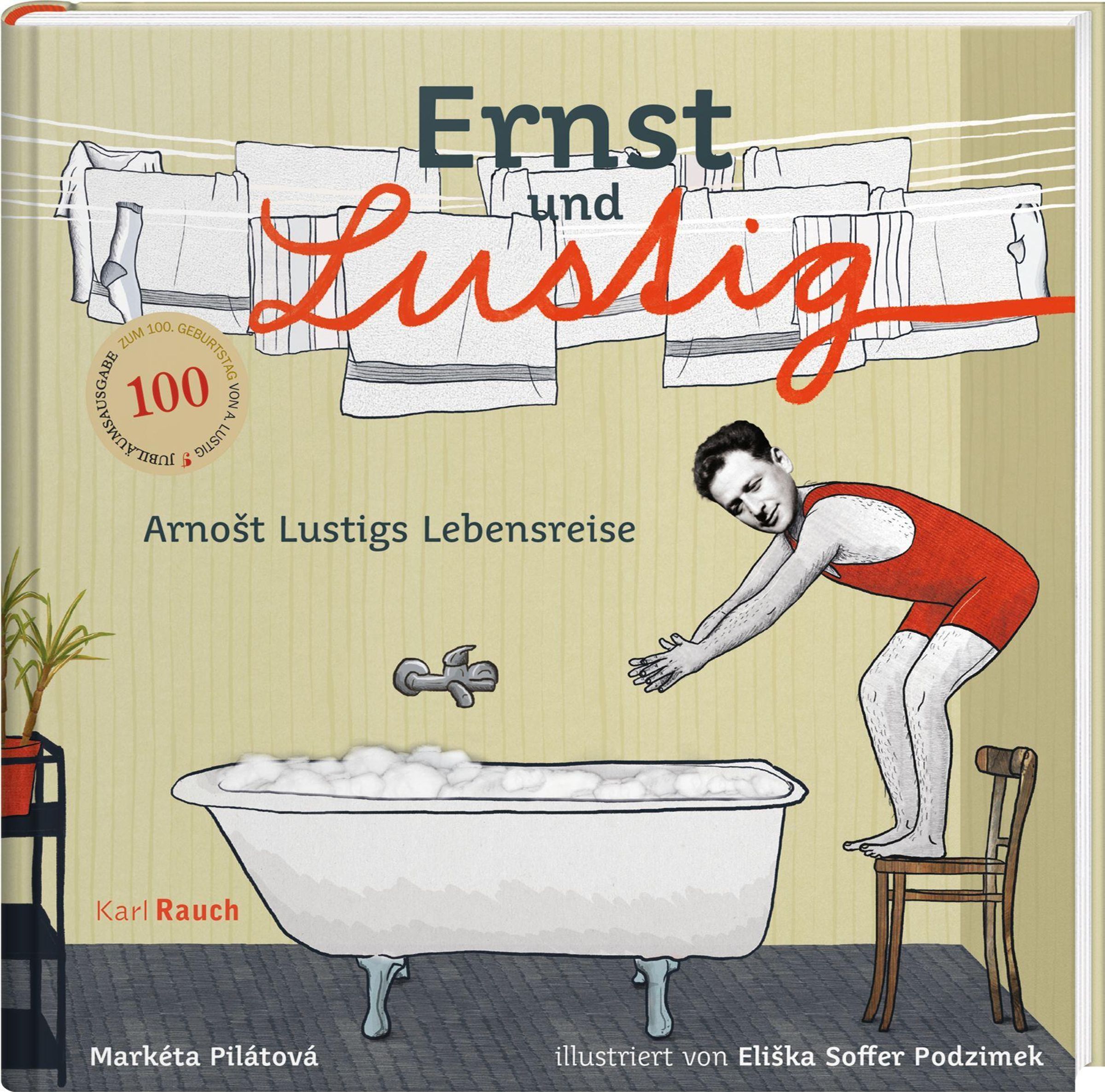 „Ernst und Lustig“, „Arnošt Lustigs Lebensreise“. Ein Mann in rotem Badeanzug beugt sich über eine Badewanne., Buch