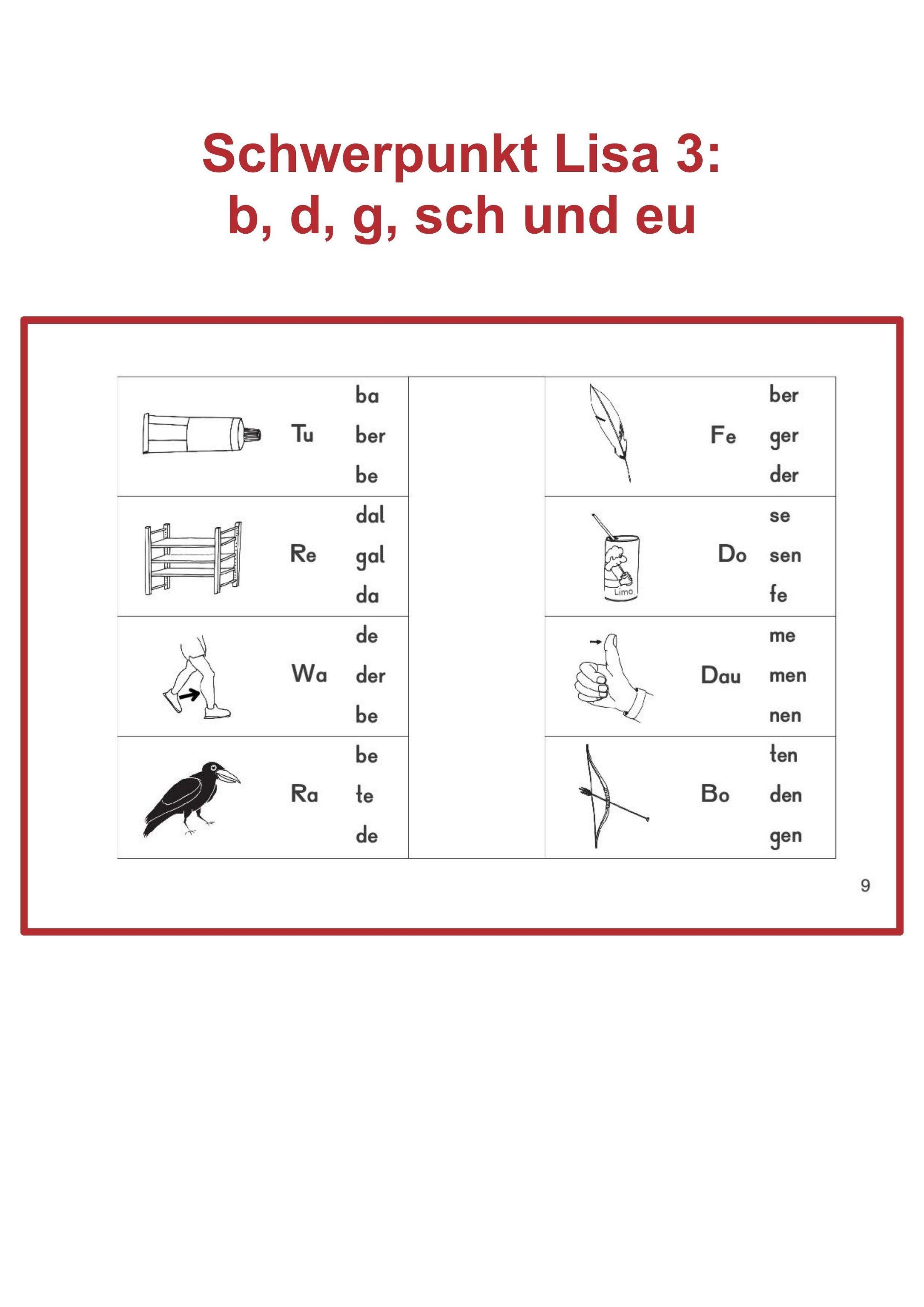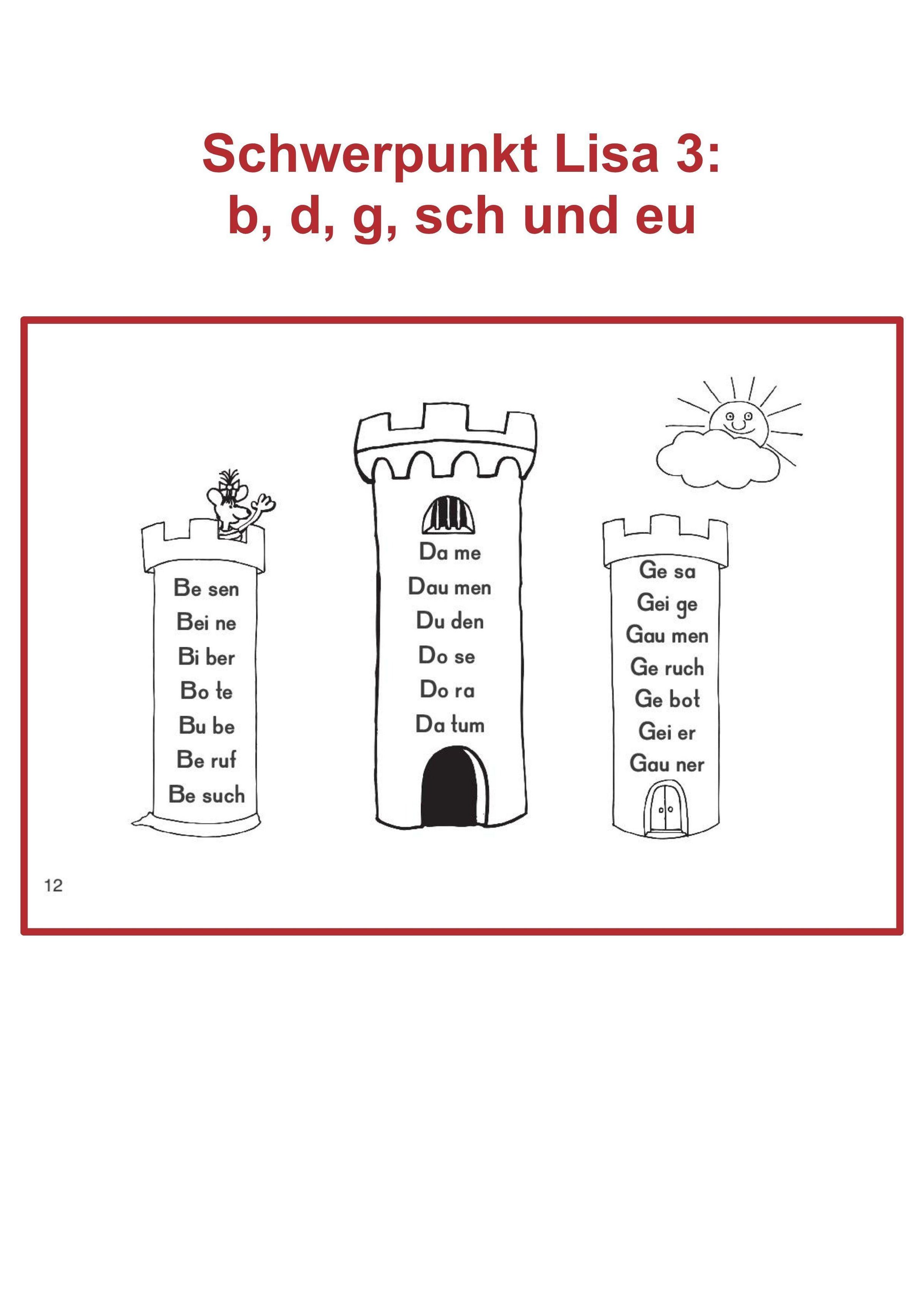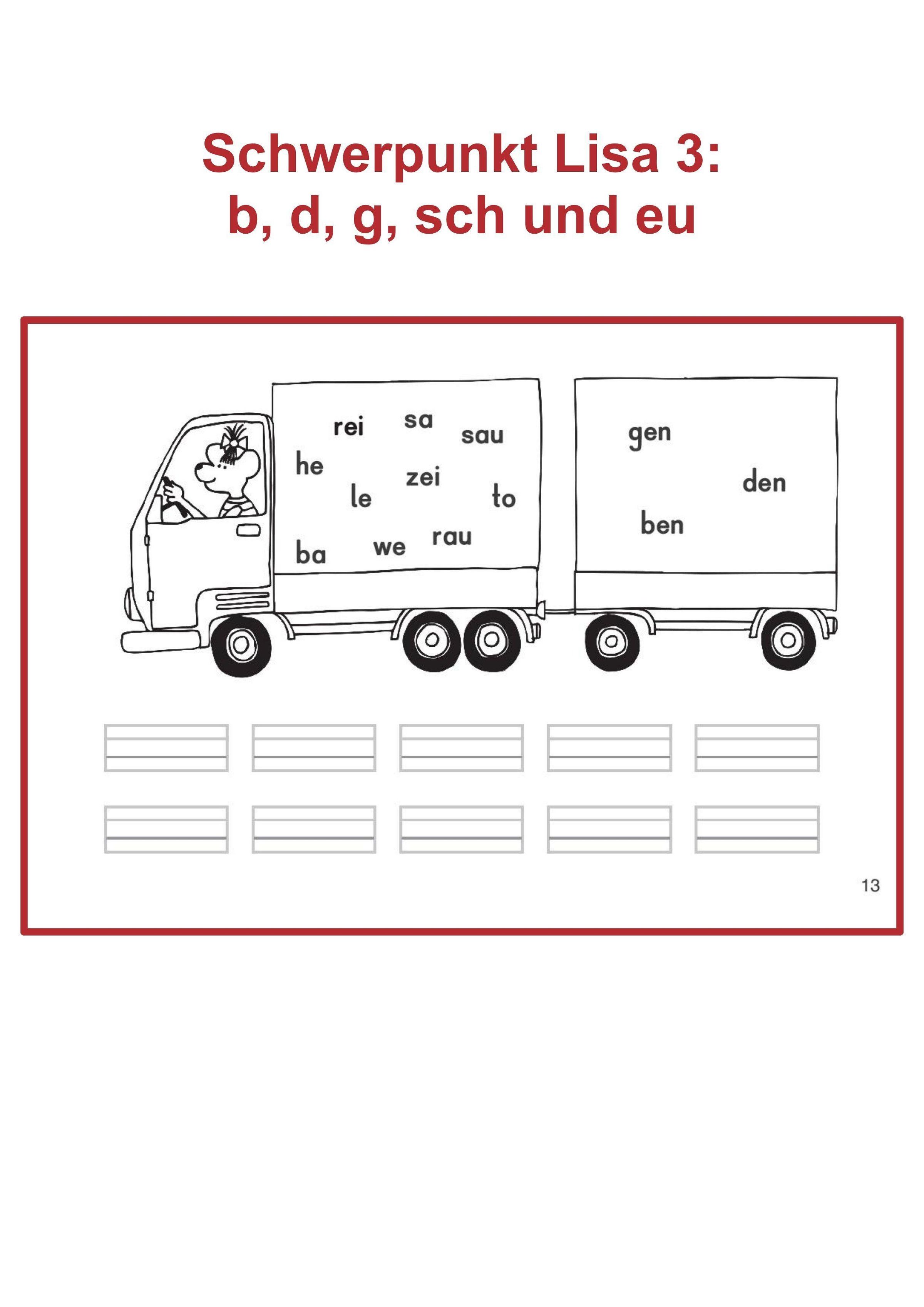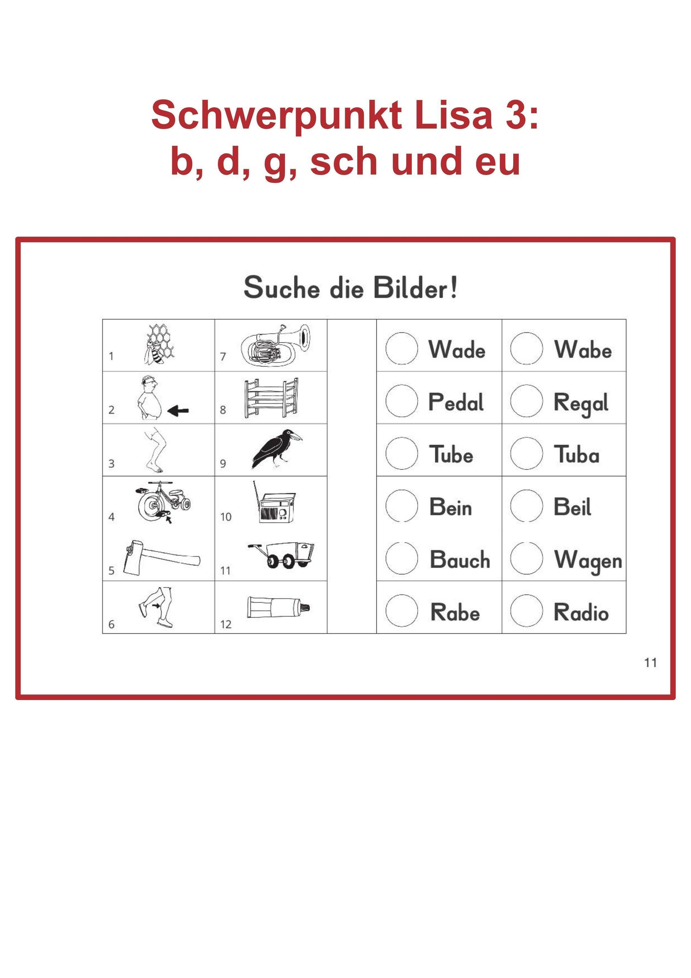 "Lesen mit Lisa 3" ist das dritte Arbeitsheft der Reihe. Während die ersten beiden Hefte primär auf Silben- und Wortebene arbeiten, gibt es hier einen steigenden Anteil von Sätzen und kurzen Texten. So werden die Kinder langsam an das flüssige Lesen herangeführt. Folgende Inhaltewerden schwerpunktmäßig bearbeitet: b, d, g, sch und eu
