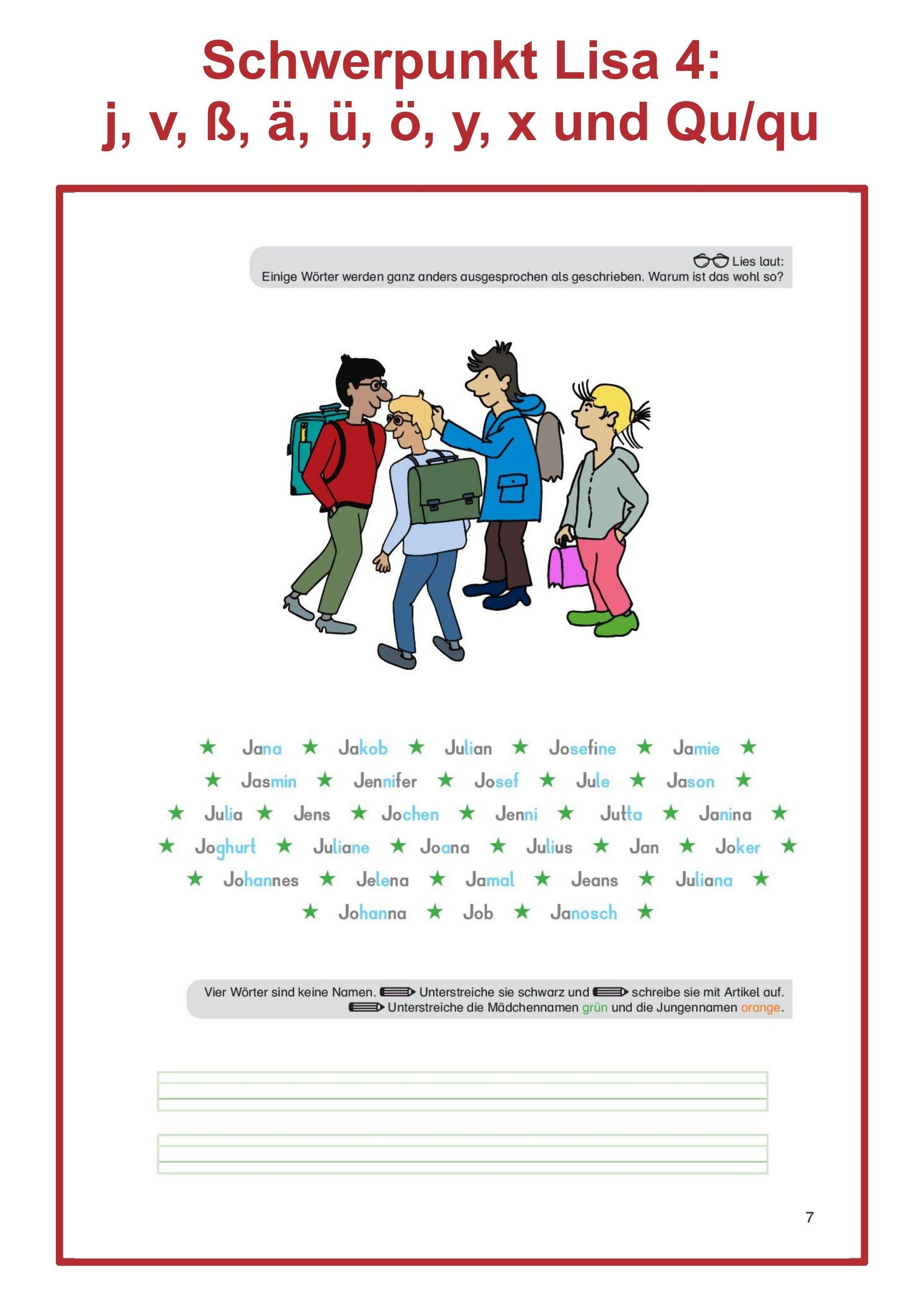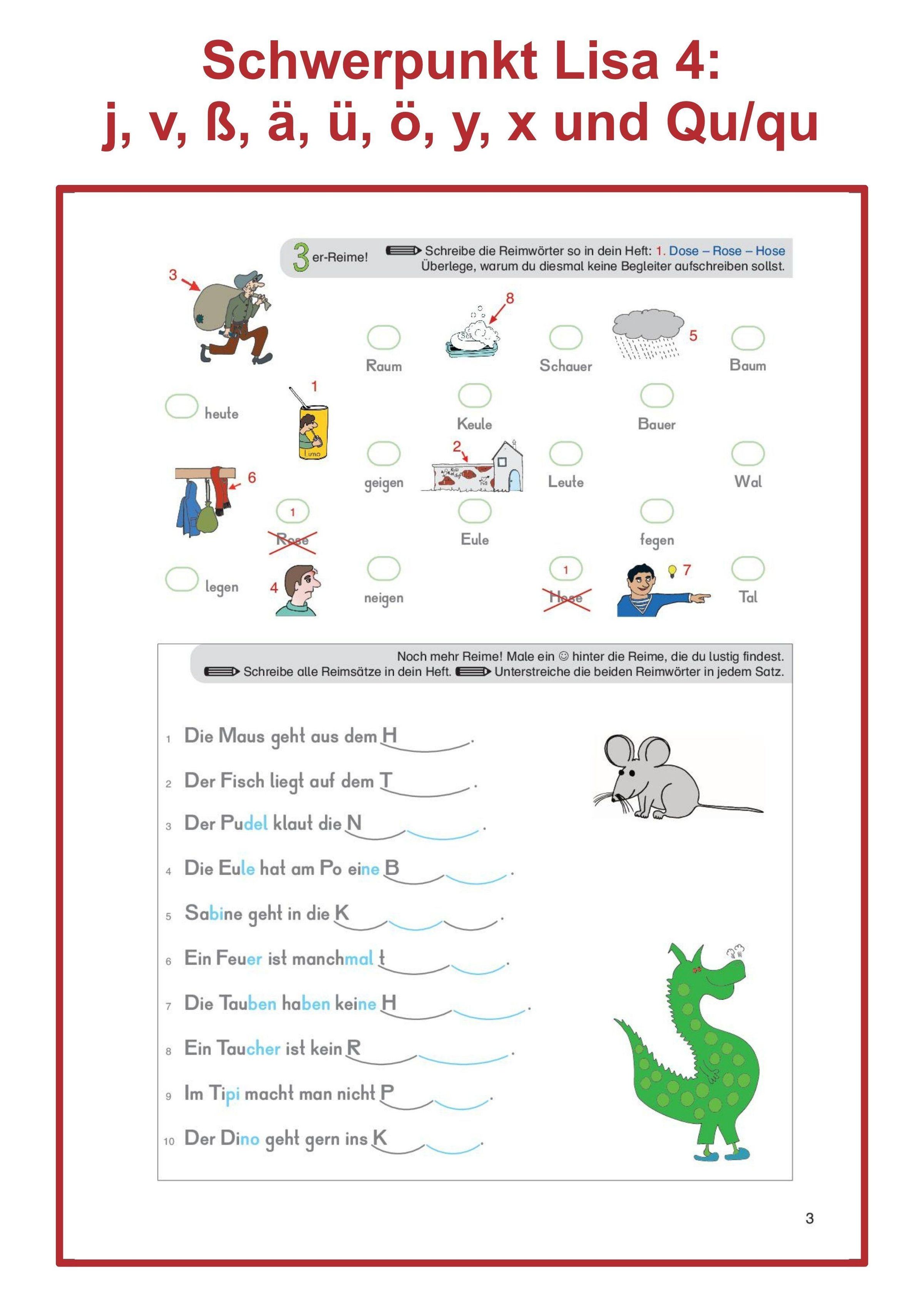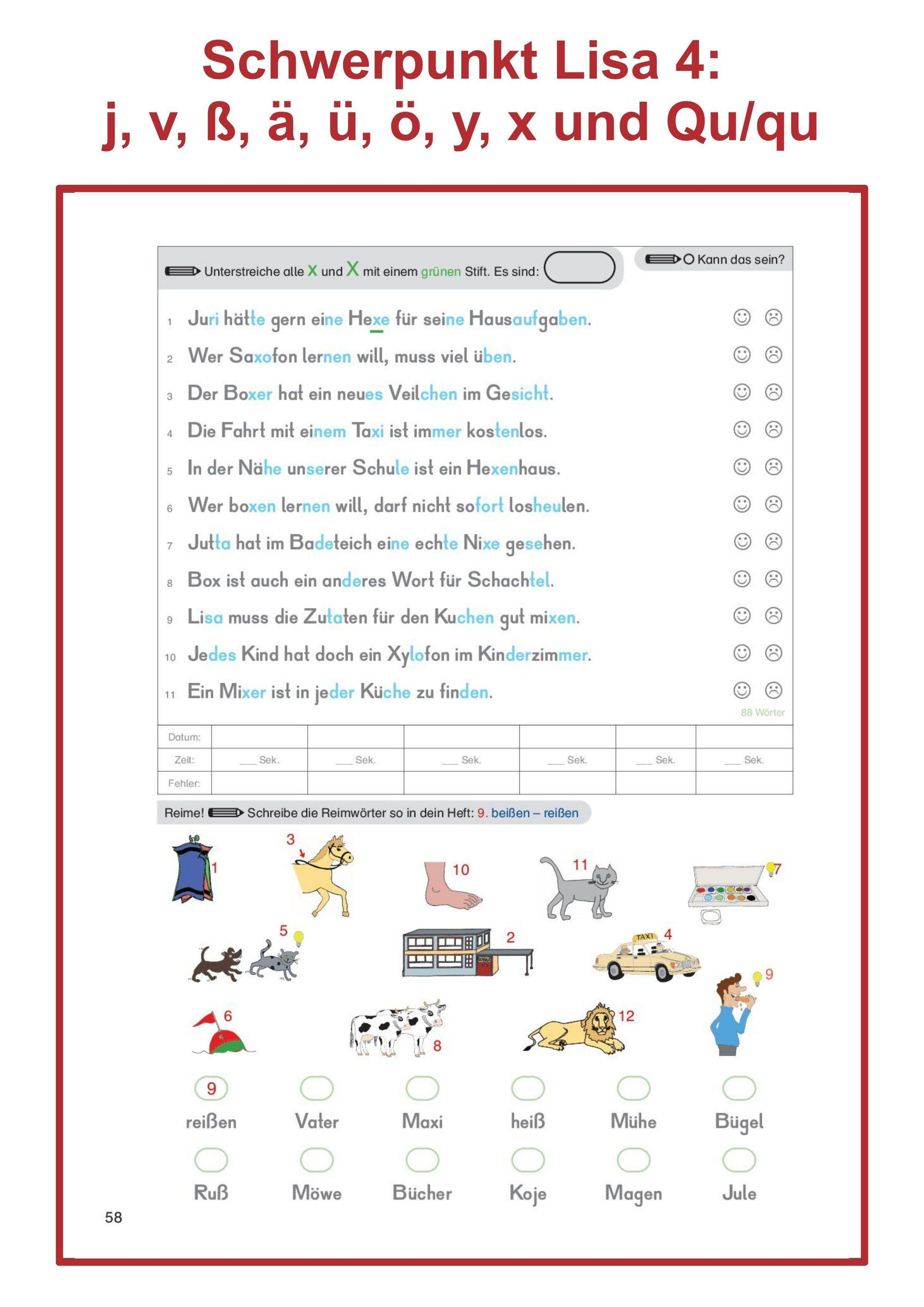 Heft 4 der Reihe "Trainieren mit Lisa" legt den Fokus auf: j, v, ß, ä, ü, ö, y, x und Qu / qu. Außerdem sind Übungen zu Vorsilben und zum ck enthalten.