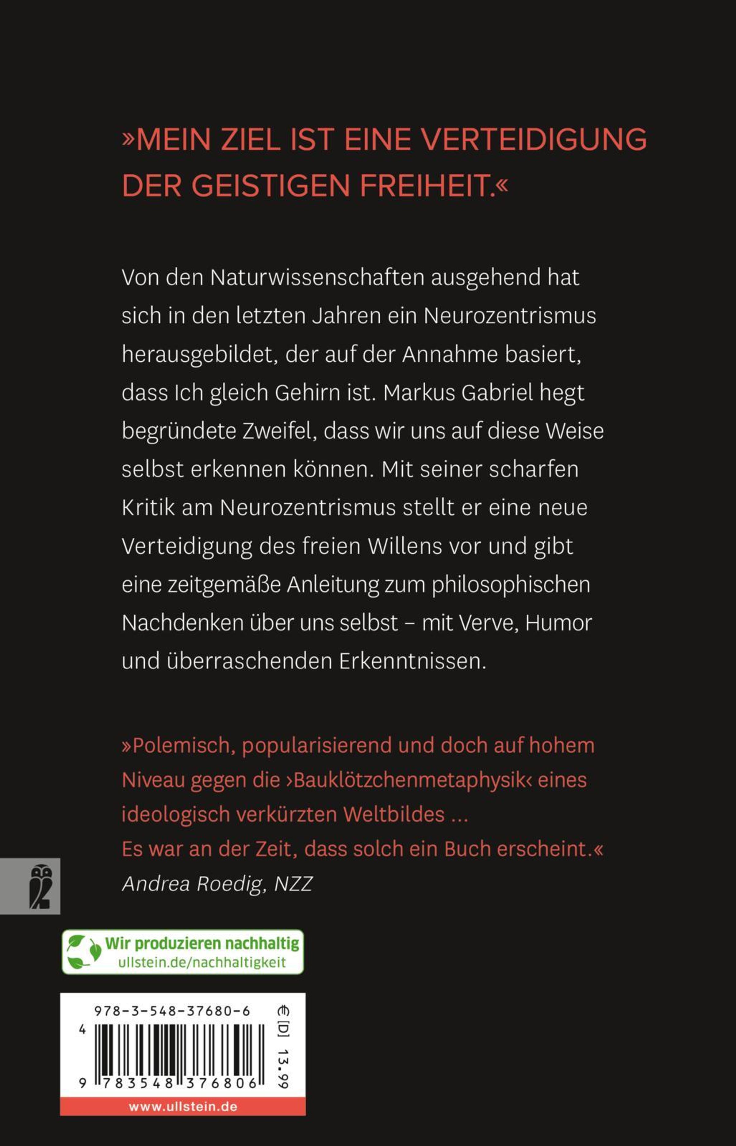 'Mein Ziel ist eine Verteidigung der geistigen Freiheit.' Von den Naturwissenschaften ausgehend hat sich in den letzten Jahren ein Neurozentrismus herausgebildet, der auf der Annahme basiert, dass Ich gleich Gehirn ist. Markus Gabriel hegt begründete Zweifel, dass wir uns auf diese Weise selbst erkennen können. Mit seiner scharfen Kritik am Neurozentrismus stellt er eine neue Verteidigung des freien Willens vor und gibt eine zeitgemäße Anleitung zum philosophischen Nachdenken über uns selbst - mit Verve, Humor und überraschenden Erkenntnissen. 'Polemisch, popularisierend und doch auf hohem Niveau gegen die ¿Bauklötzchenmetaphysik¿ eines ideologisch verkürzten Weltbildes ... Es war an der Zeit, dass solch ein Buch erscheint.' Andrea Roedig, NZZ