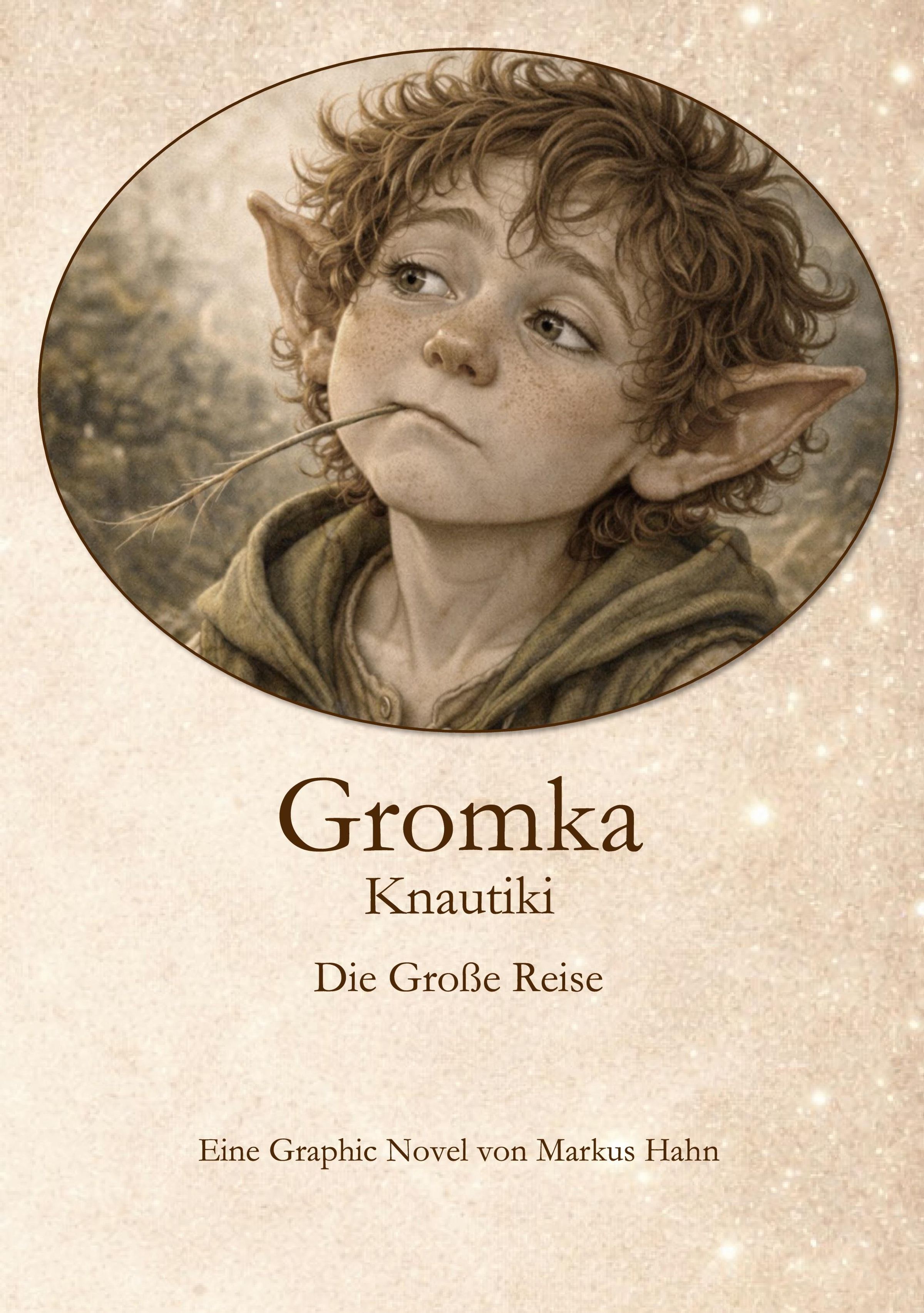 Titel: "Gromka Knautiki Die Große Reise" Eine Illustration eines Jungen mit großen Ohren und einem Grashalm im Mund., Buch